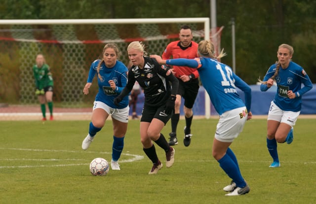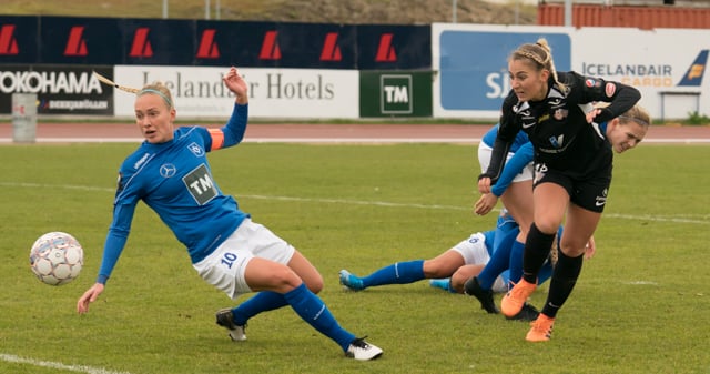 Hulda Ósk með afar laglega takta, prjónar sig framhjá tveimur varnarmönnum og á ágætis skot, en það fer framhjá.