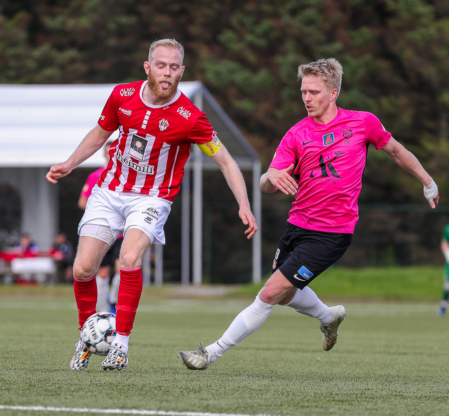 Bjarki Þór fær boltan úti hægra meginn og reynir fyrirgjöf en Hafþór Pétursson skallar boltan í burtu.