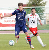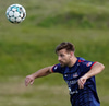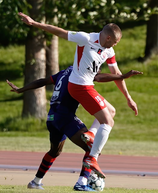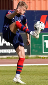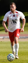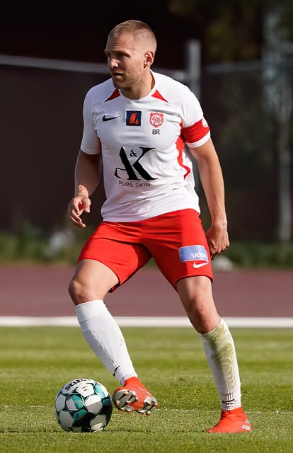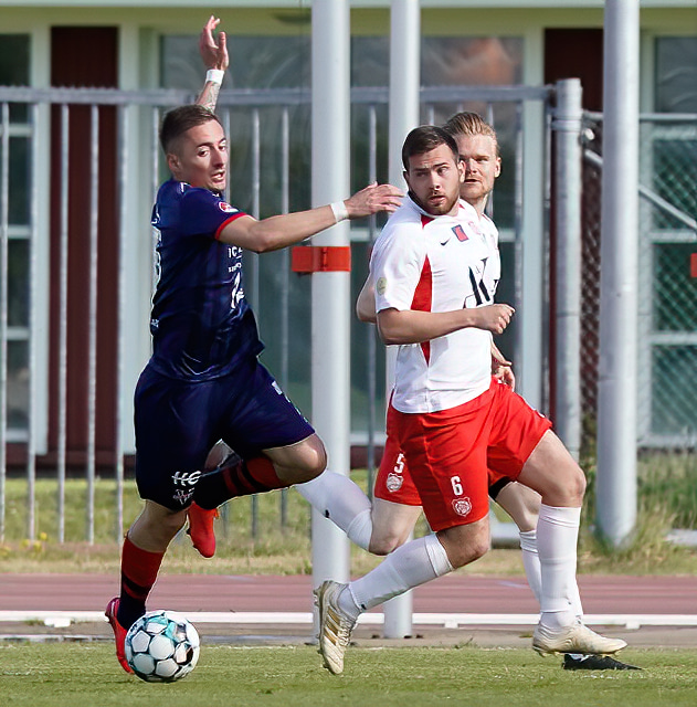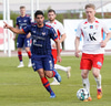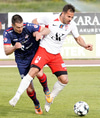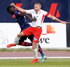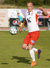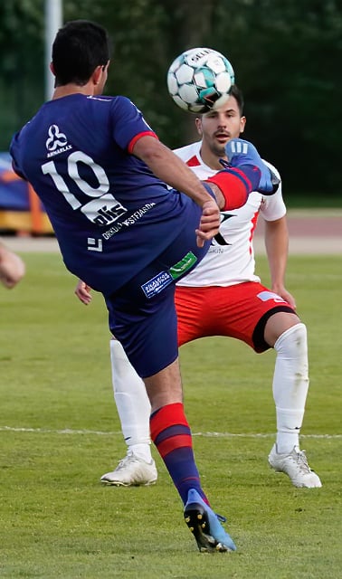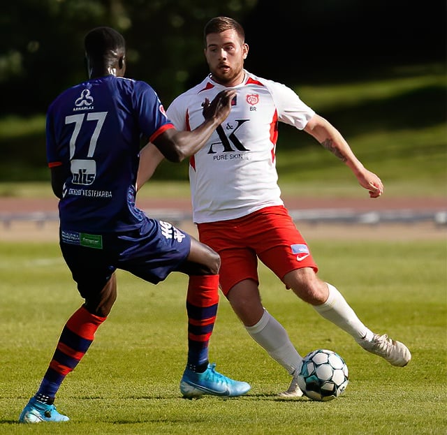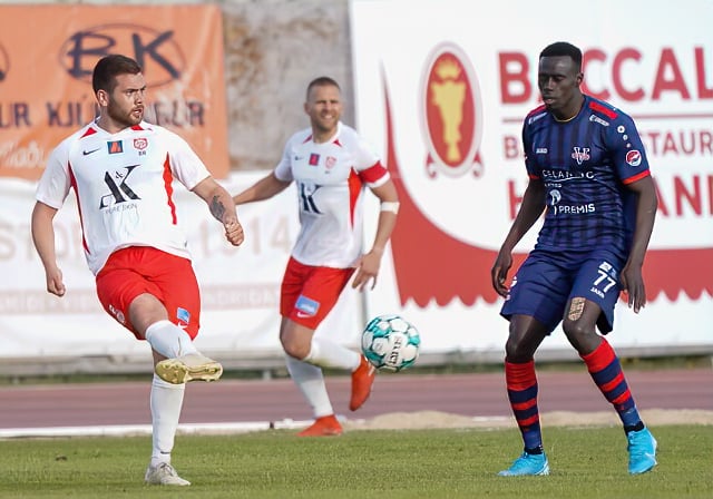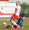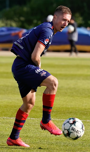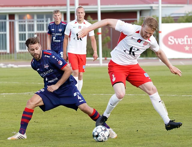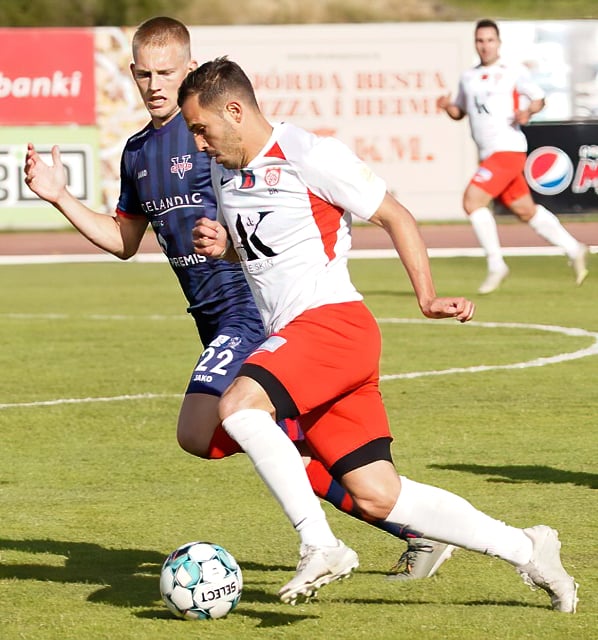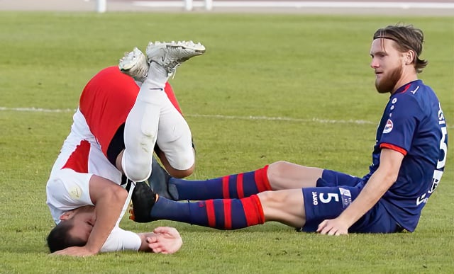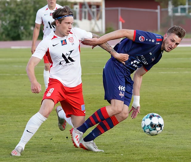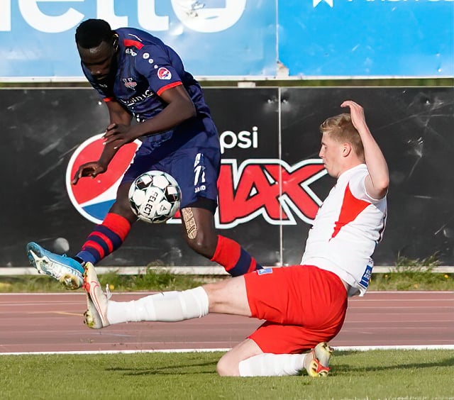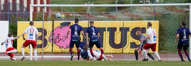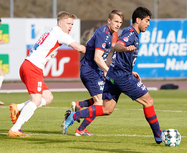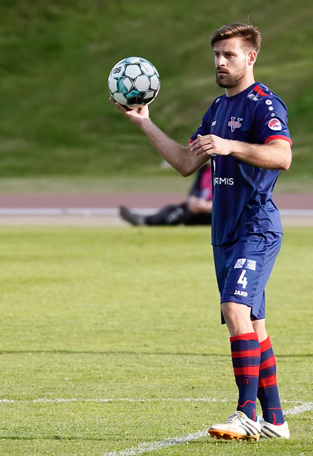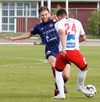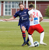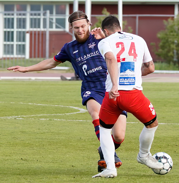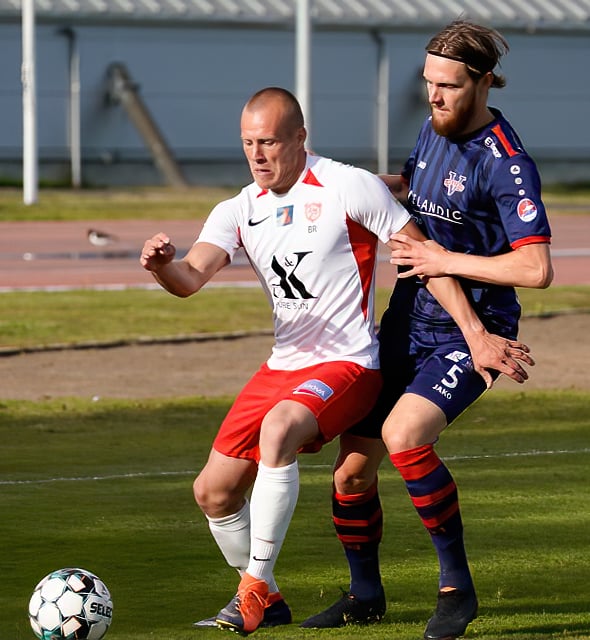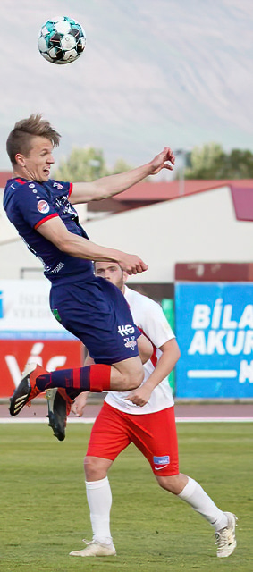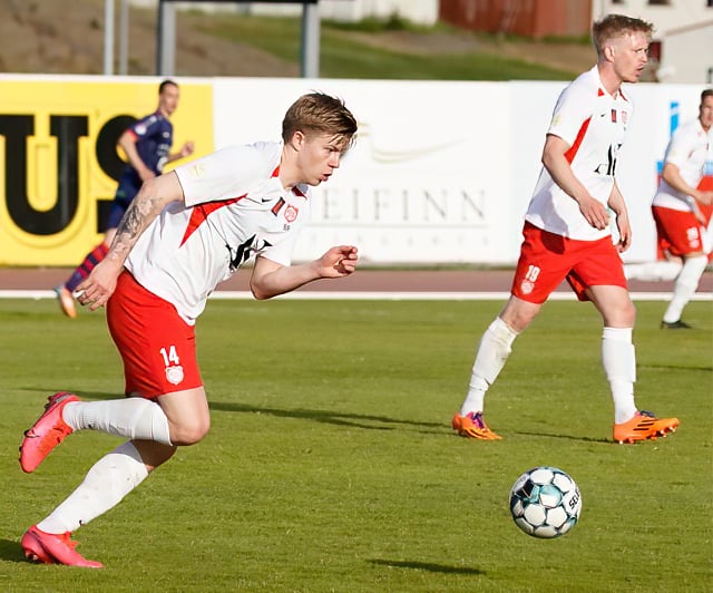 Túfa kemur á fullri ferð í Svein Elías. Túfa átti þunga snertingu inn á teignum.
