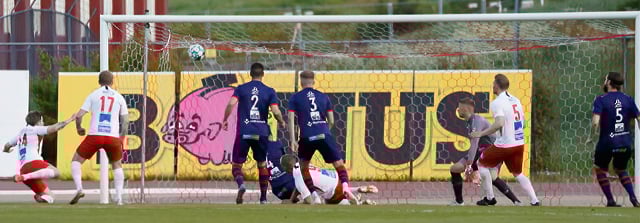 Þarna var smá hætta, sýnist það vera Nacho sem flikkar boltanum yfir, annað horn.