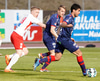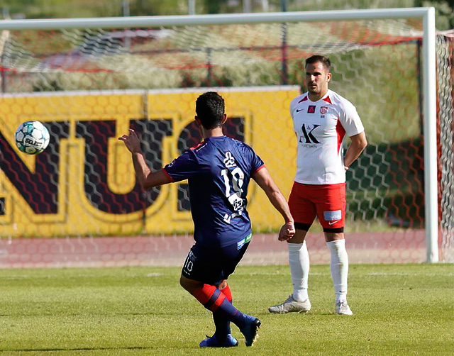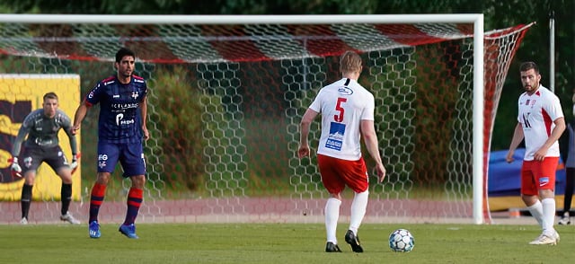 Siggi Marínó í smá brasi inn á eigin vítateig og Nacho kemst í boltann. Nacho lætur vaða en vel yfir.