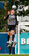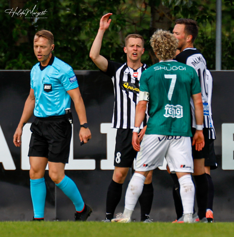 Nú er ógnin upp vinstra megin, Kristinn sendir á fjær þar sem Atli Sigurjóns á skalla sem fer í jörðina, upp í loftið og rétt framhjá fjærstönginni.