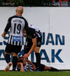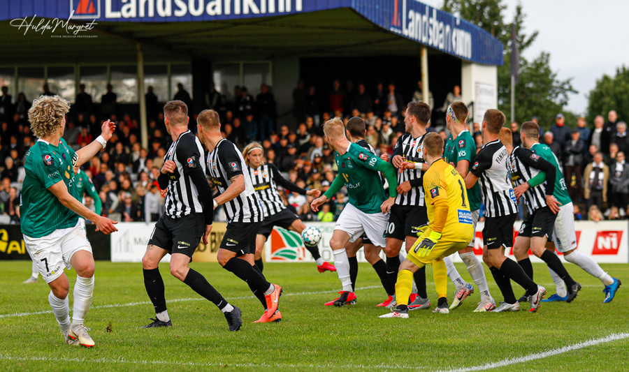 Enn sókn upp hægra megin, nú er það Finnur sem sendir inní á vítapunkt. Pabl skýtur að marki með vinstri, boltinn fer í jörðina og í fallegum boga út í fjærhorn, yfir Anton.