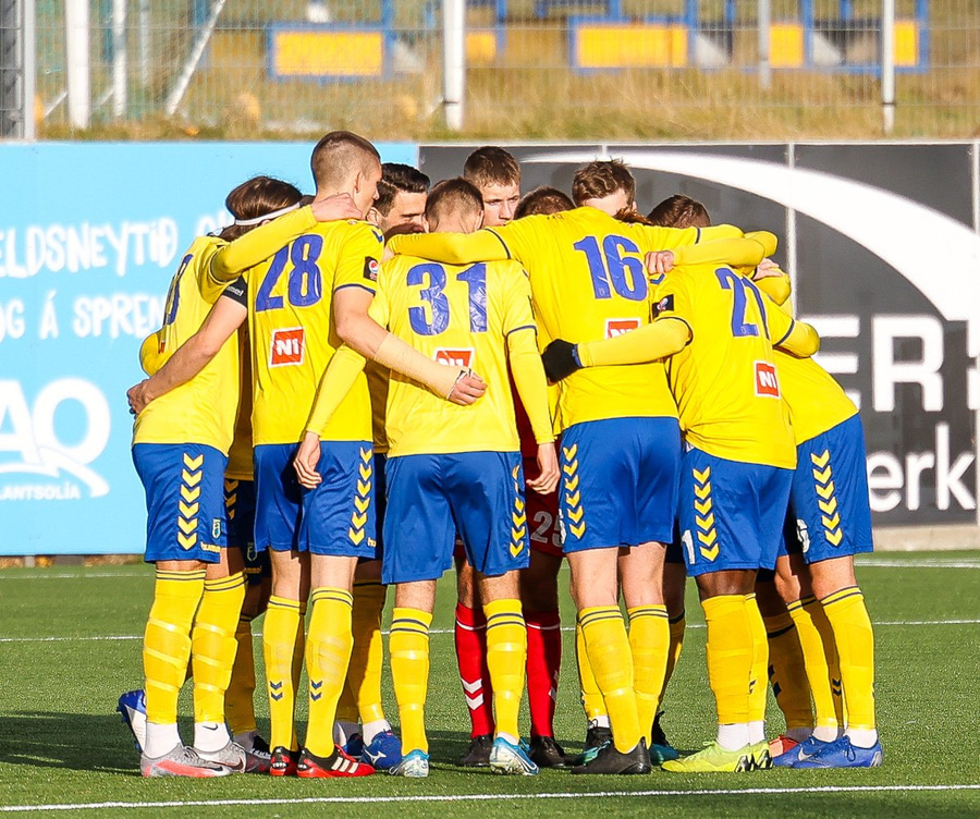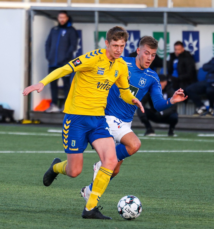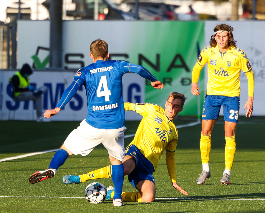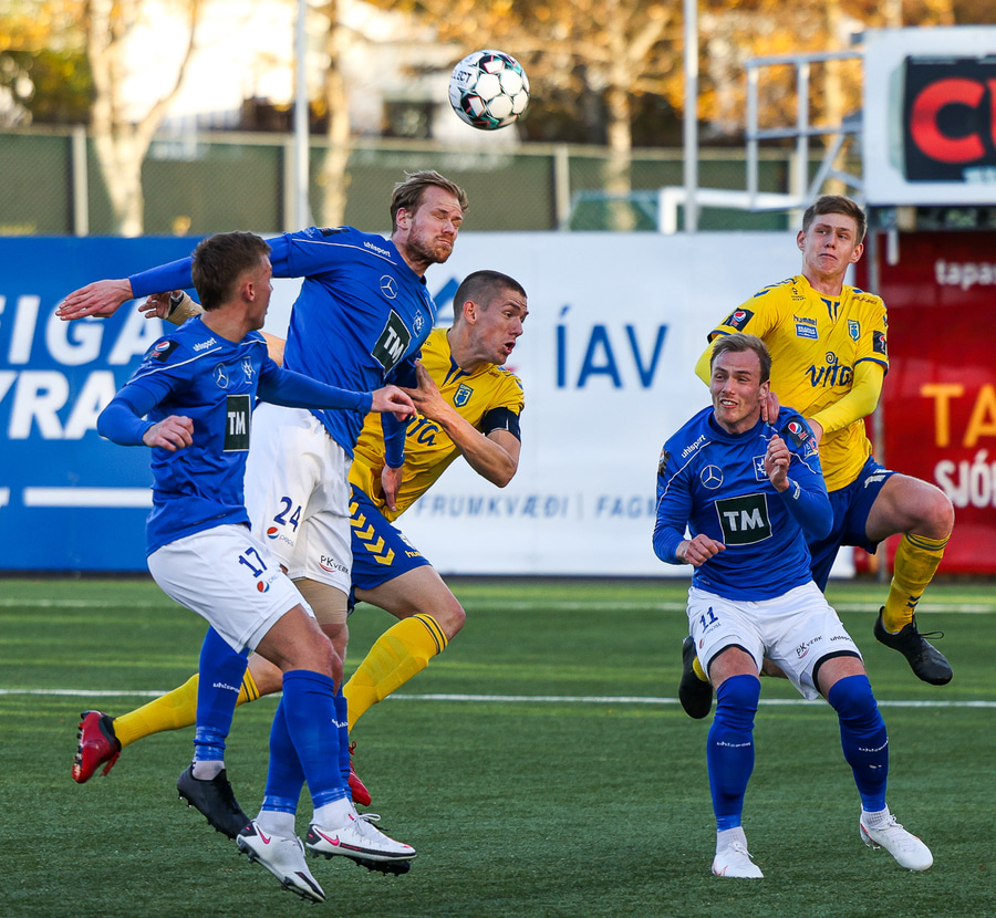 Jóhann með fasta spyrnu og Örvar keyrir Emil niður, boltinn upp í loftið og Halli grípur.
