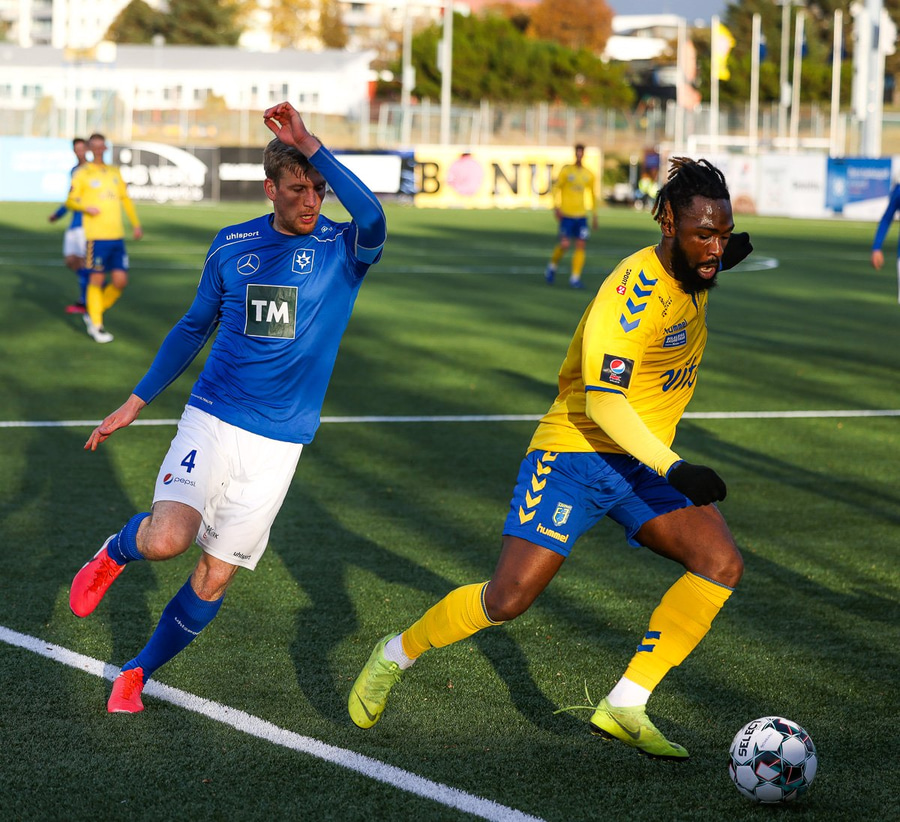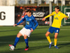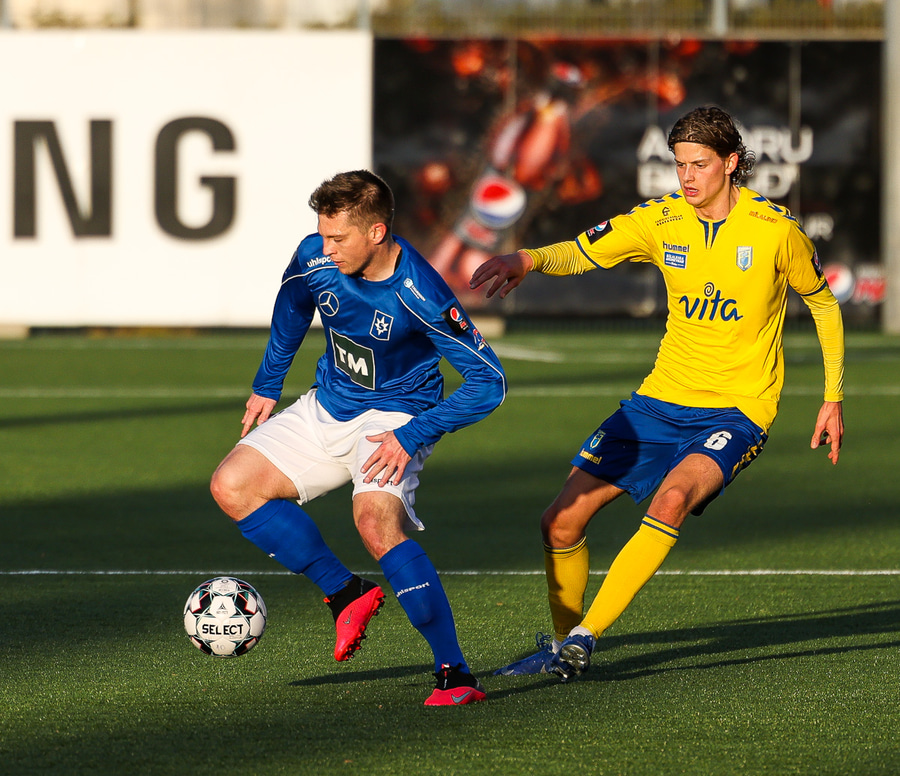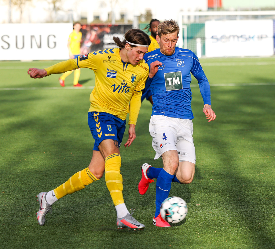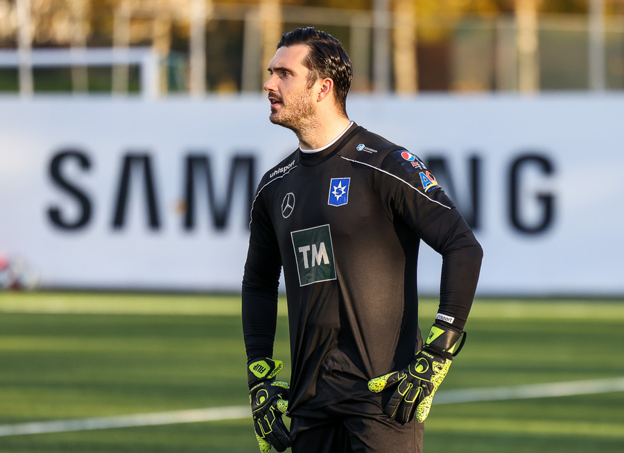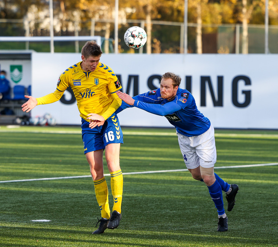 Jóhann með fasta spyrnu og Örvar keyrir Emil niður, boltinn upp í loftið og Halli grípur.