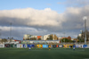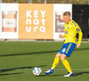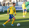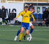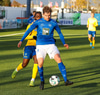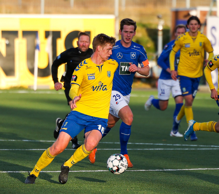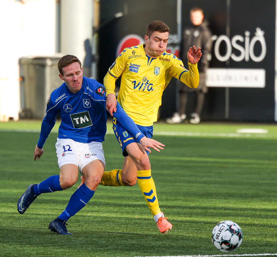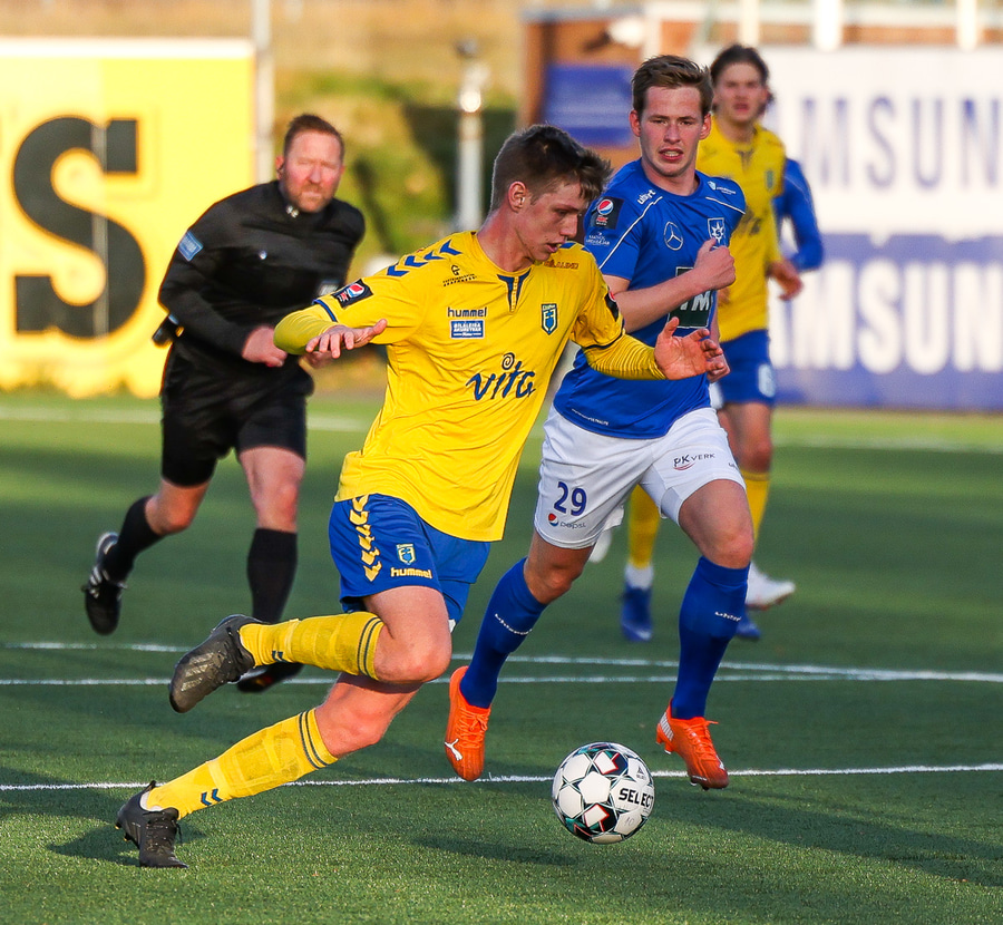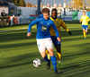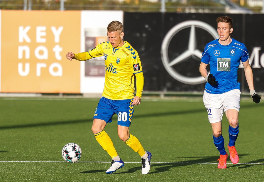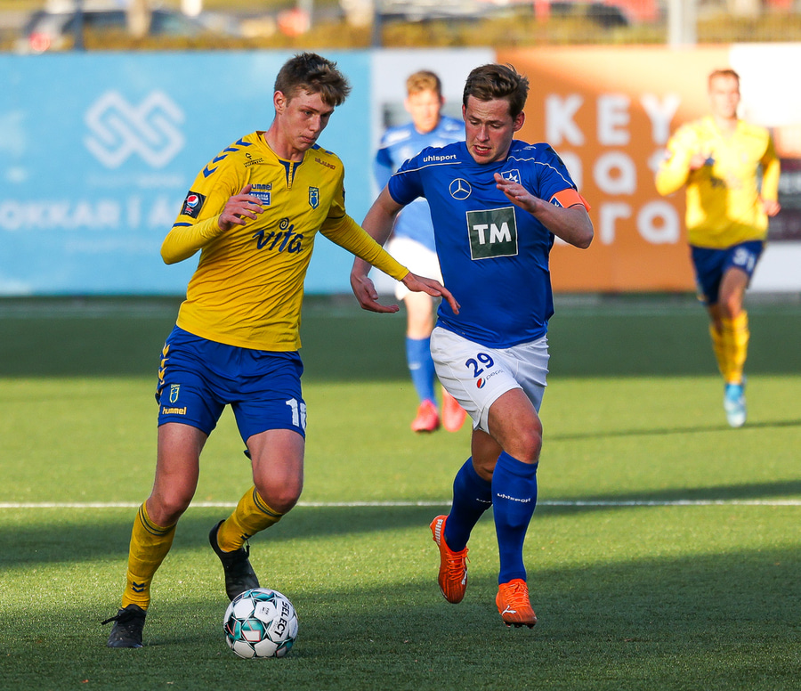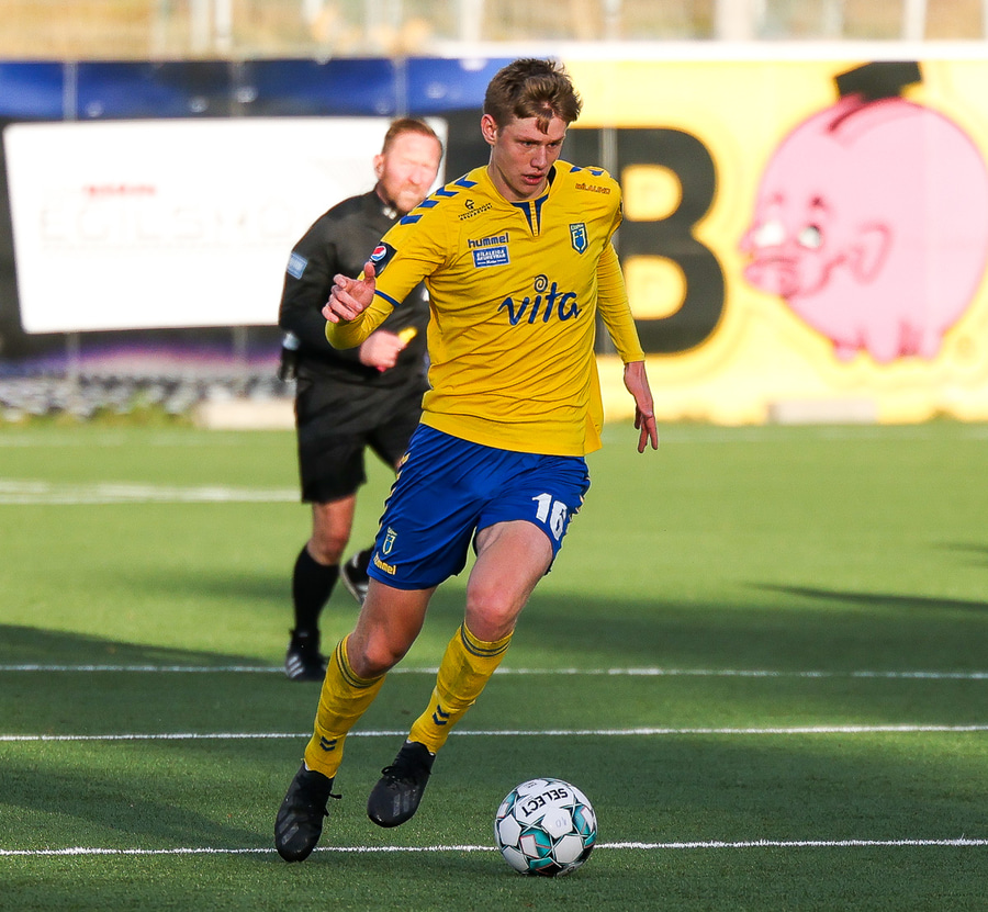 Arnór Breki á fyrstu snertingu leiksins og sækja Fjölnismenn í átt að vallarklukkunni.