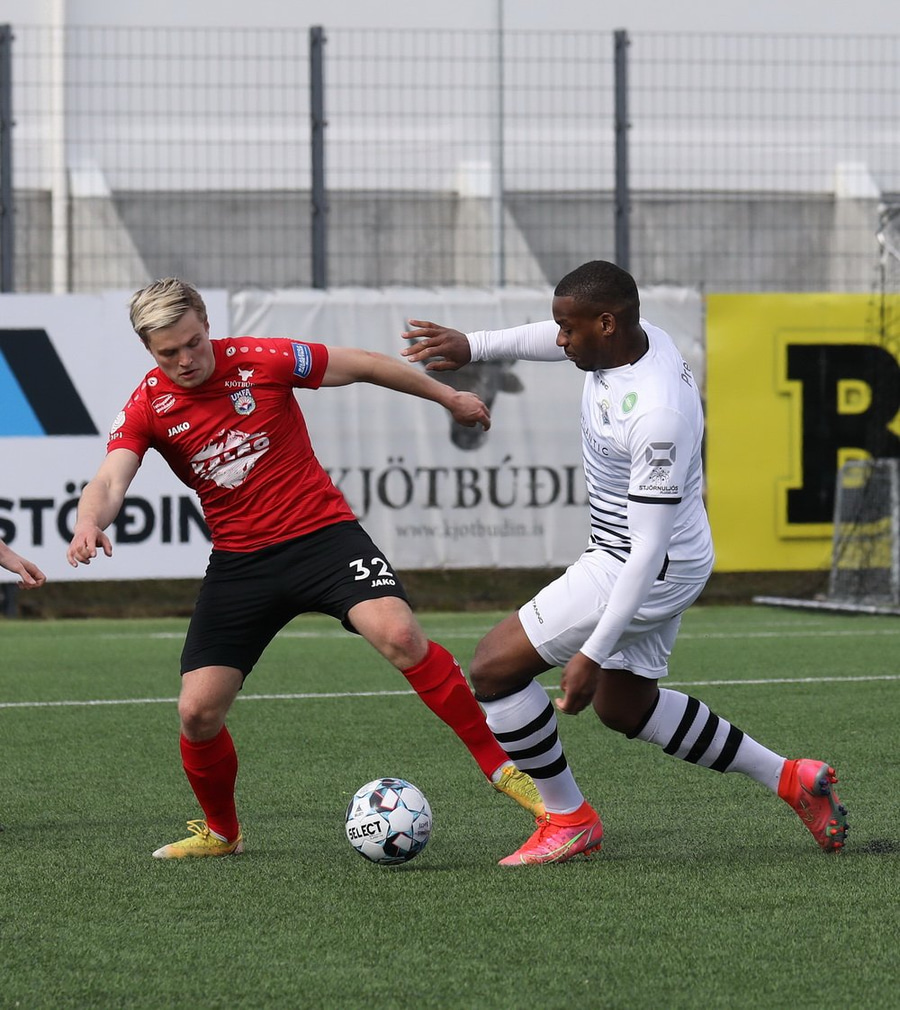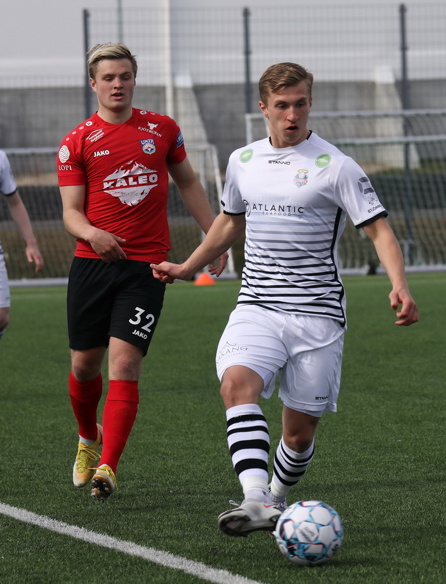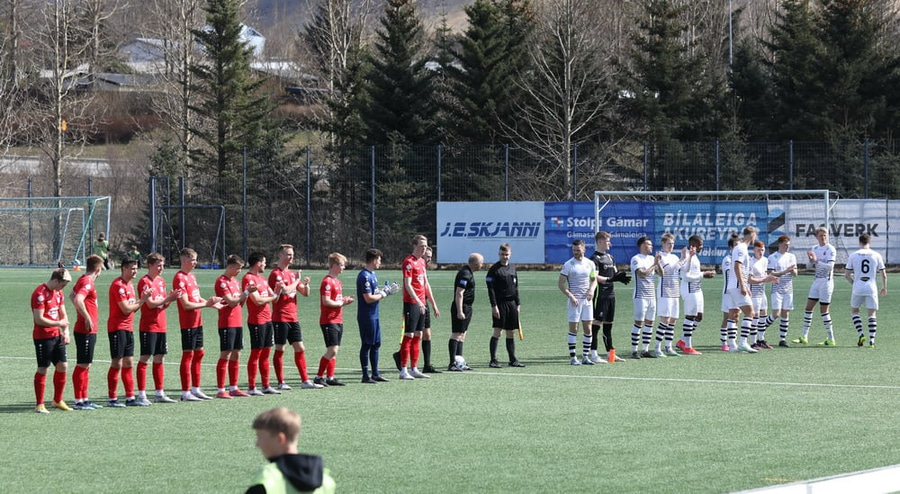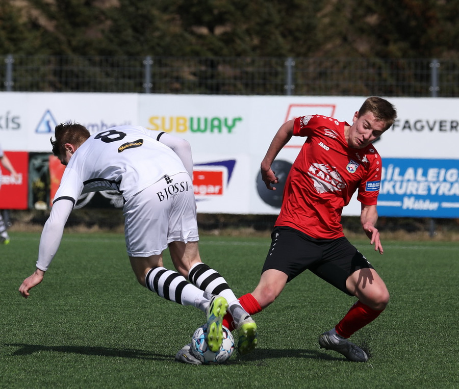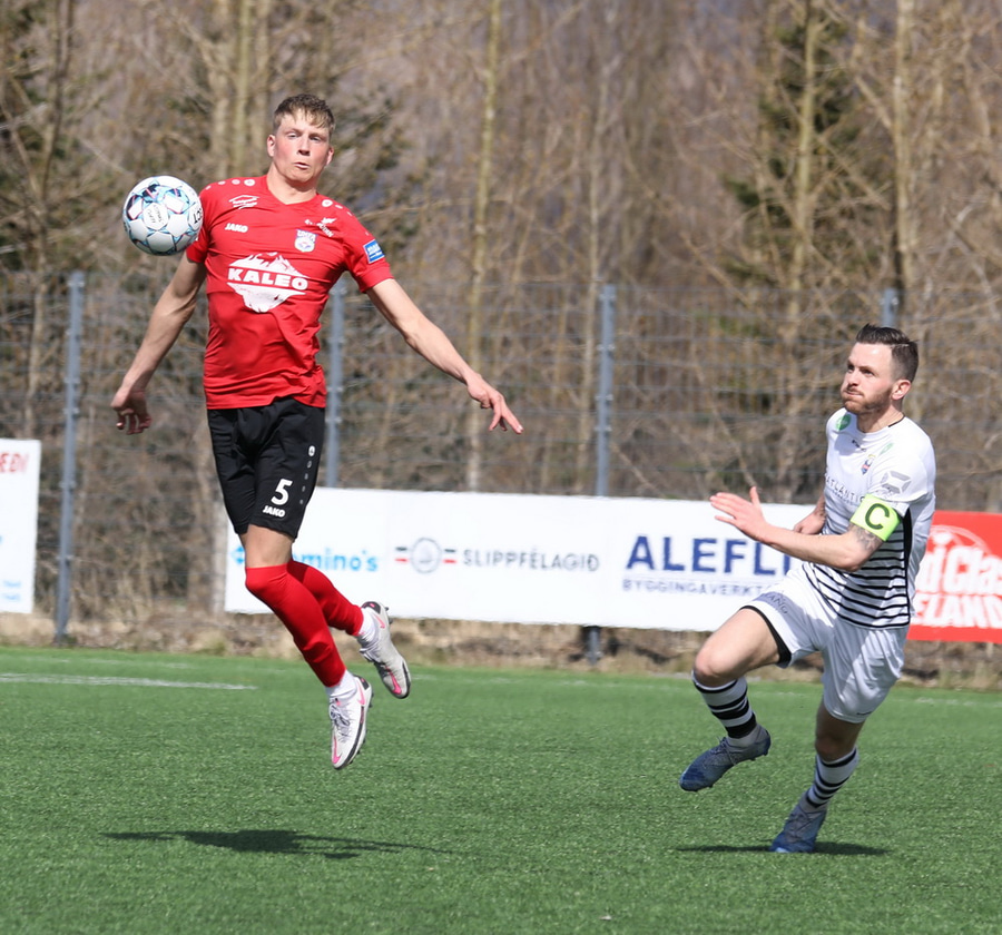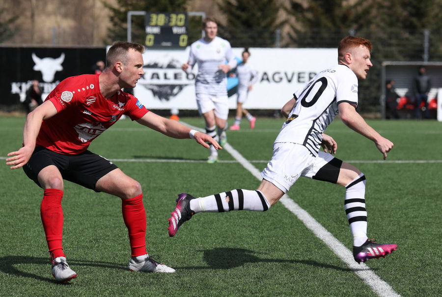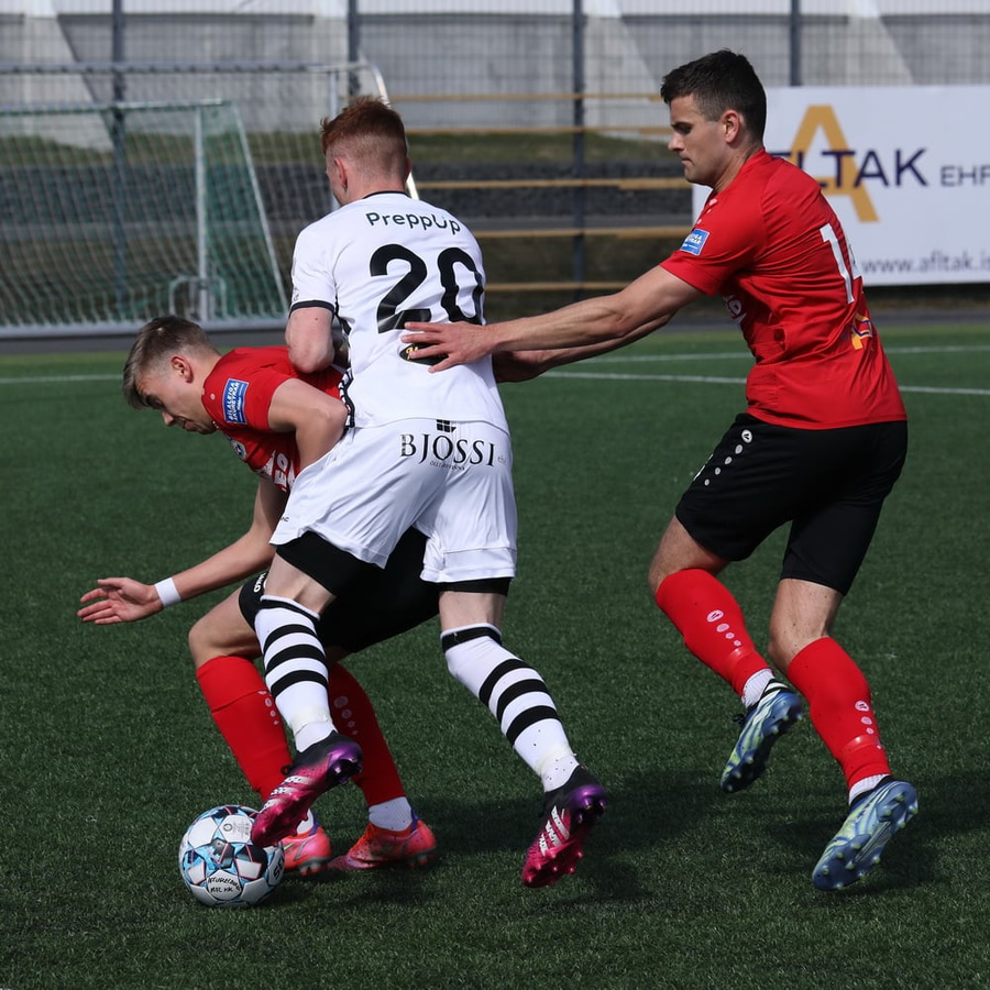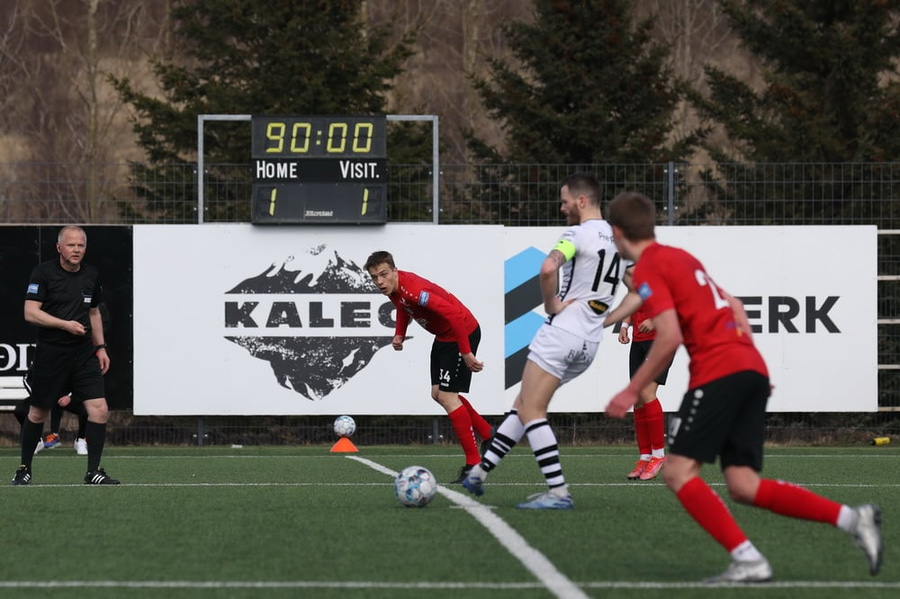 Afturelding spila í rauðu með flotta Kaleo merkinu á bolnum og meðan spila Kórdrengir í hvítu.