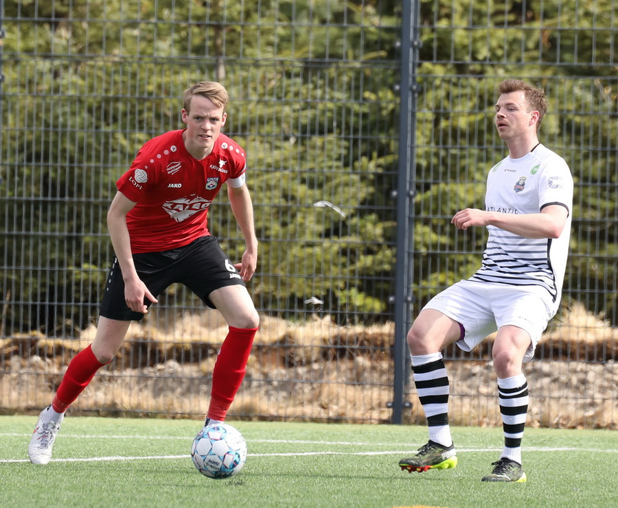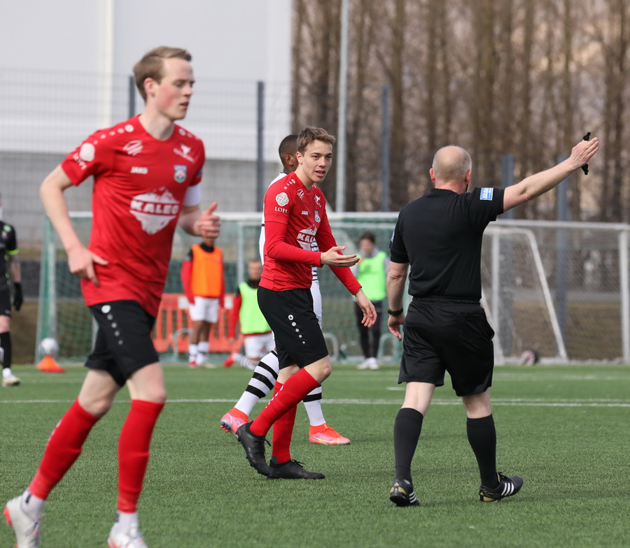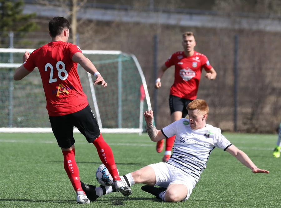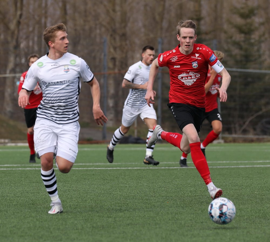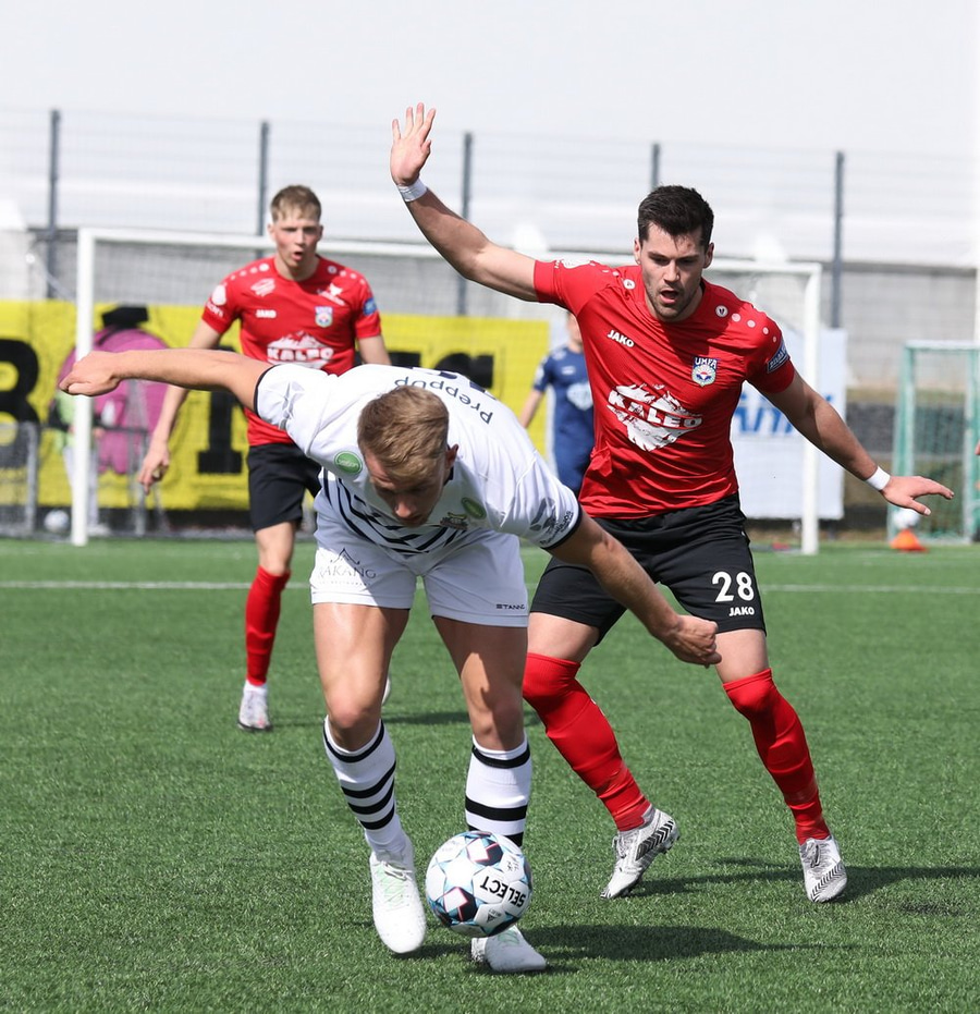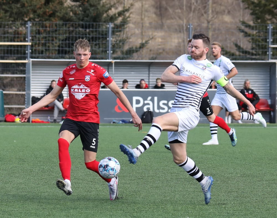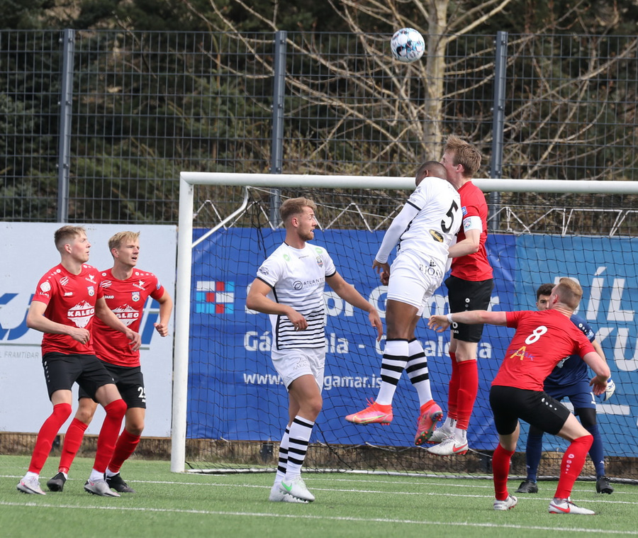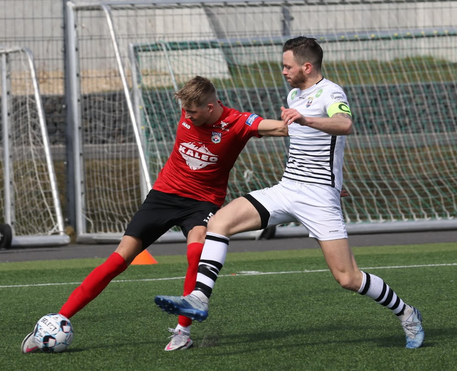 Afturelding spila í rauðu með flotta Kaleo merkinu á bolnum og meðan spila Kórdrengir í hvítu.