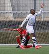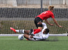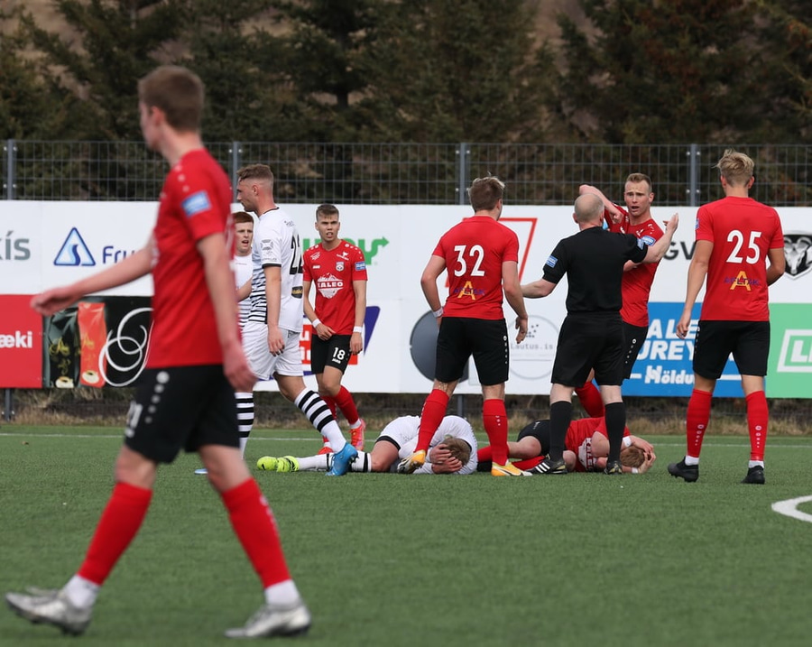 Það liggja tveir menn niðri frá sitthvorum liðum eftir höfuð högg.