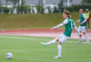 Liðin ganga út á völlinn. Breiðablik spilar í grænum treyjum með hvítum ermum. Racing spilar í ljósbláu.