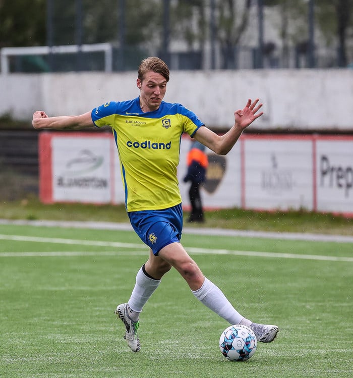 Jósef með fyrirgjöf sem Oddur keyrir á að krafti og keyrir Diogo niður. Dæmdur brotlegur.