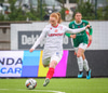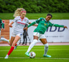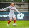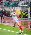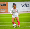 Kristjana fær bolta upp hægri vænginn og keyrir í átt að markinu en skotið er beint á Söndru.