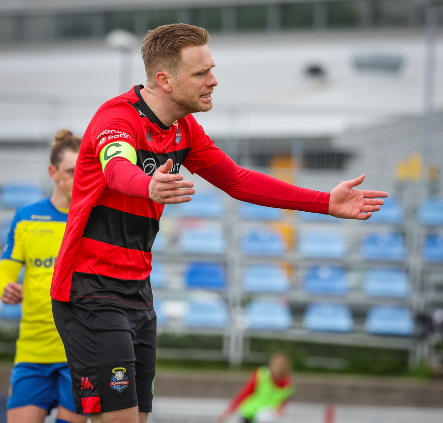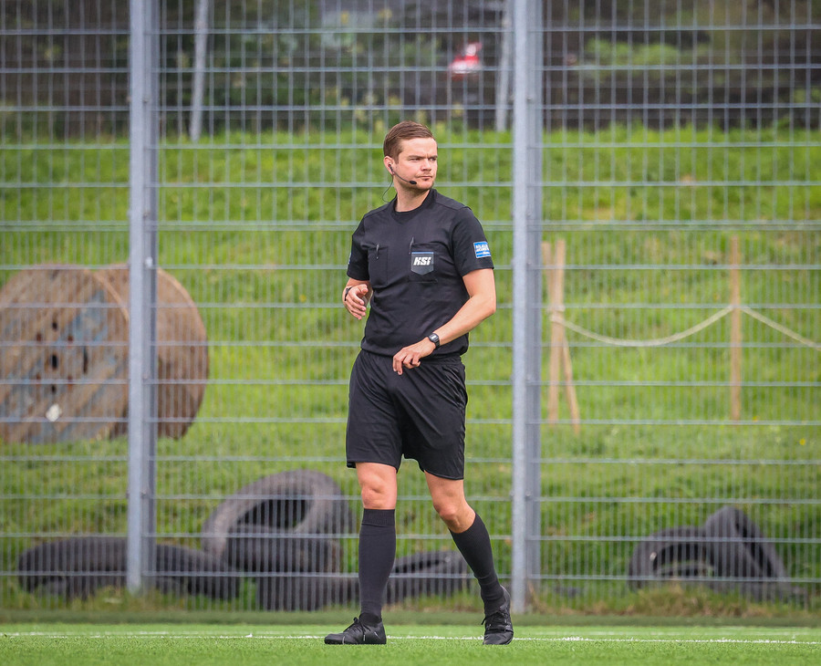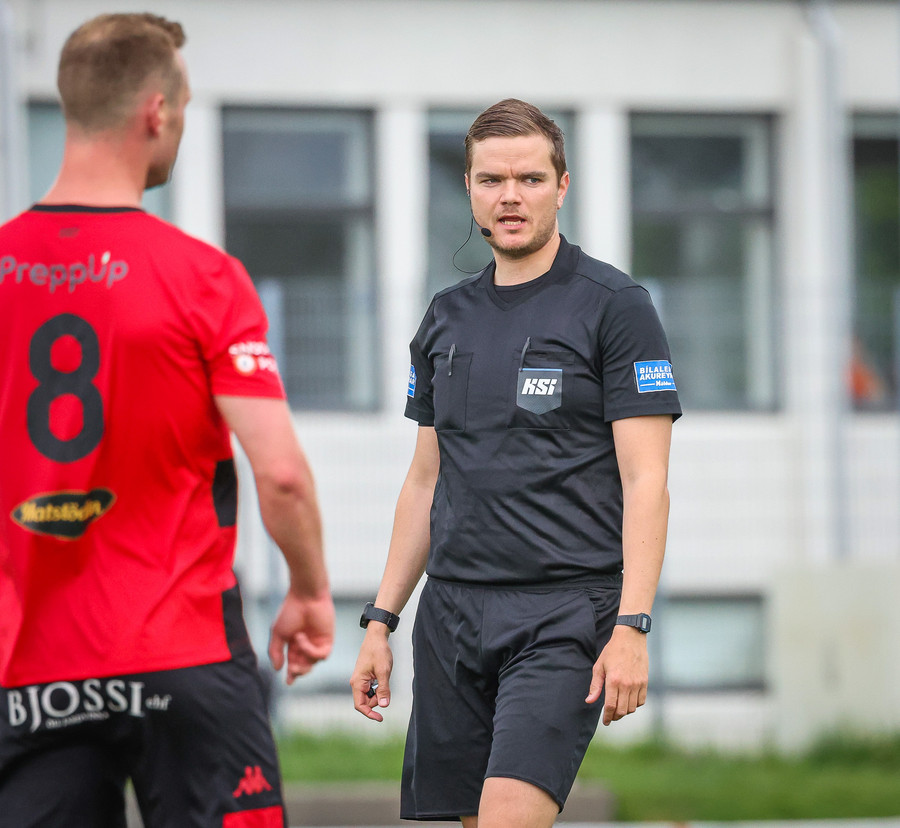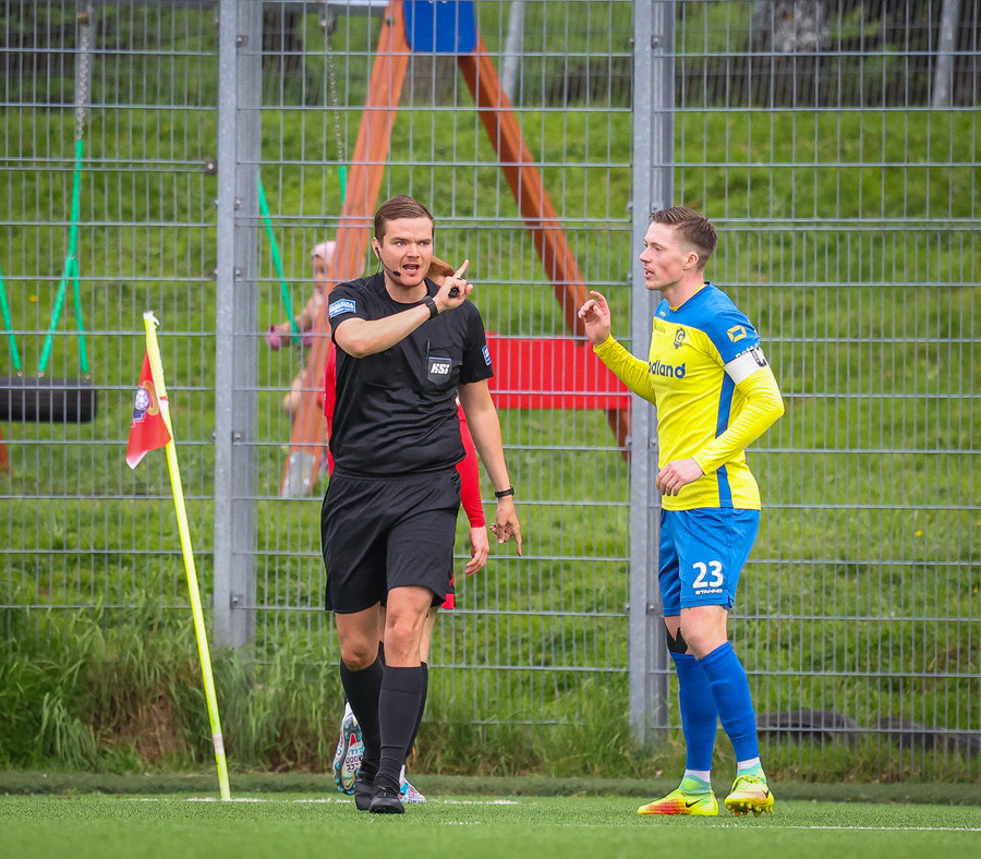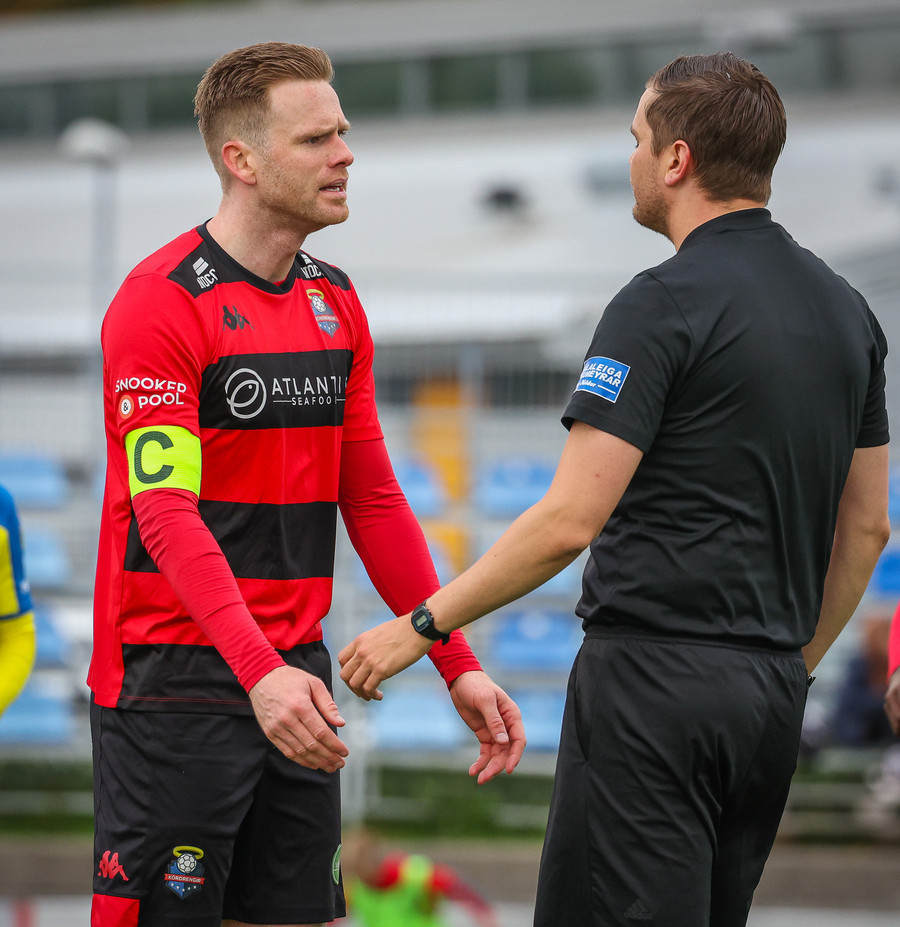 Kórdrengir gátu mögulega hafa fengið víti hérna í oka sekúndu leiksins, en Jóhann dómari heldur leikinn gangandi.