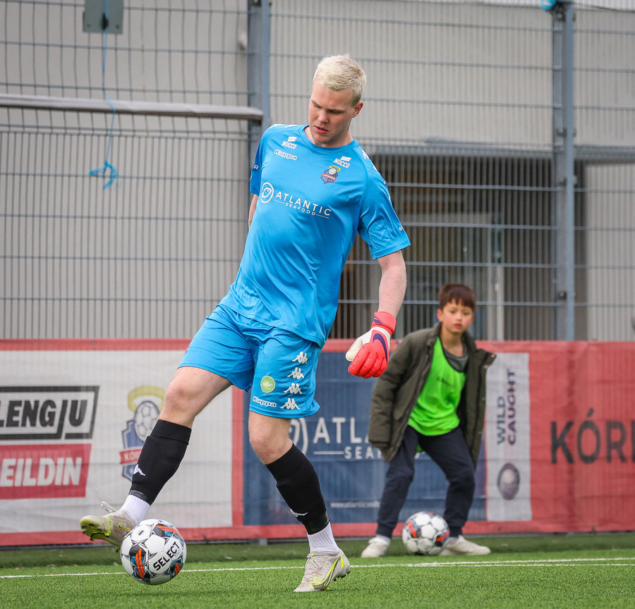 Kórdrengir vinna hornspyrnu eftir skot sem Fatai Gbadamosi á sem fer beint á Aron Dag í markinu.