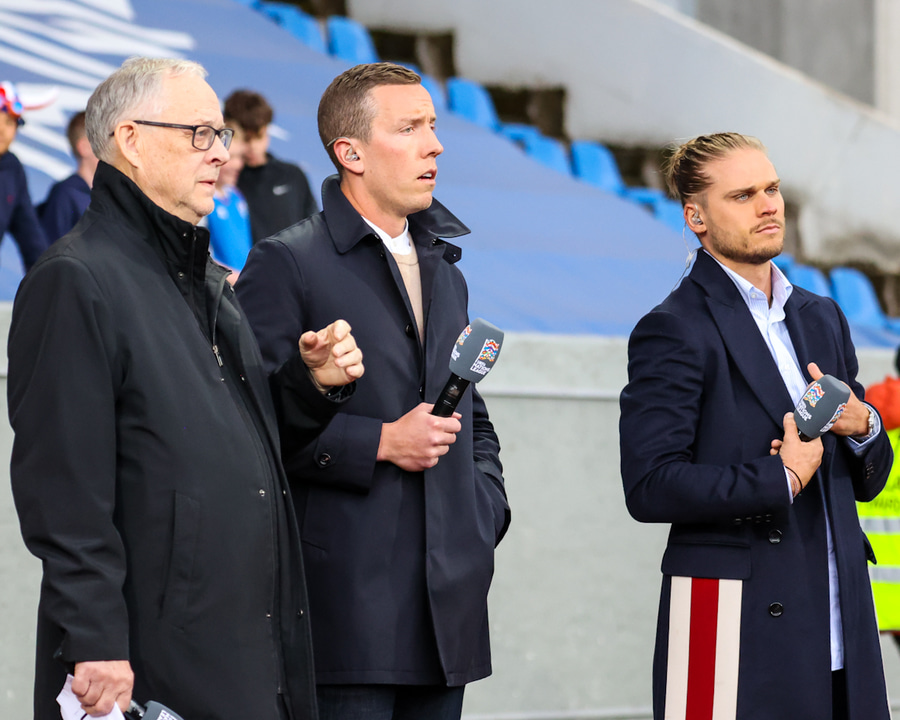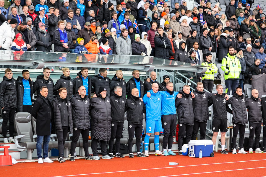 Þjóðadeildarfánanum veifað, liðin ganga til vallar og aðeins þjóðsöngvar og formlegheit standa í vegi fyrir því að þessi leikur hefjist.