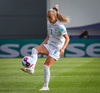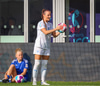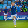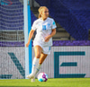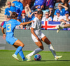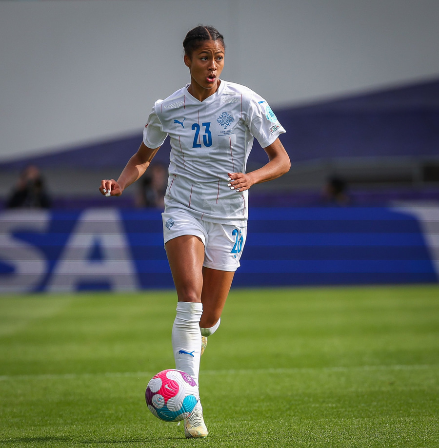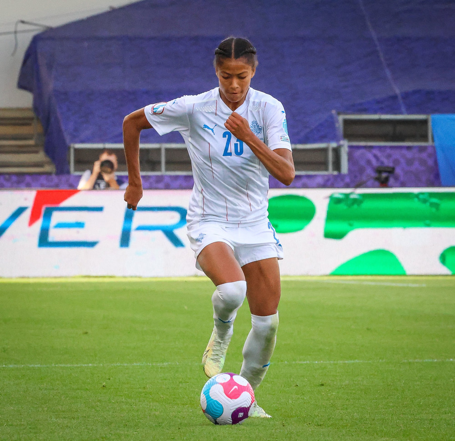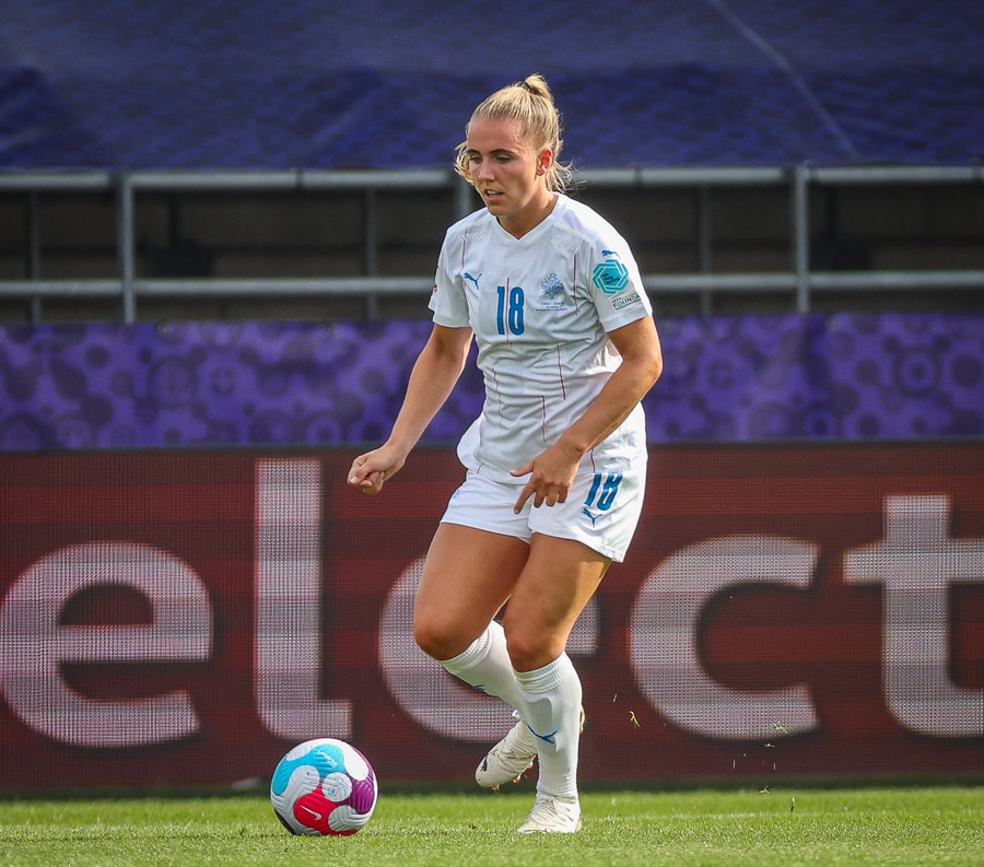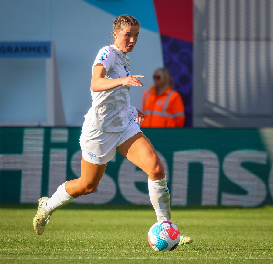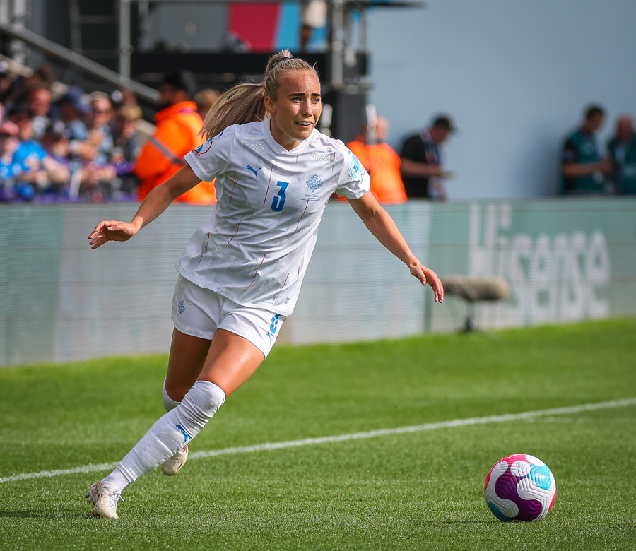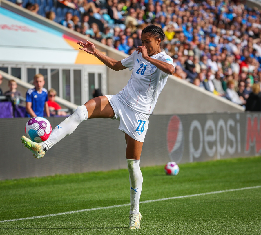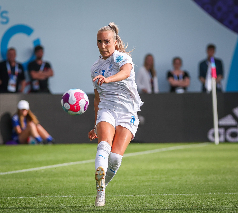 Sandra þrumar svo boltanum fram og í kjölfarið flautar Lina til hálfleiks. Ísland leiðir 1-0 eftir mark á 3. mínútu!