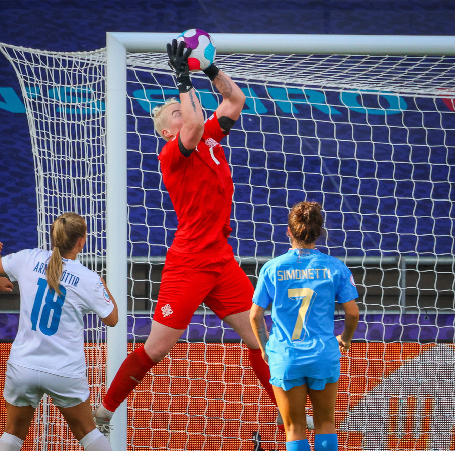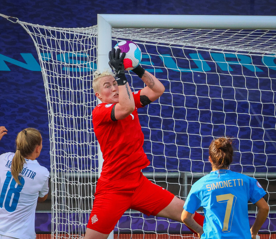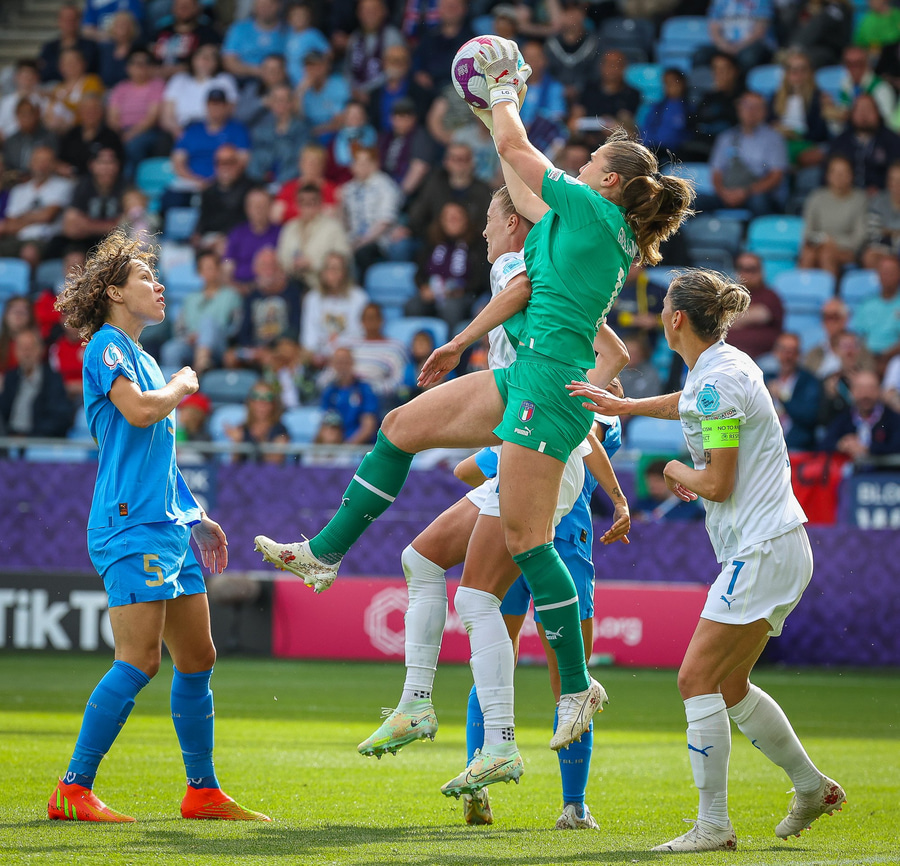 Hornspyrna frá Ítölum sem Girelli skallar inná markteiginn en þar er Sandra og hún rífur boltann til sín og kemur í veg fyrir frekari hættu.