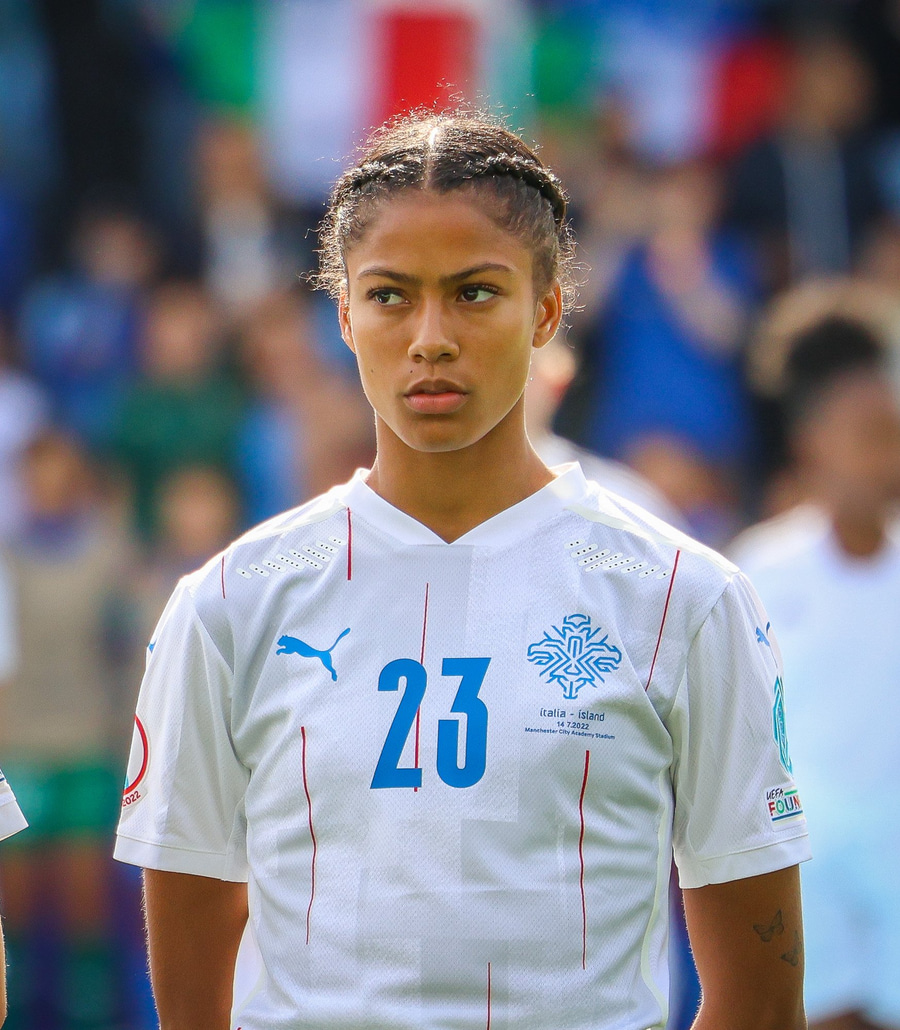 Sveindís fer upp á topp og Agla María fer á kantinn. Sara Björk er núna fremst á íslensku miðjuna með Dagnýju og Alexöndru fyrir aftan sig.
