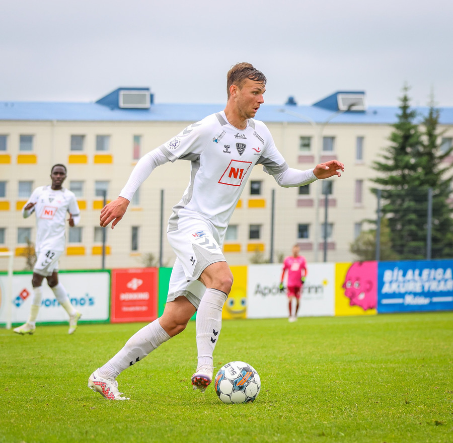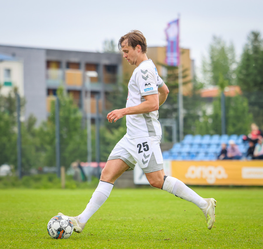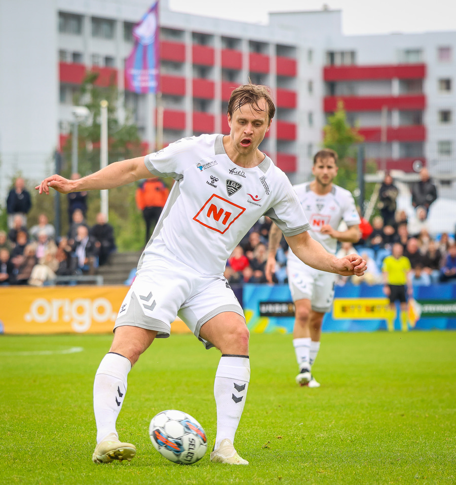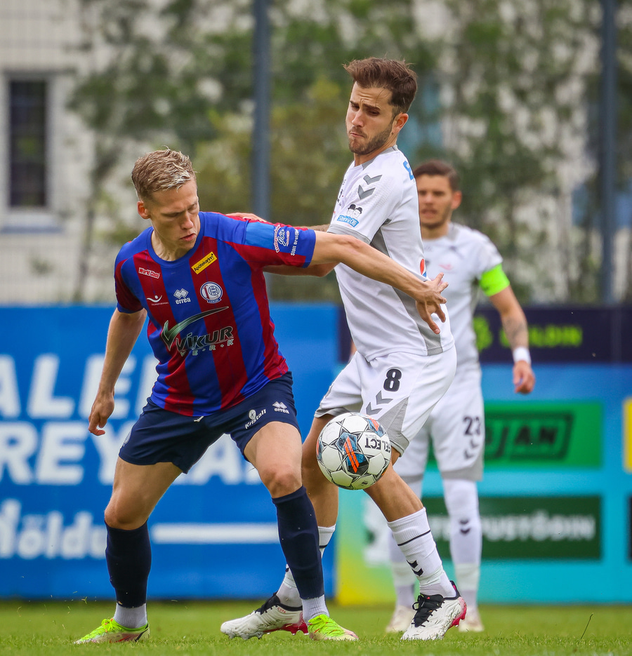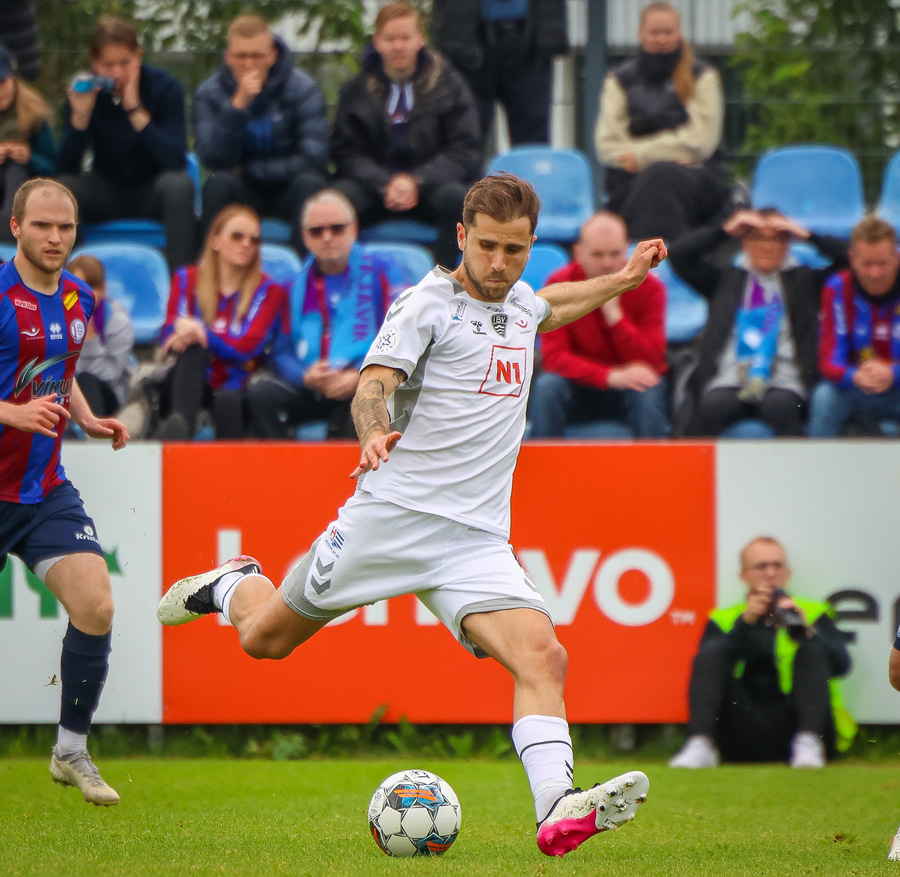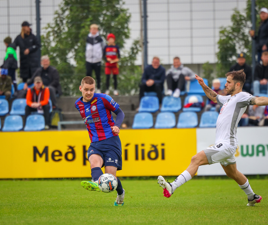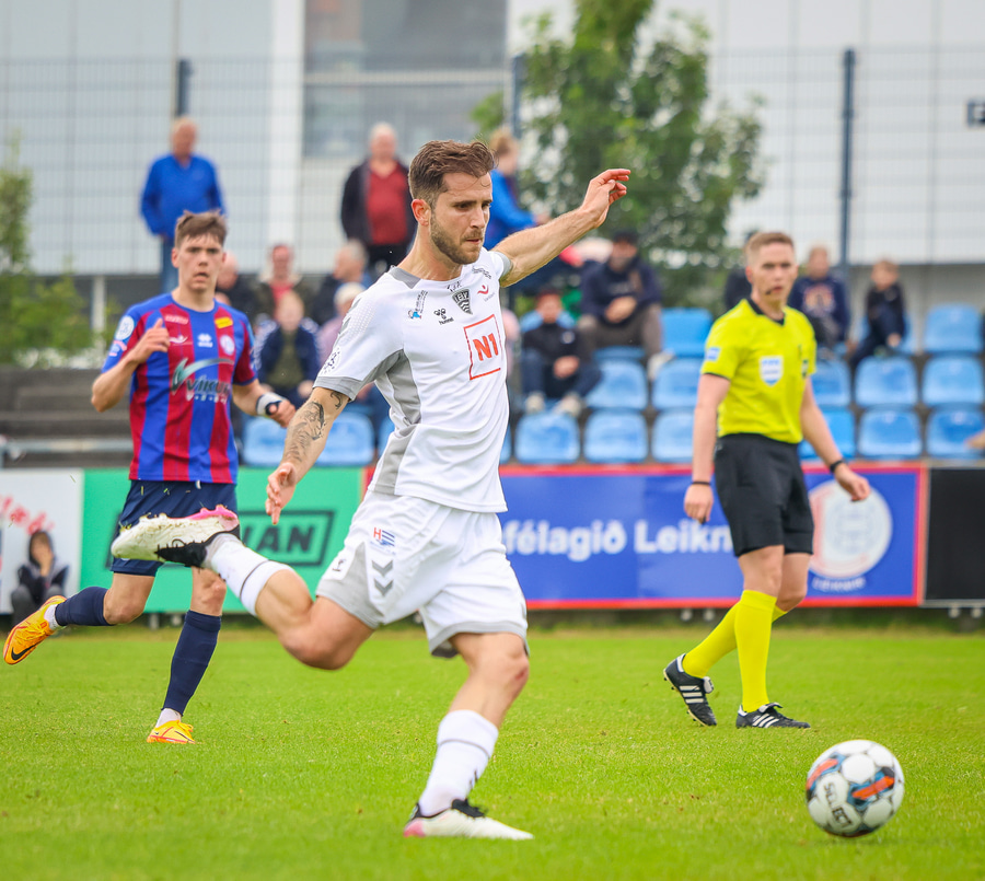 A-Landsliðsmaðurinn Felix Örn Friðriksson með skot/fyrirgjöf sem fer í gegnum allann pakkann og rennur rétt framhjá markinu...