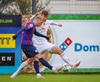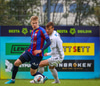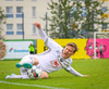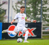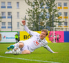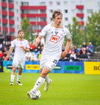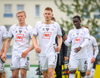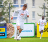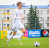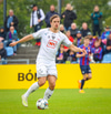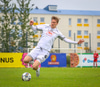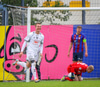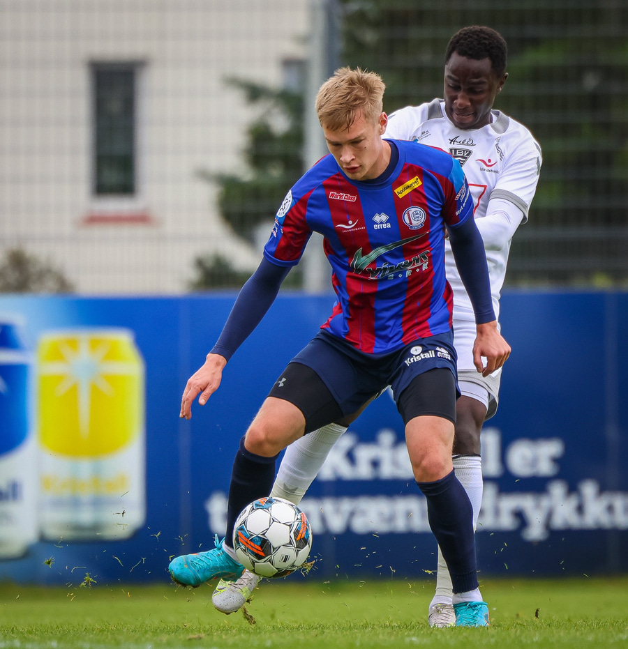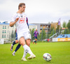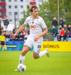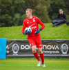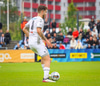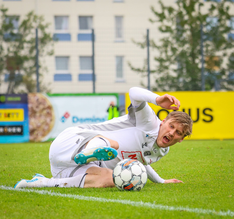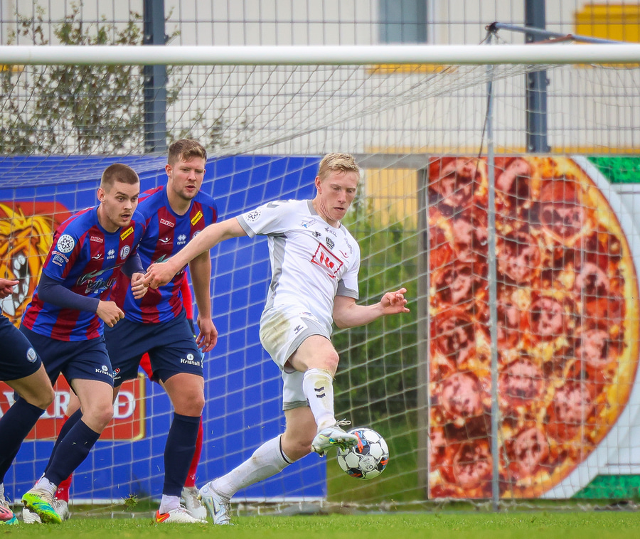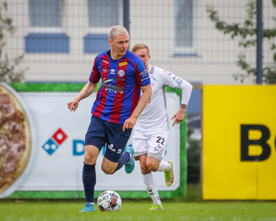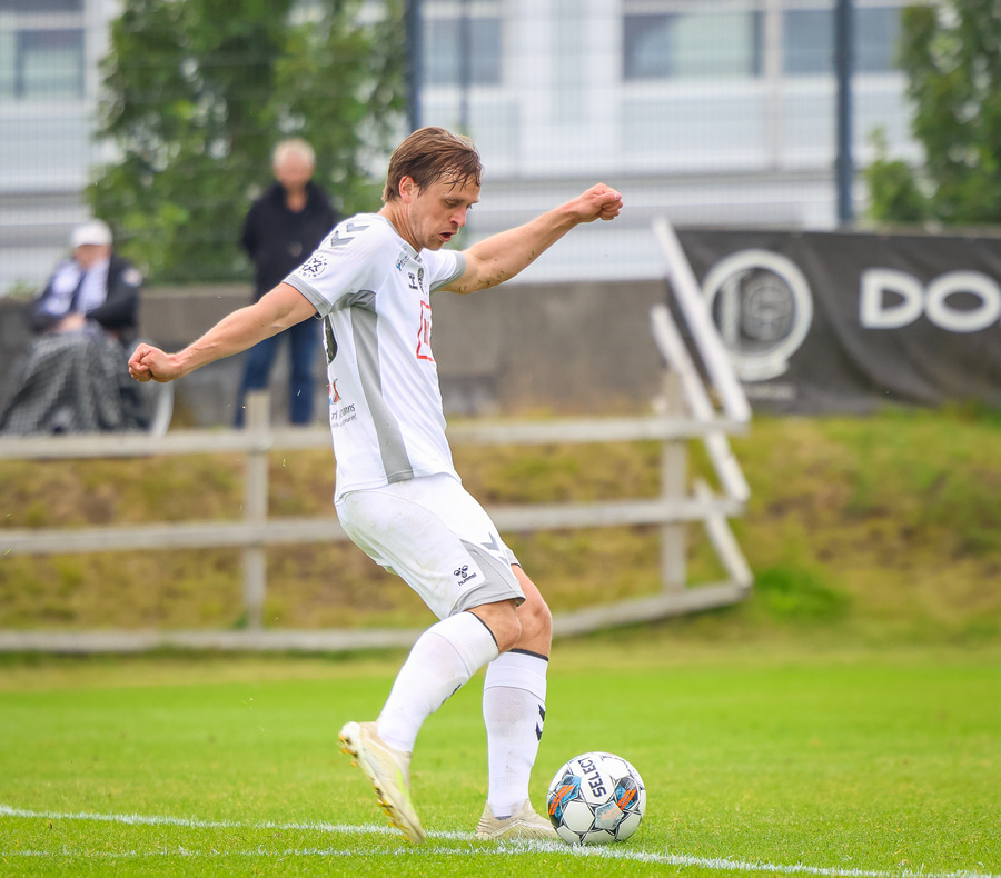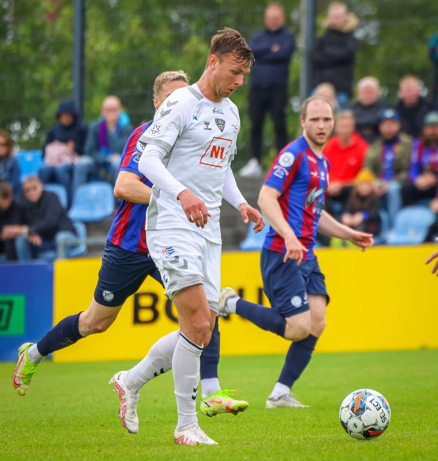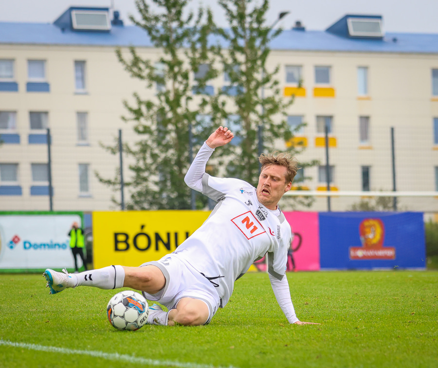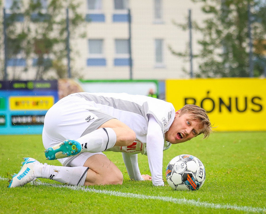 A-Landsliðsmaðurinn Felix Örn Friðriksson með skot/fyrirgjöf sem fer í gegnum allann pakkann og rennur rétt framhjá markinu...