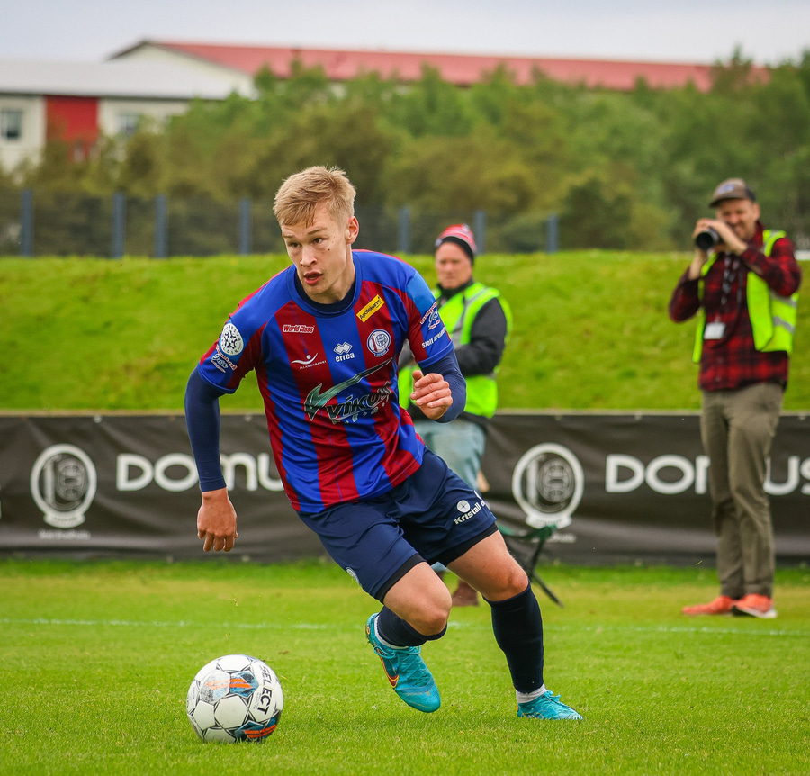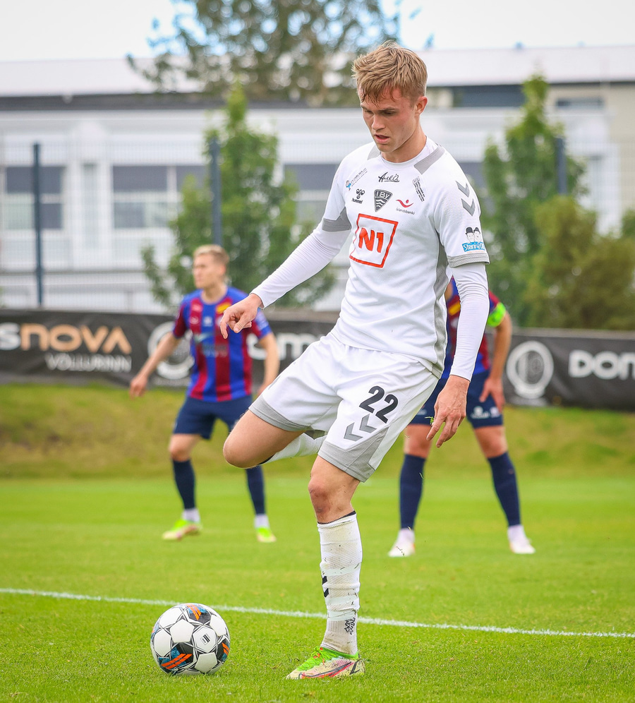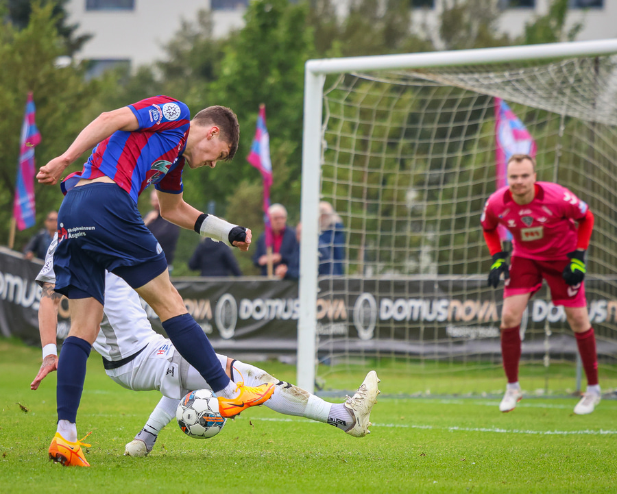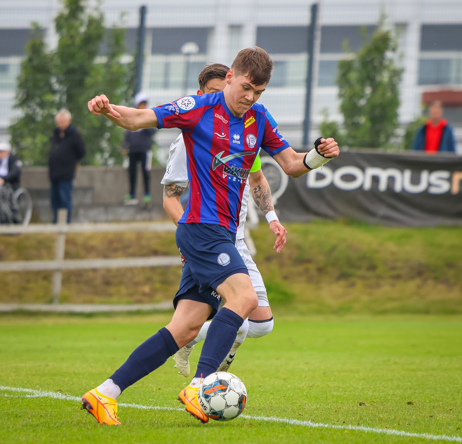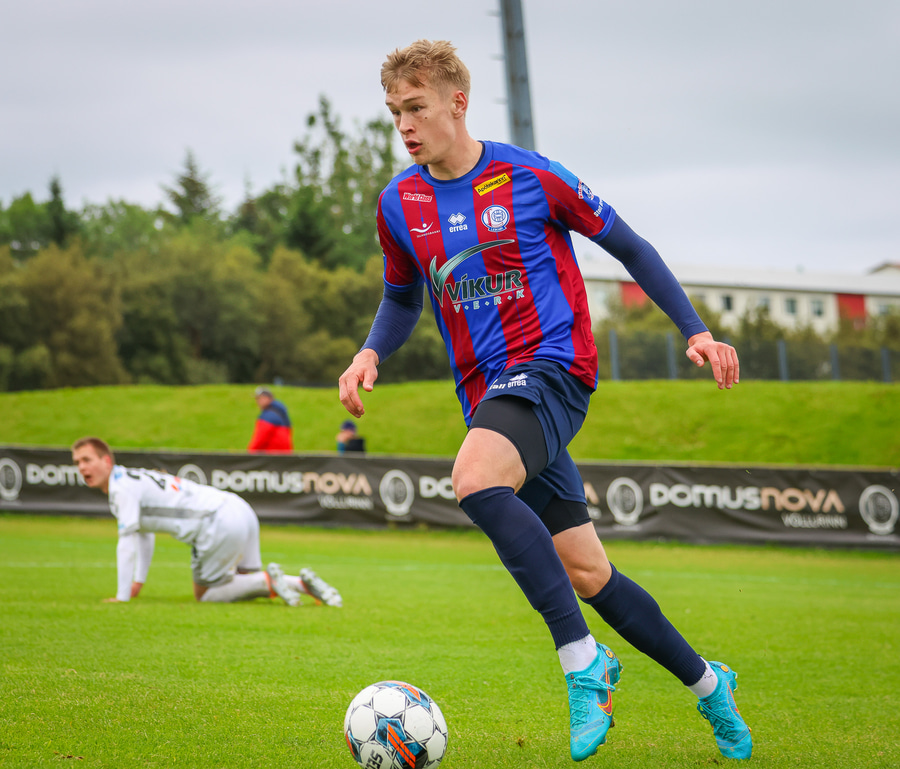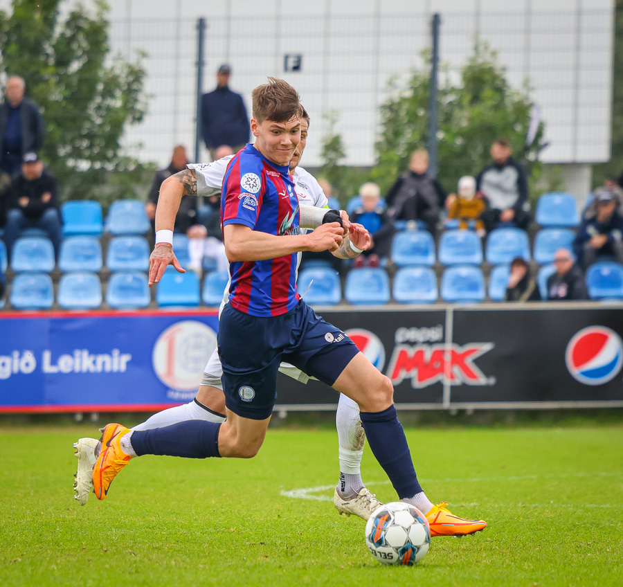Arnar Breki með fyrirgjöf inn á teig sem Atli Hrafn skallar yfir markið