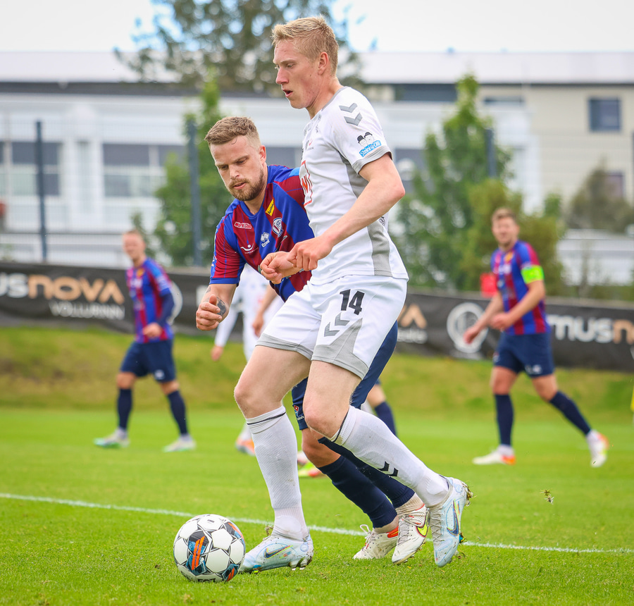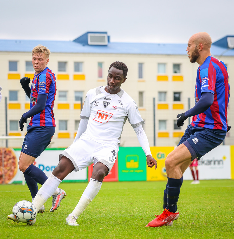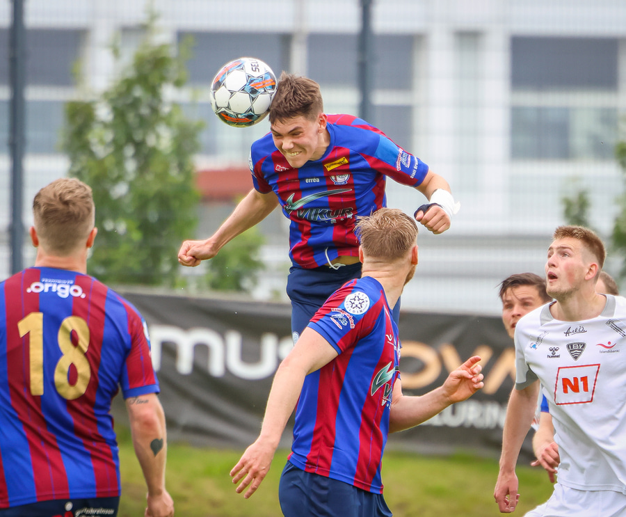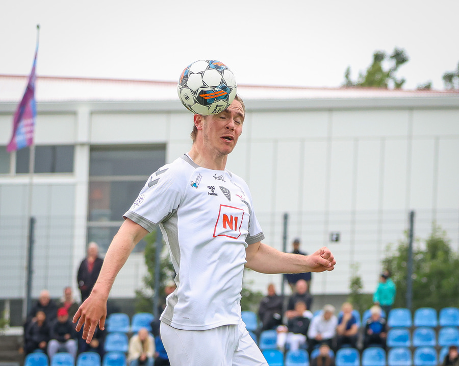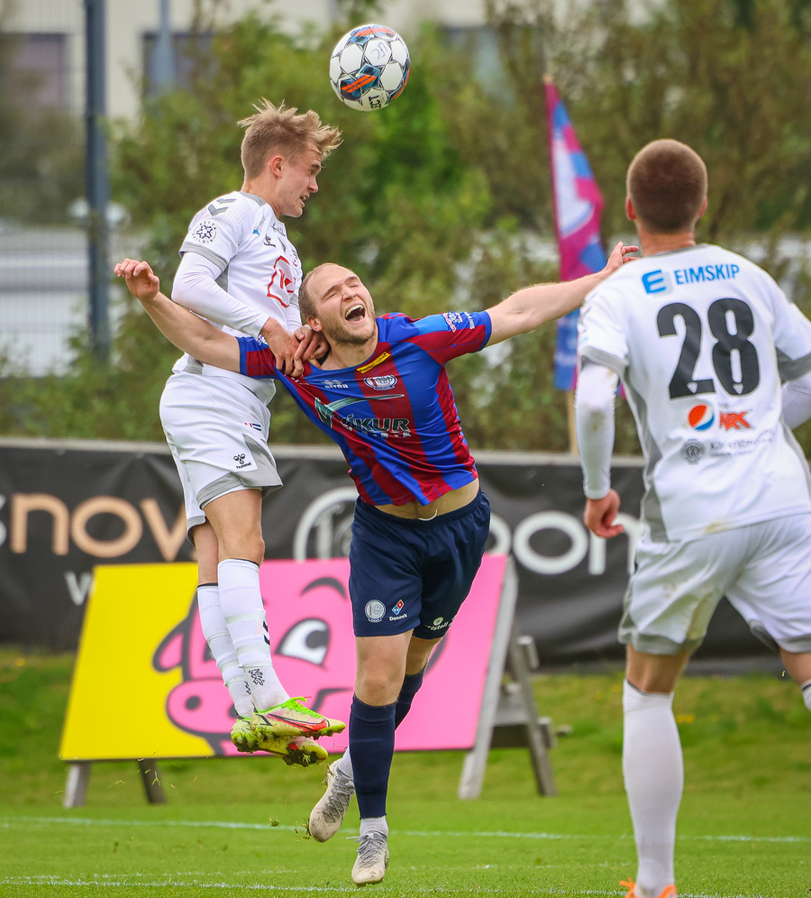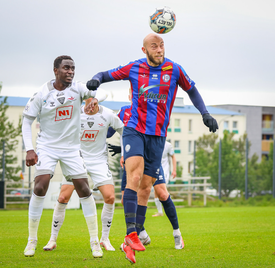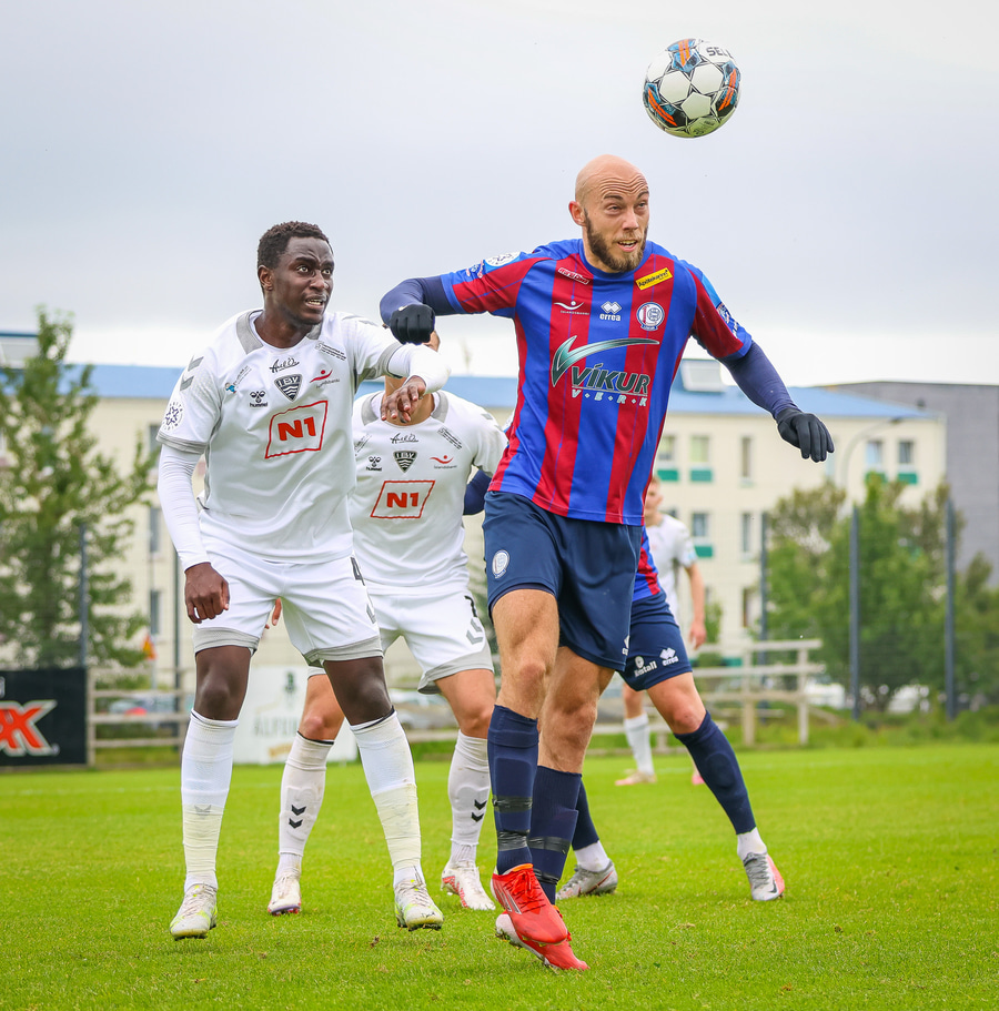 Kannski aðeins of há sending fyrir Atla sem þurfti svolítið að teygja sig í boltann..