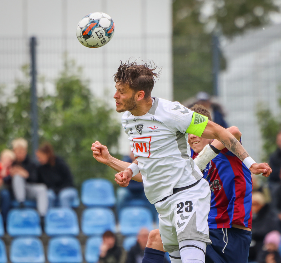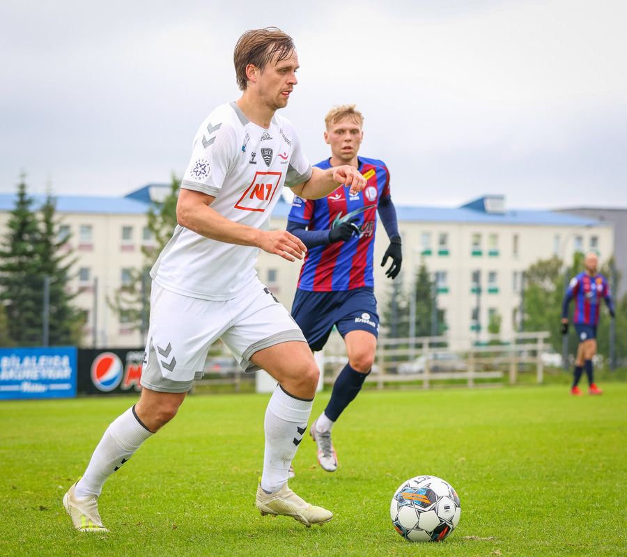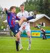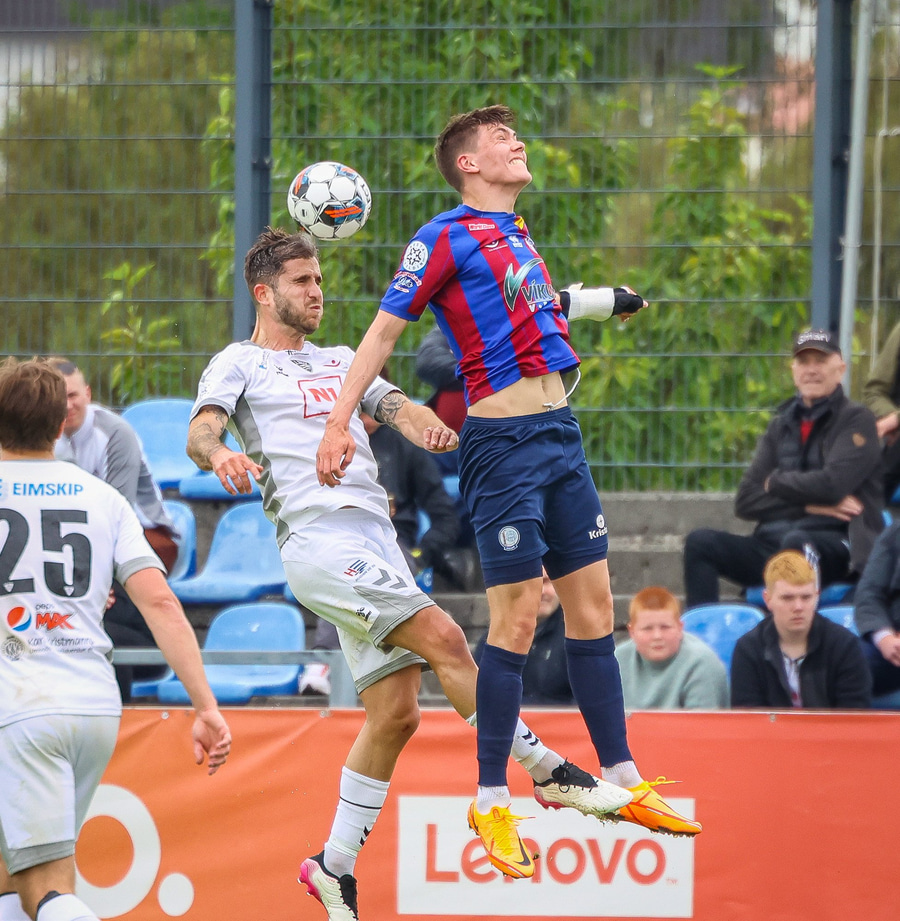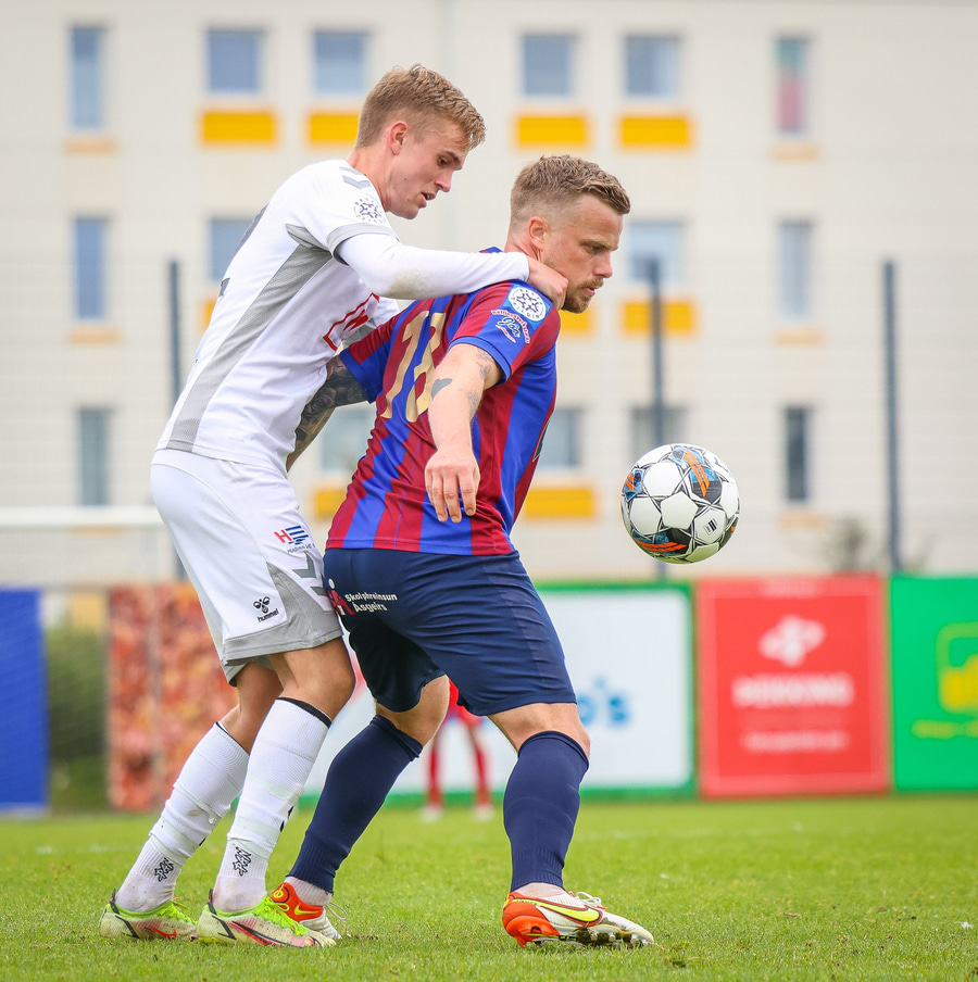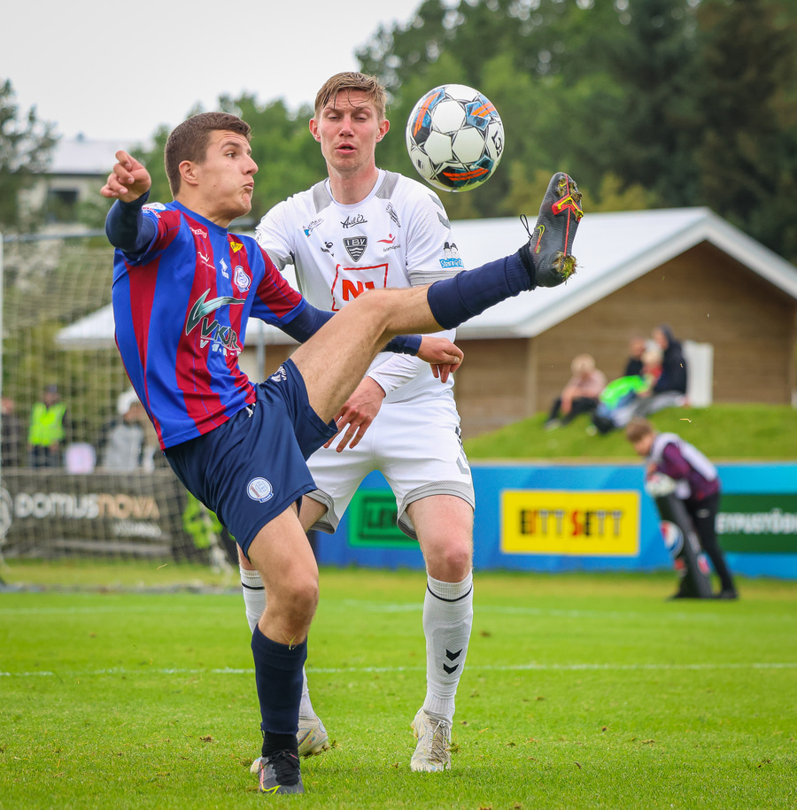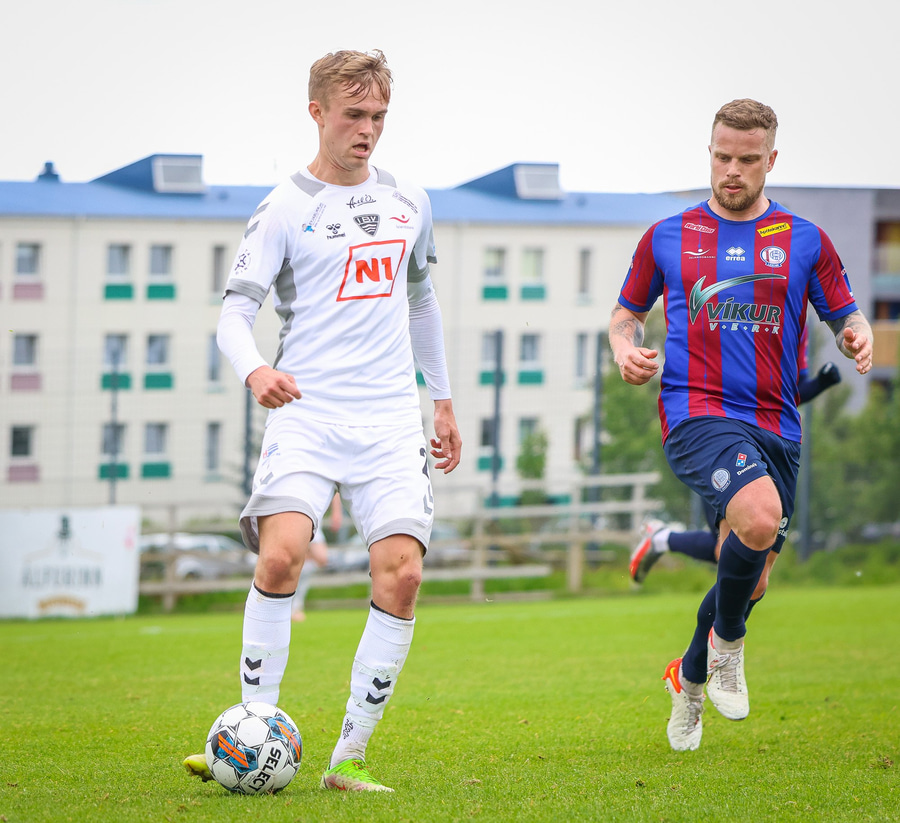 Kannski aðeins of há sending fyrir Atla sem þurfti svolítið að teygja sig í boltann..