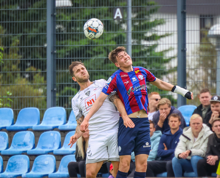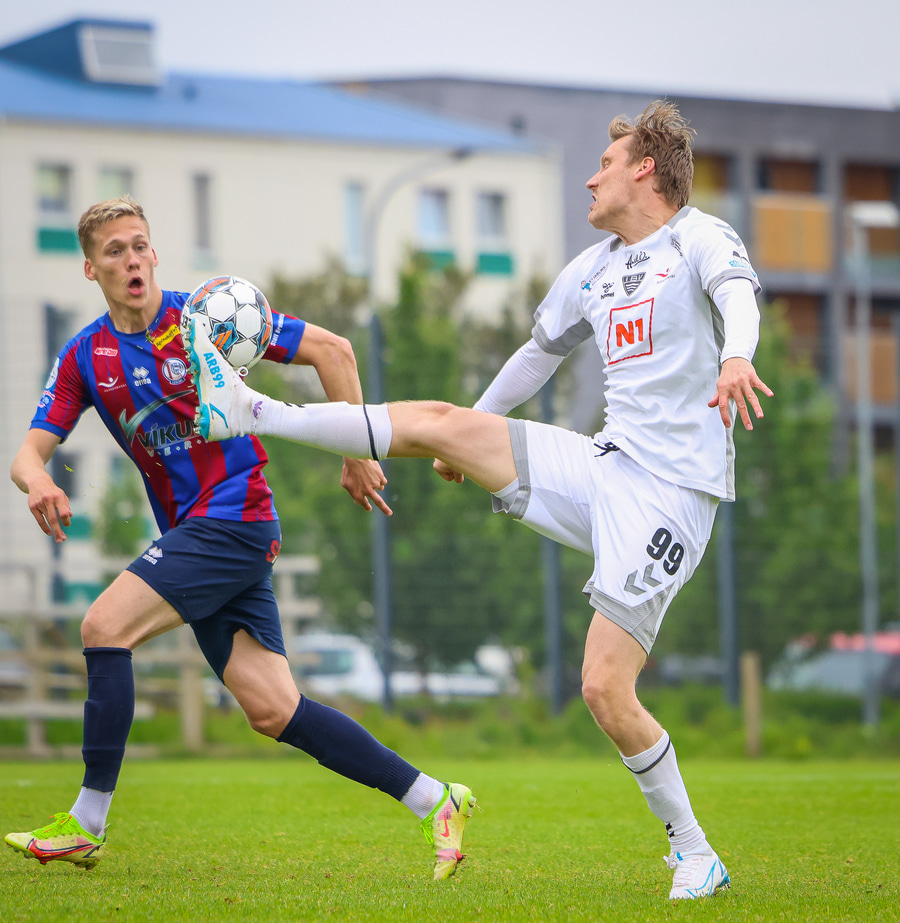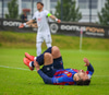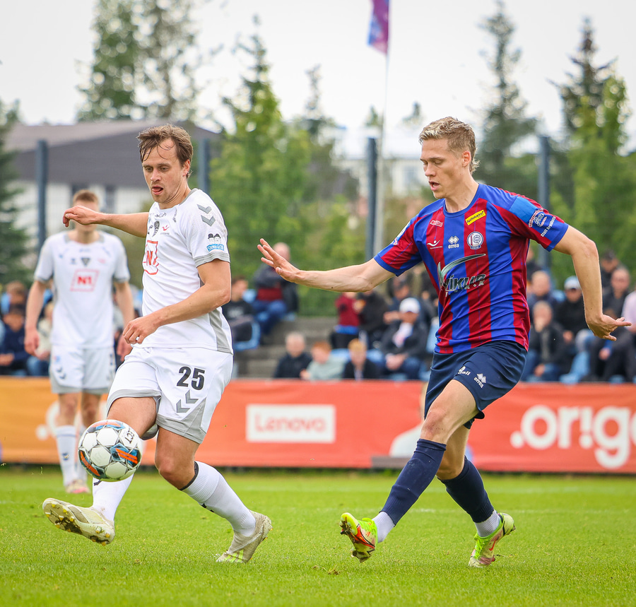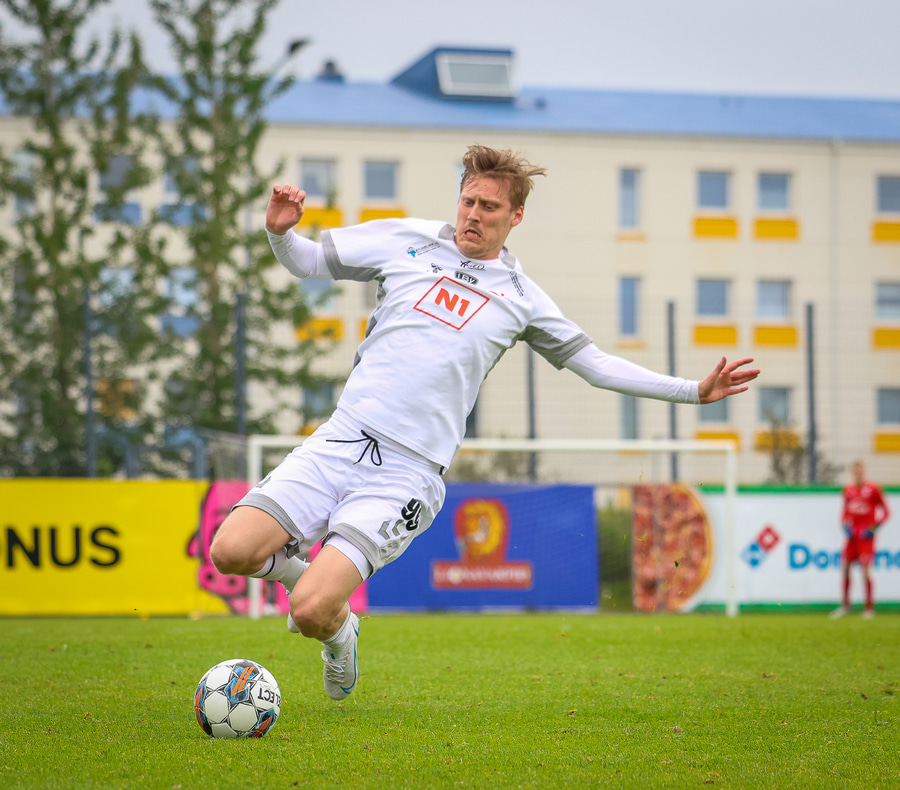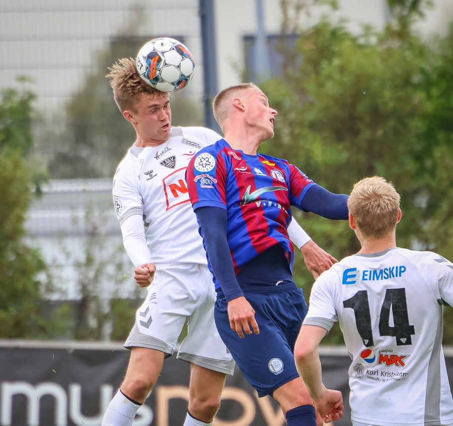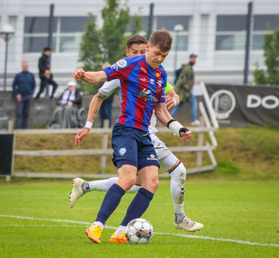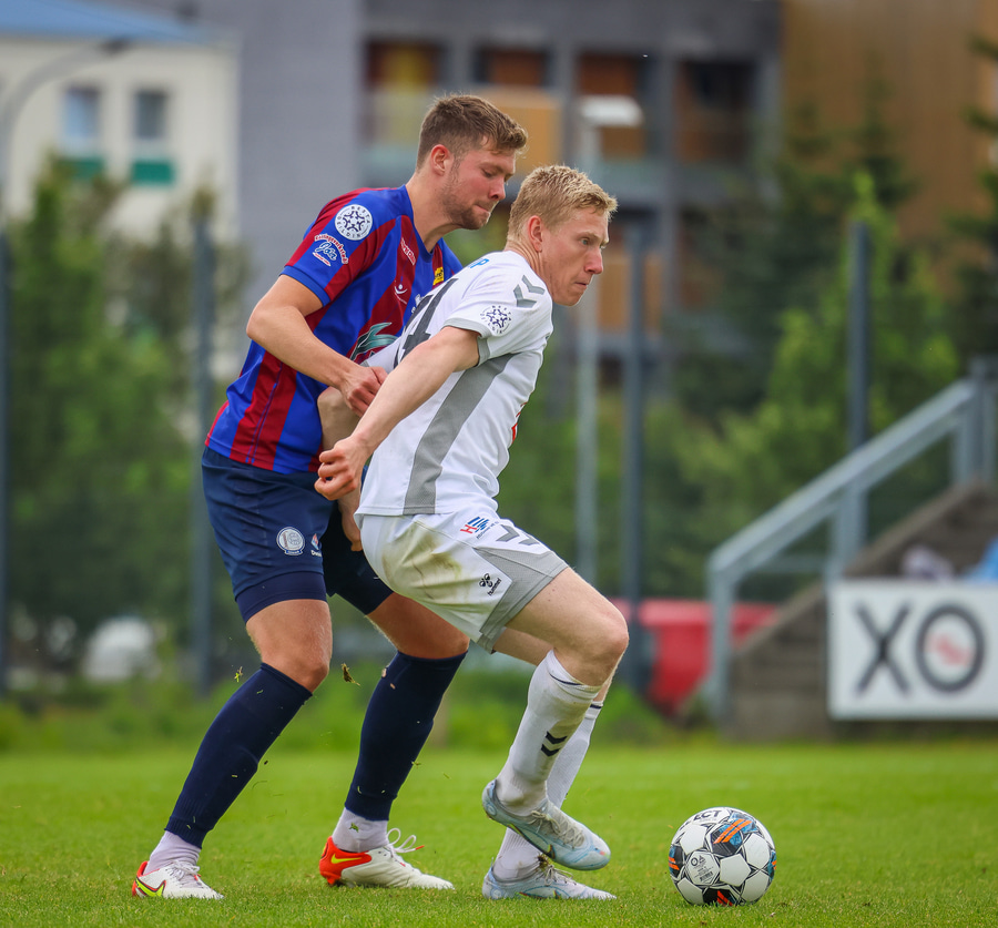 Kannski aðeins of há sending fyrir Atla sem þurfti svolítið að teygja sig í boltann..