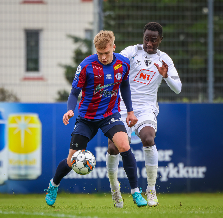 Hornspyrna inn á teig frá Atla, spyrnan fer á fjærsvæðið þar sem að Eiður Aron vinnur skallaboltann og á fínan skalla á markið en Viktor ver þetta ágætlega!