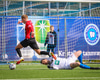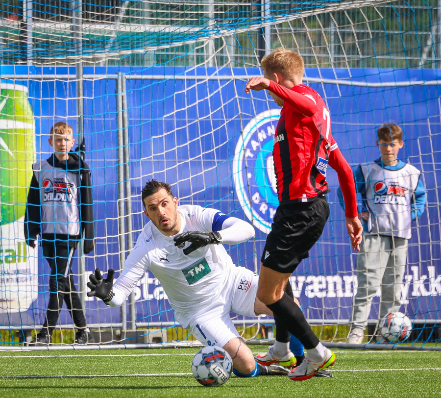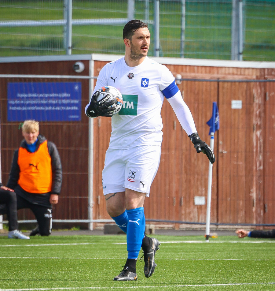 Hornspyrnan fer í gegnum allan pakkann og endar hjá Birni. Hann á svo skot sem Haraldur ver í netið. Þarna á Haraldur líklega að gera betur!