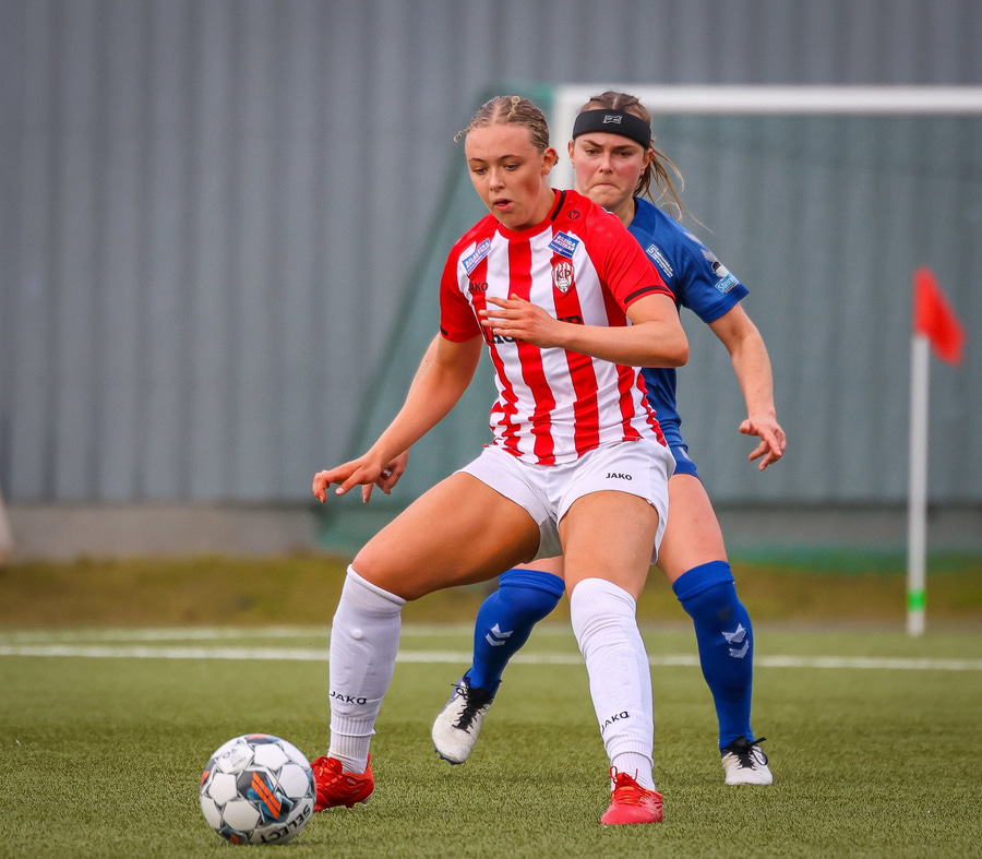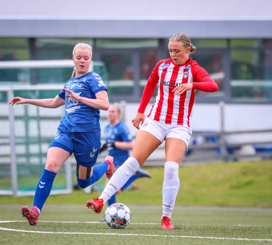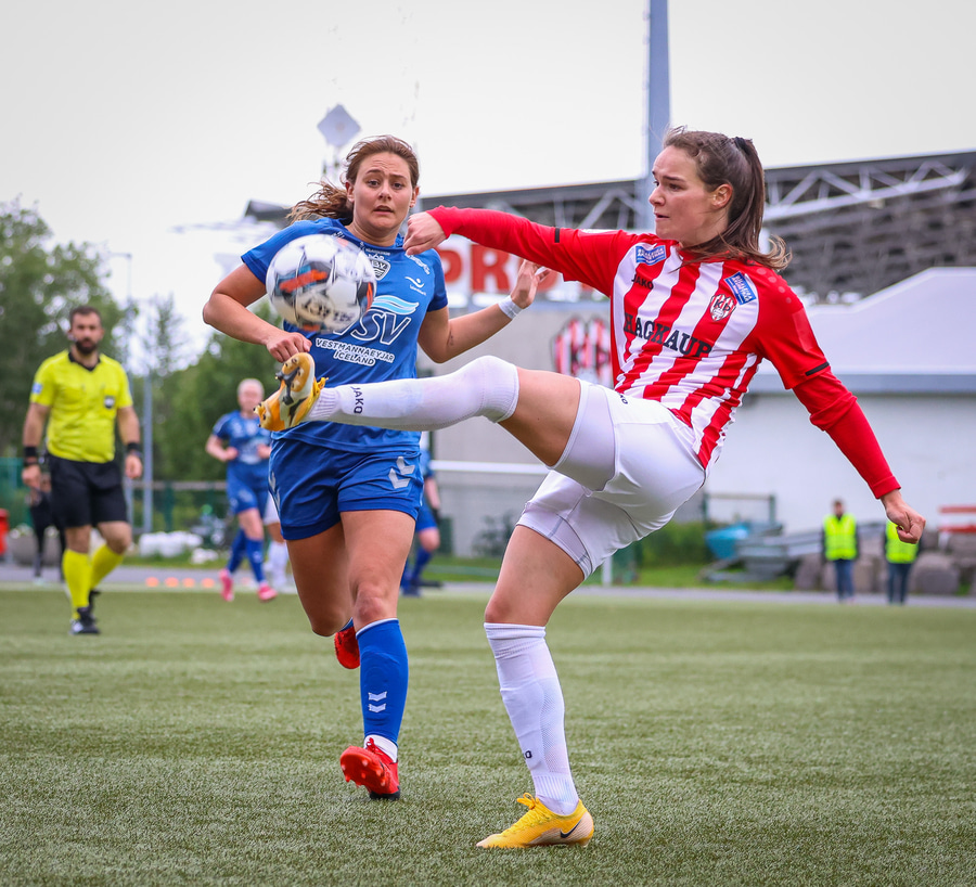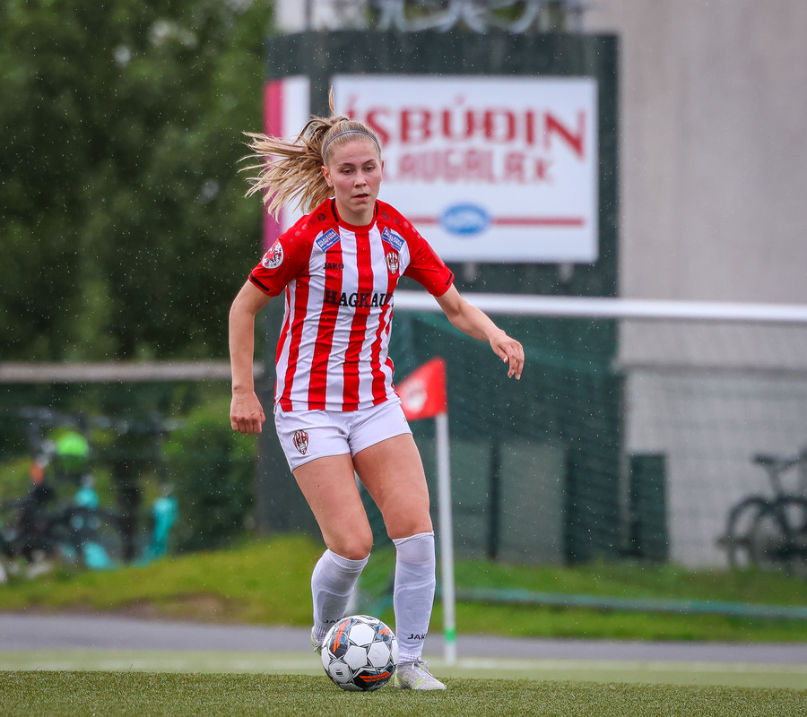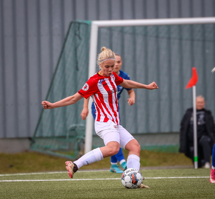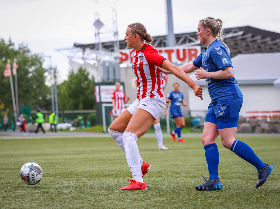 Freyja Karín strax komin í boltann. Hún kemur á mikilli ferð og á svo sendingu út í teiginn á Murphy sem á skot en Auður ver.