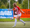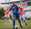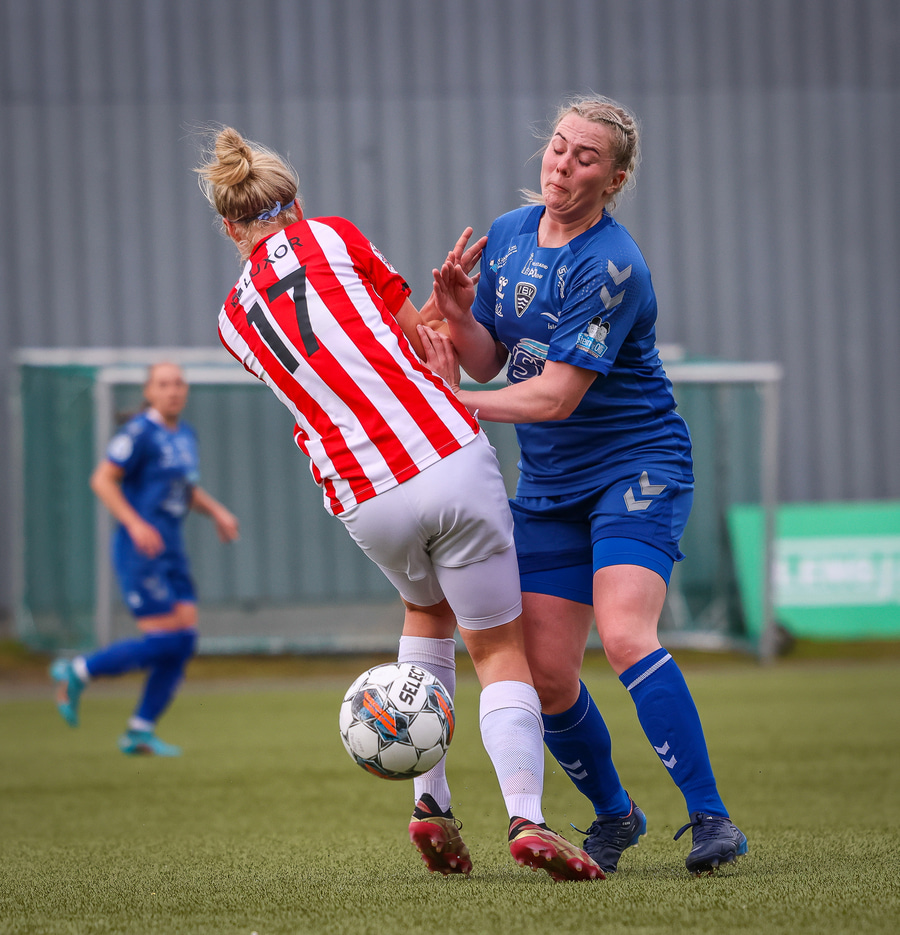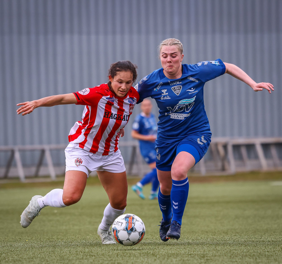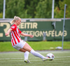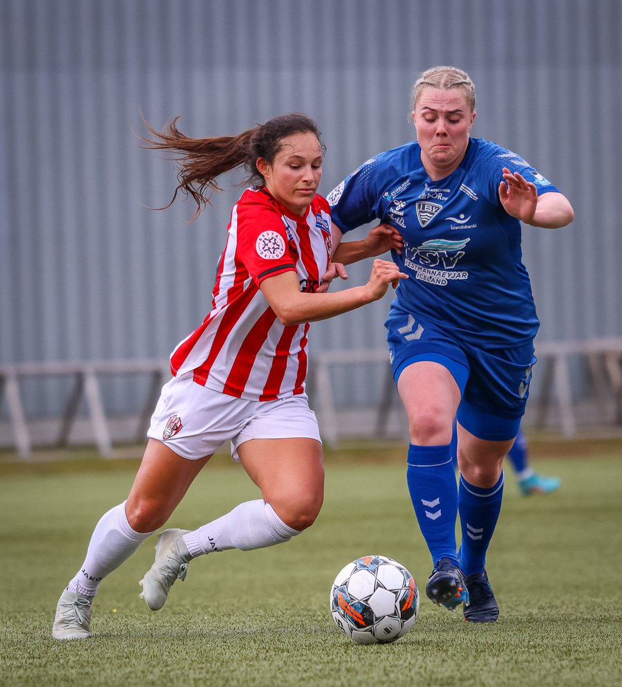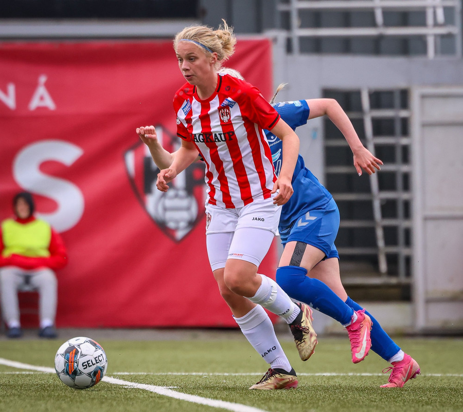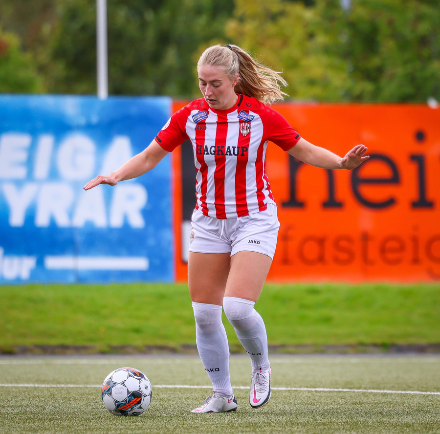 Freyja Karín strax komin í boltann. Hún kemur á mikilli ferð og á svo sendingu út í teiginn á Murphy sem á skot en Auður ver.