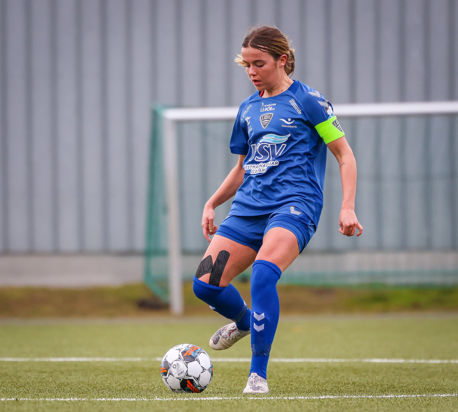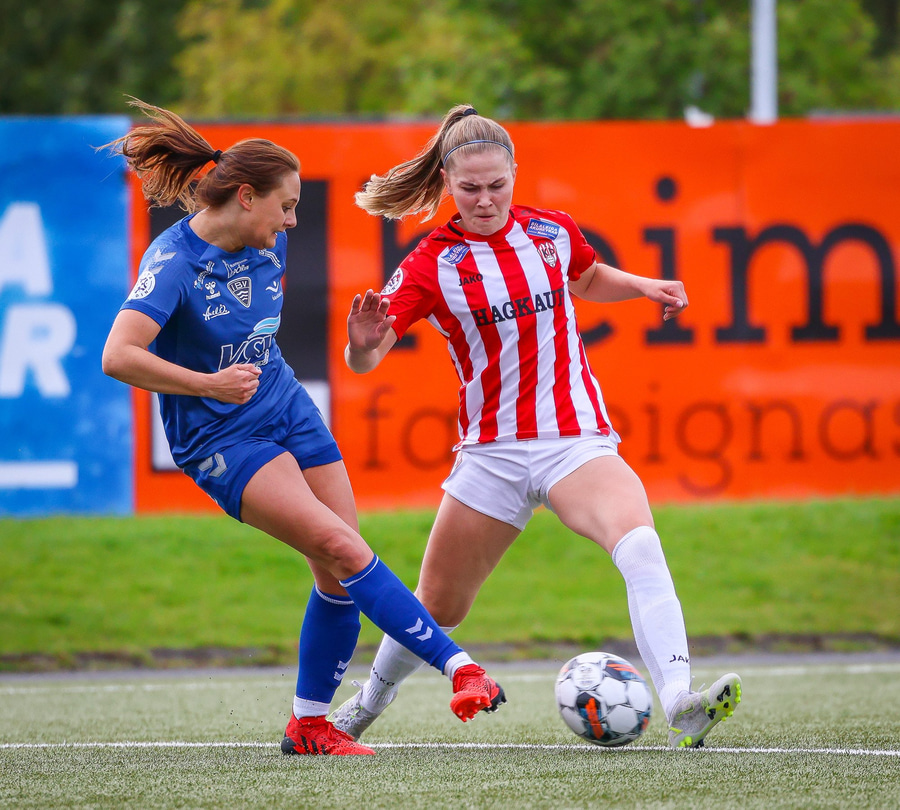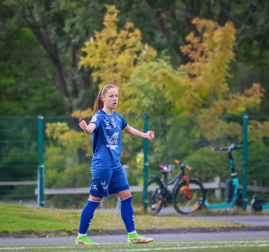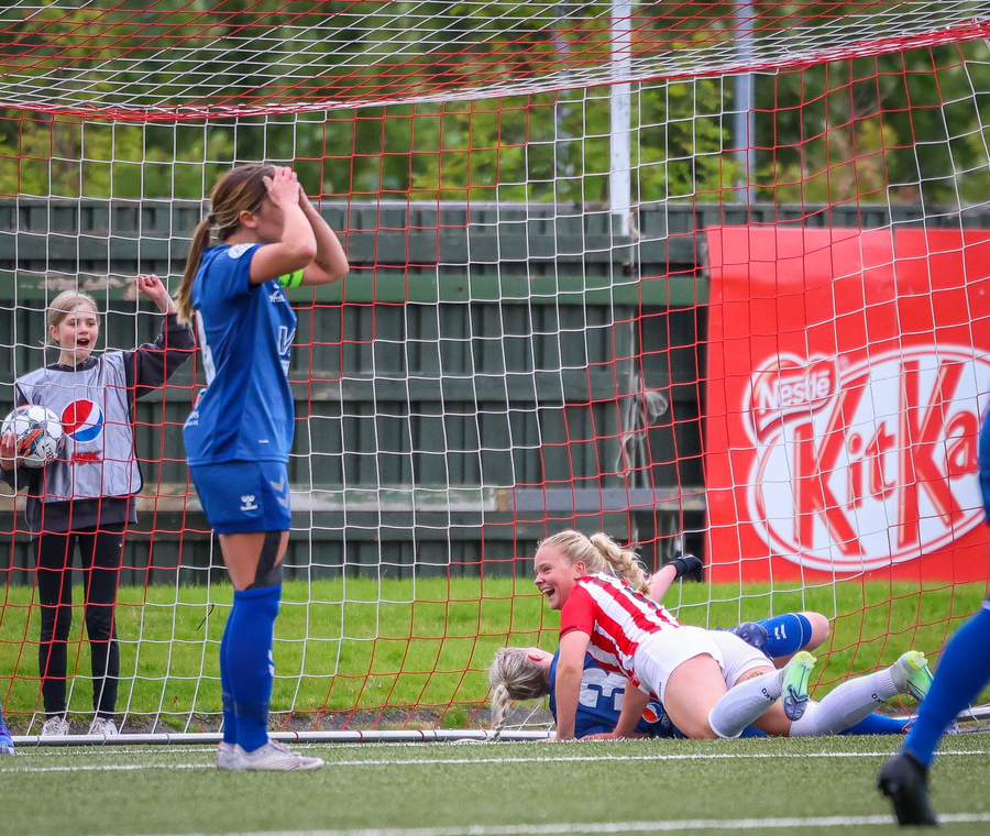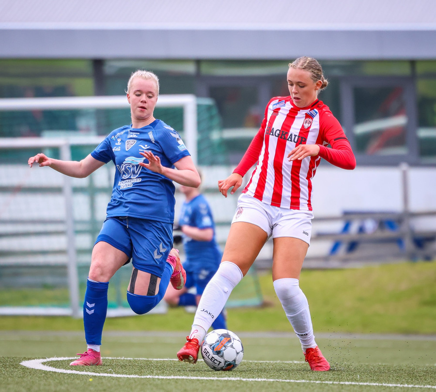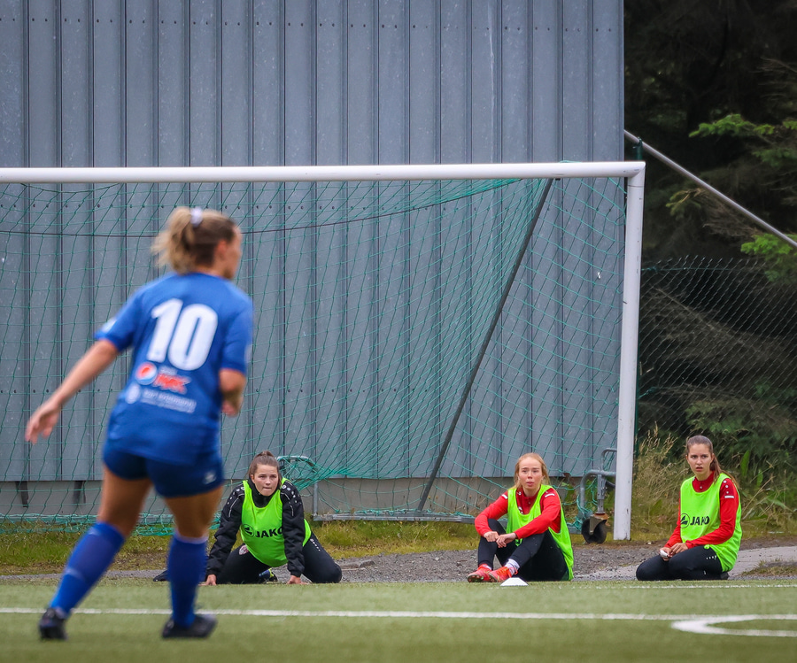 Ólöf Sigríður enn eina ferðina. ÞÆR RÁÐA EKKERT VIÐ HANA! Hún fær boltann, hristir varnarmann af sér og á skot sem fer í stöngina. Boltinn fer svo í bakið á Auði og kemur Freyja á ferðinni og kemur boltanum yfir línuna. Smá heppnisstimpill yfir þessu.