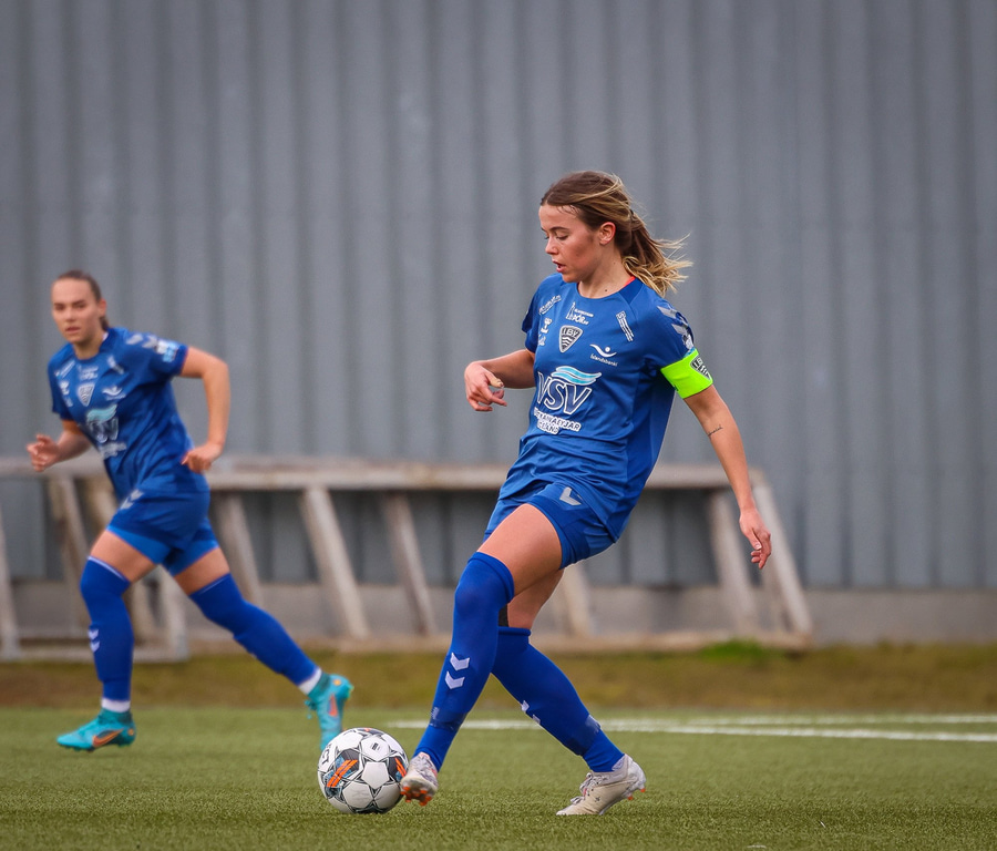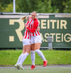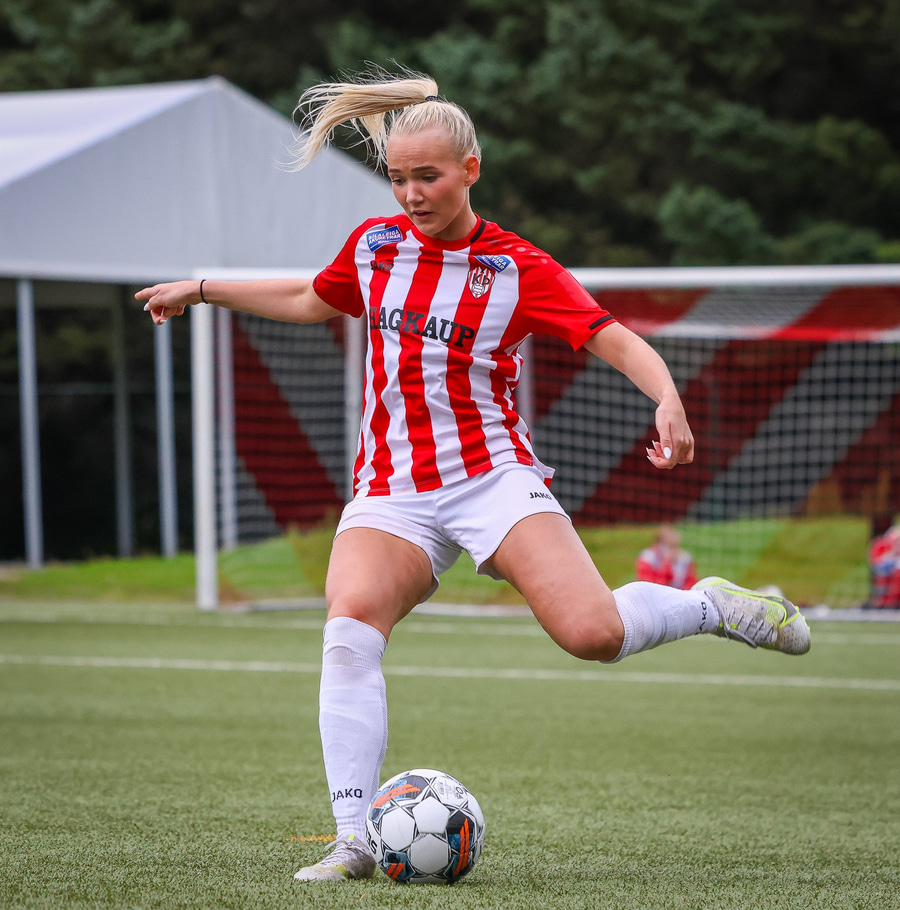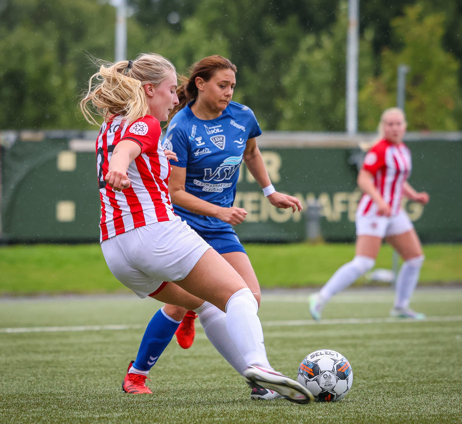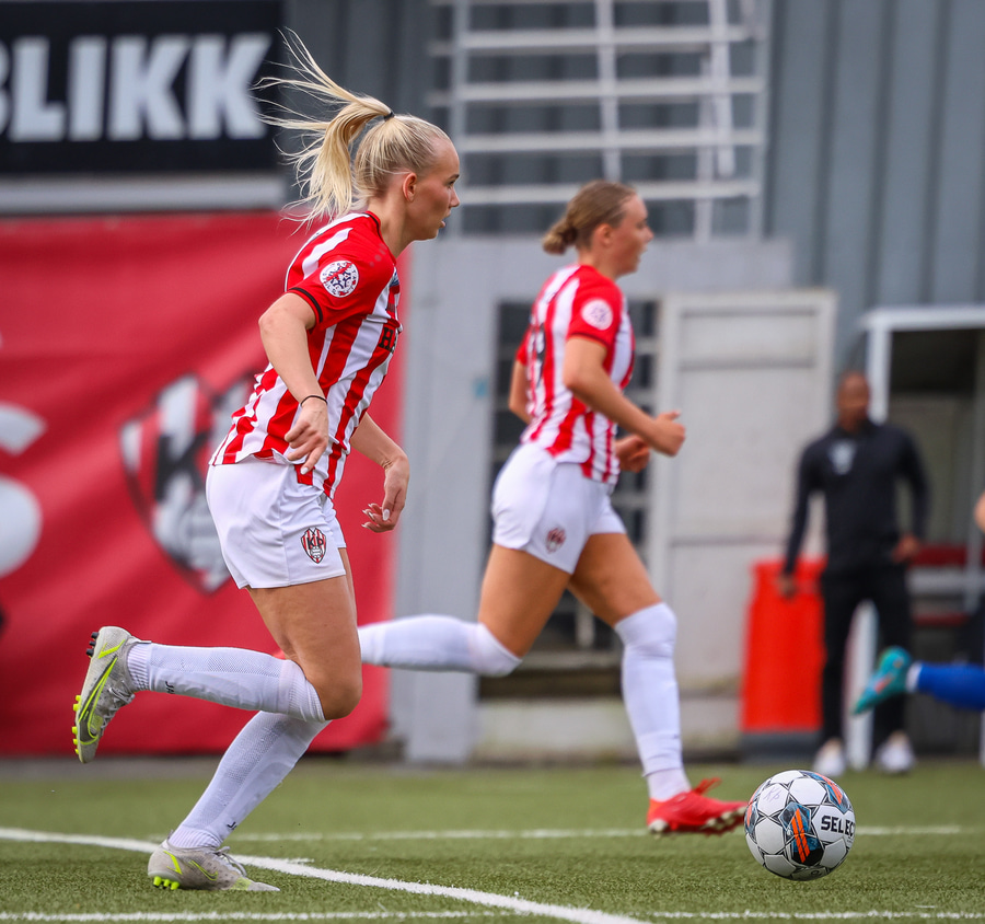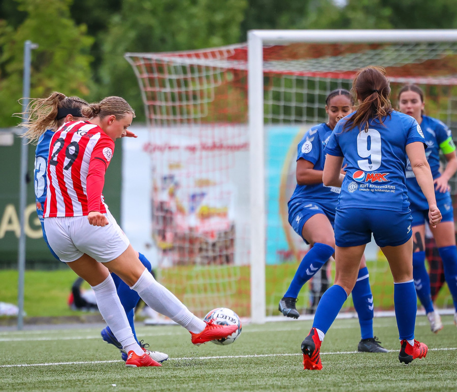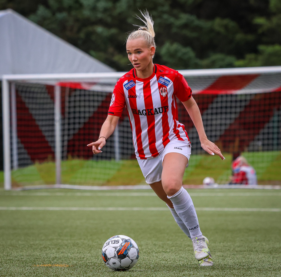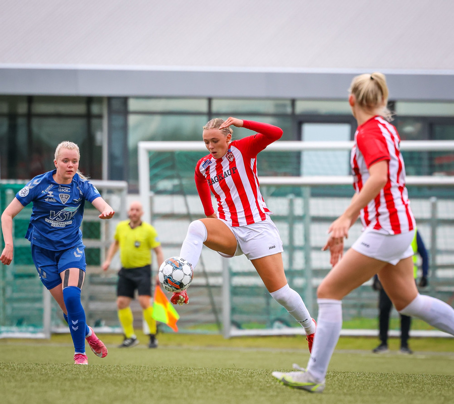 Ólöf Sigríður enn eina ferðina. ÞÆR RÁÐA EKKERT VIÐ HANA! Hún fær boltann, hristir varnarmann af sér og á skot sem fer í stöngina. Boltinn fer svo í bakið á Auði og kemur Freyja á ferðinni og kemur boltanum yfir línuna. Smá heppnisstimpill yfir þessu.