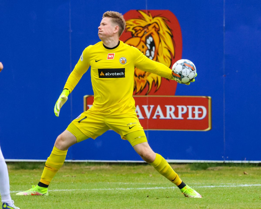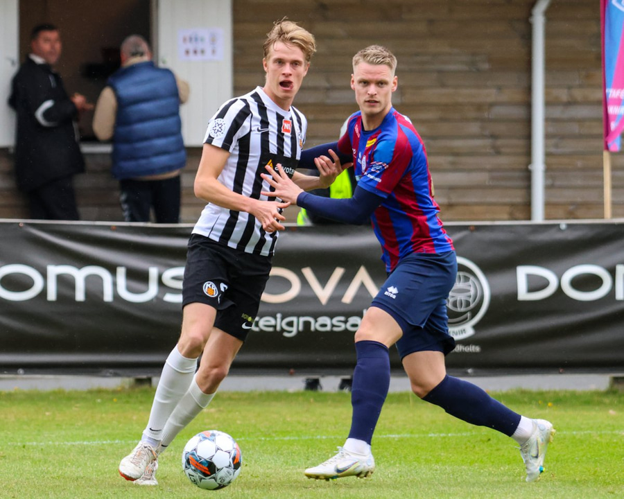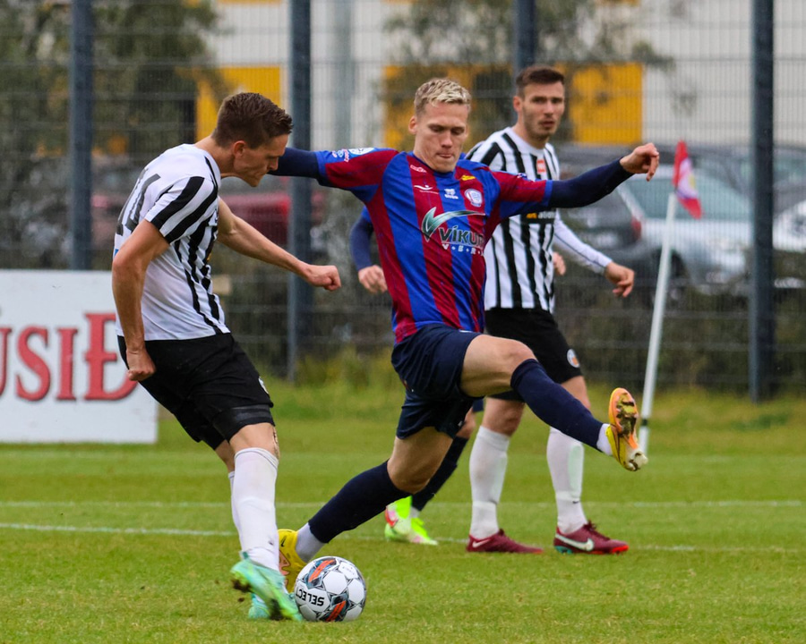 Kjartan neglir boltanum niðri í vinstra hornið, Viktor á ekki séns.