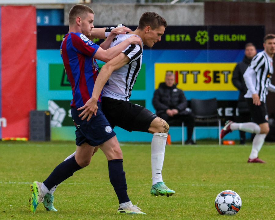 Adam Örn á frábæra stungusendingu á Zean Dalügge, Aron Kristófer reynir að renna sér fyrir sendinguna en nær boltanum ekki og þá er Zean kominn í einn á einn stöðu við Beiti og hamrar boltann í þaknetið!