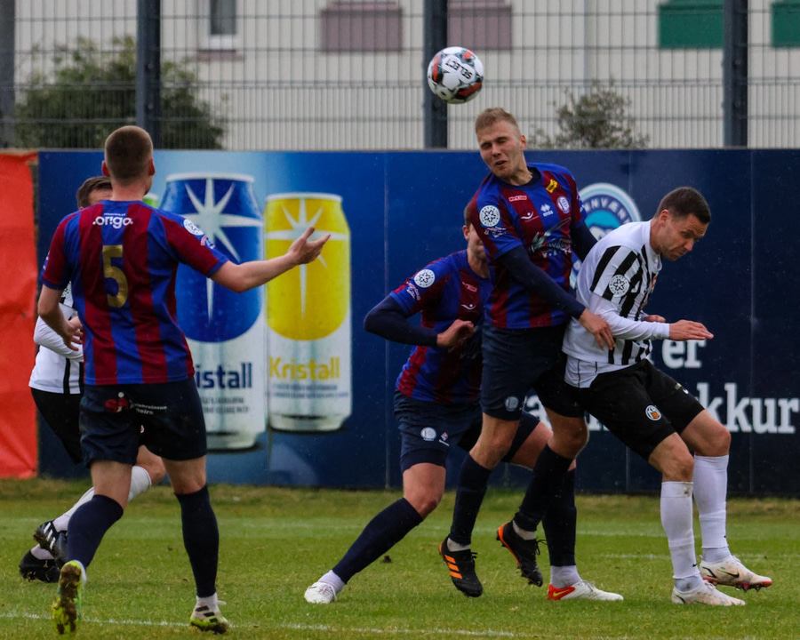 Kristófer Konráðs tekur spyrnuna fyrir leikni, hún kemur á fjærstöng þar sem Zean tekur boltann á magann og missir boltann frá sér.