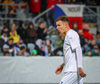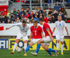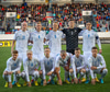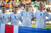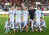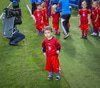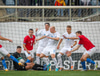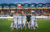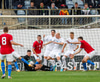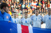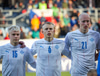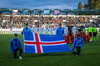 Liðin ganga út á völlinn. Íslenska liðið í hvítum treyjum, hvítum stuttbuxum og hvítum sokkum.
