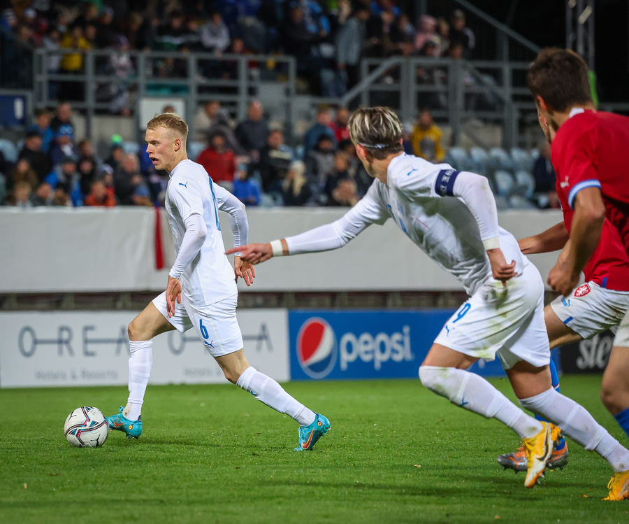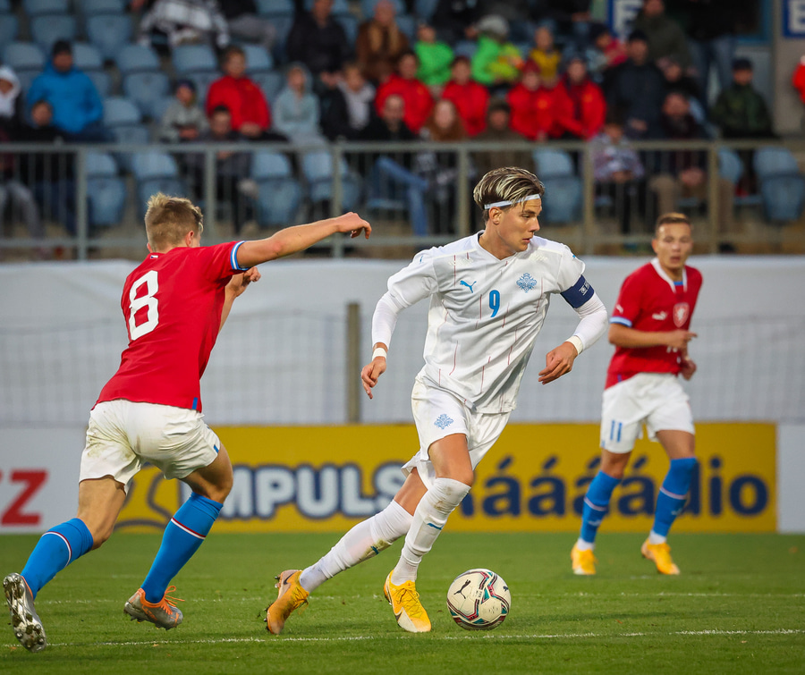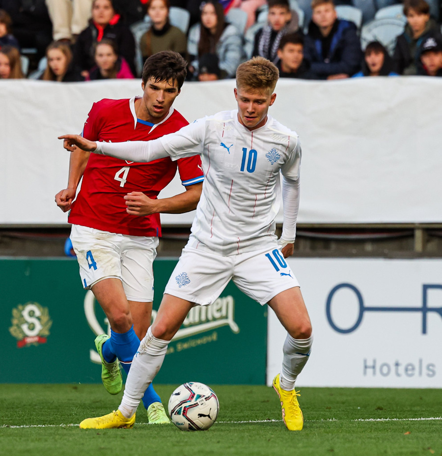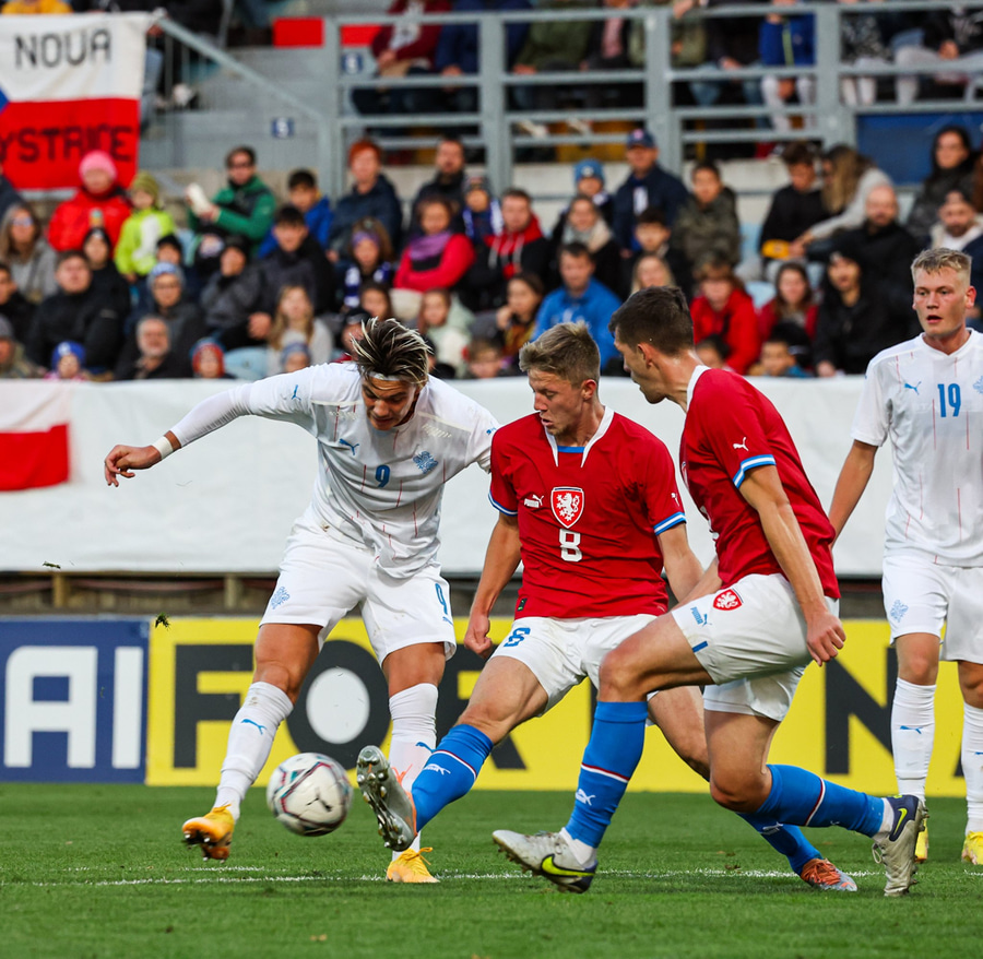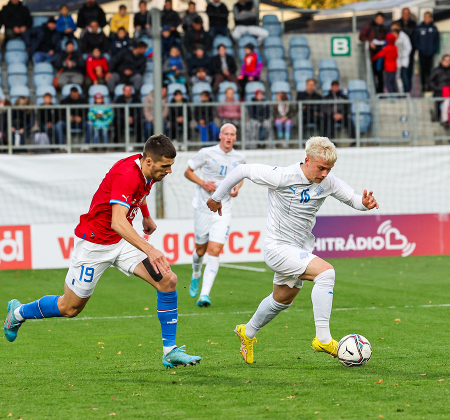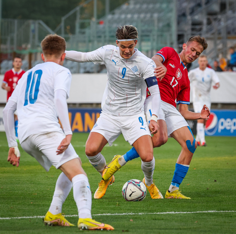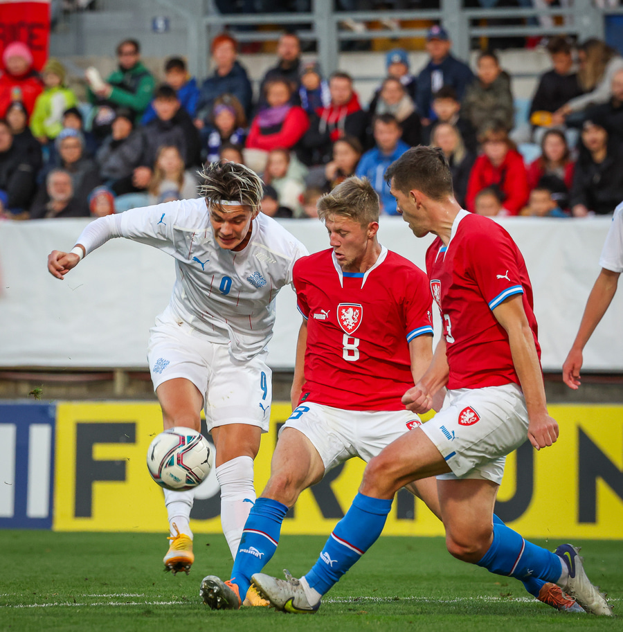 Kristian Nökkvi reynir hælspyrnu í teignum en nær ekki að finna samherja. Ísland að spila vel en er ekki að ná að opna tékkneska liðið.