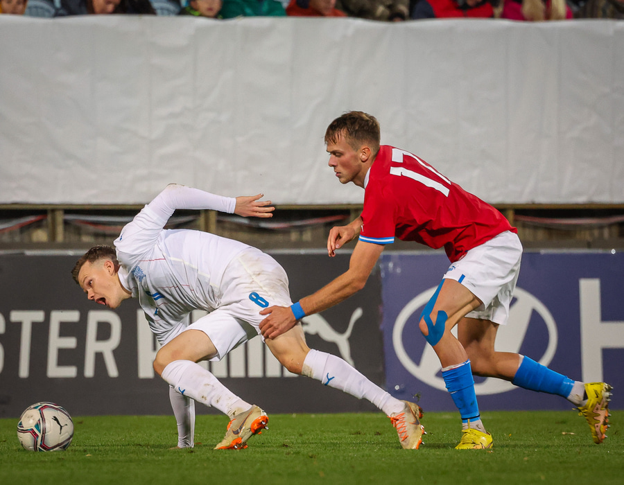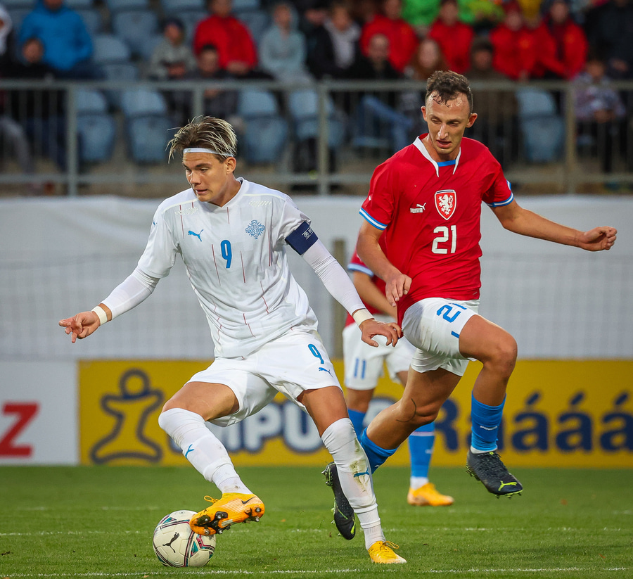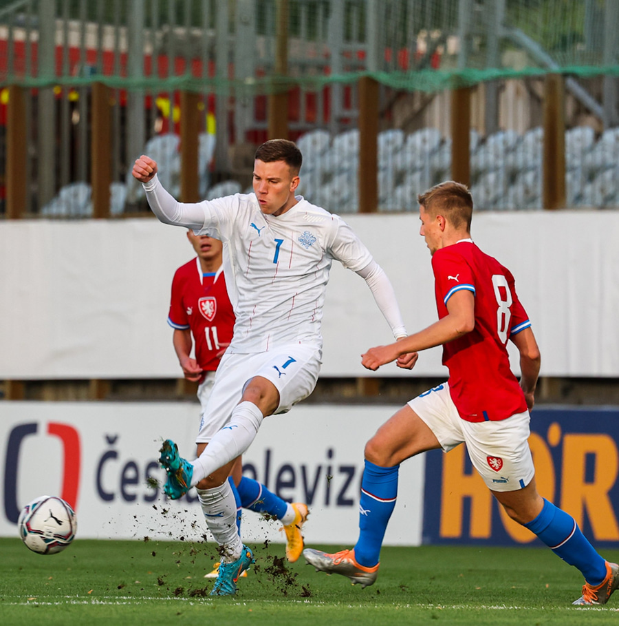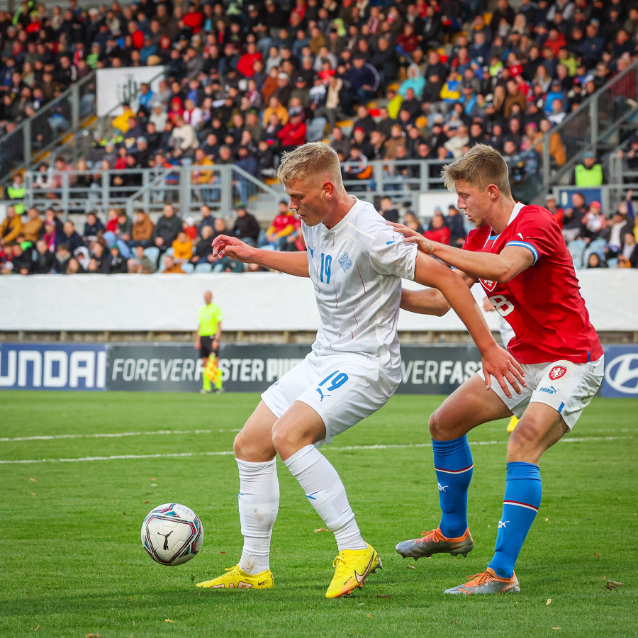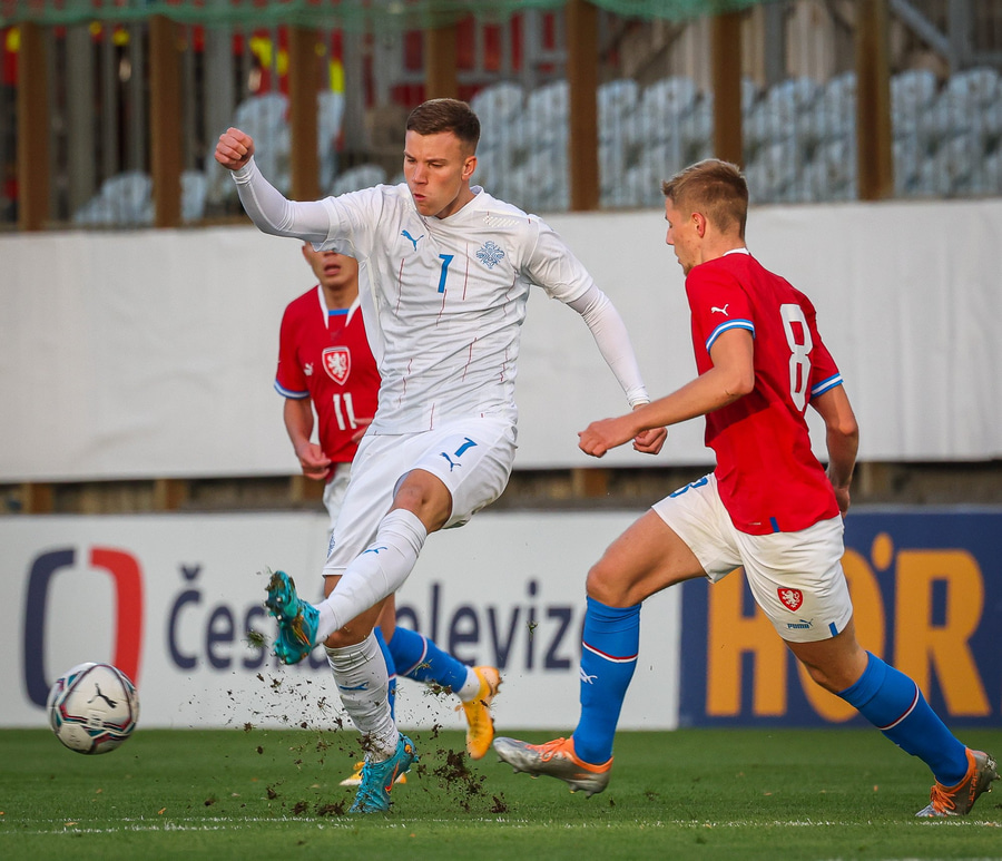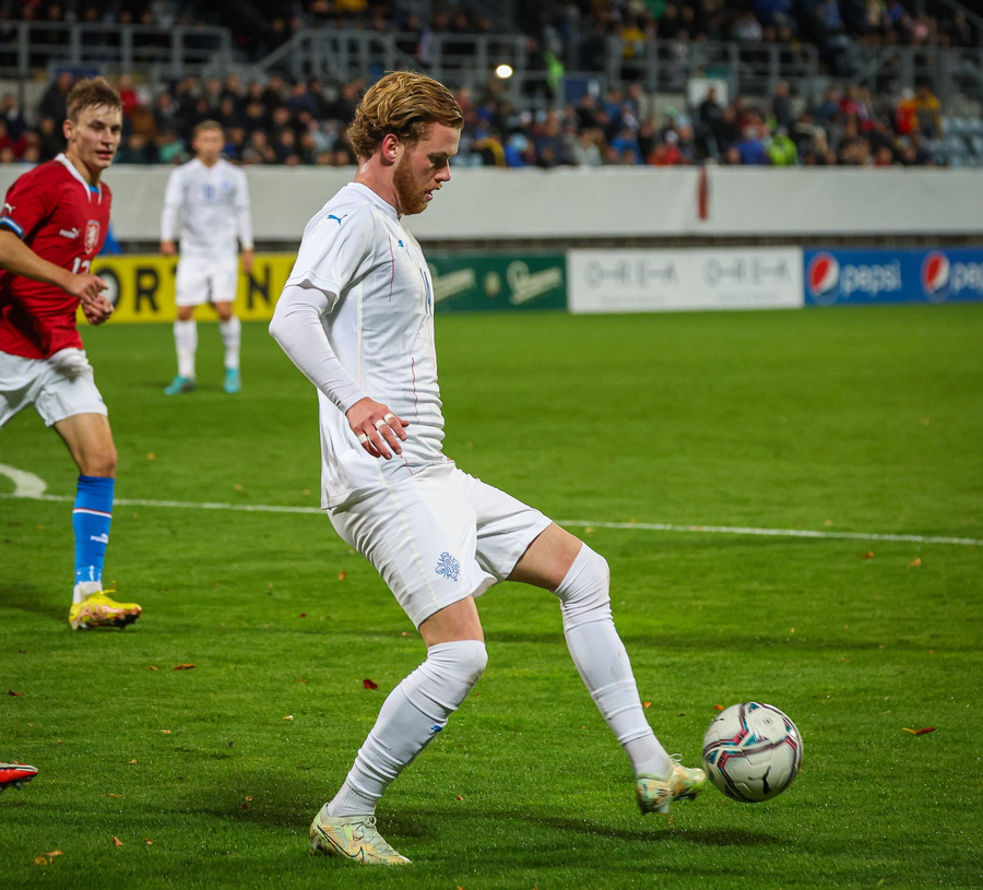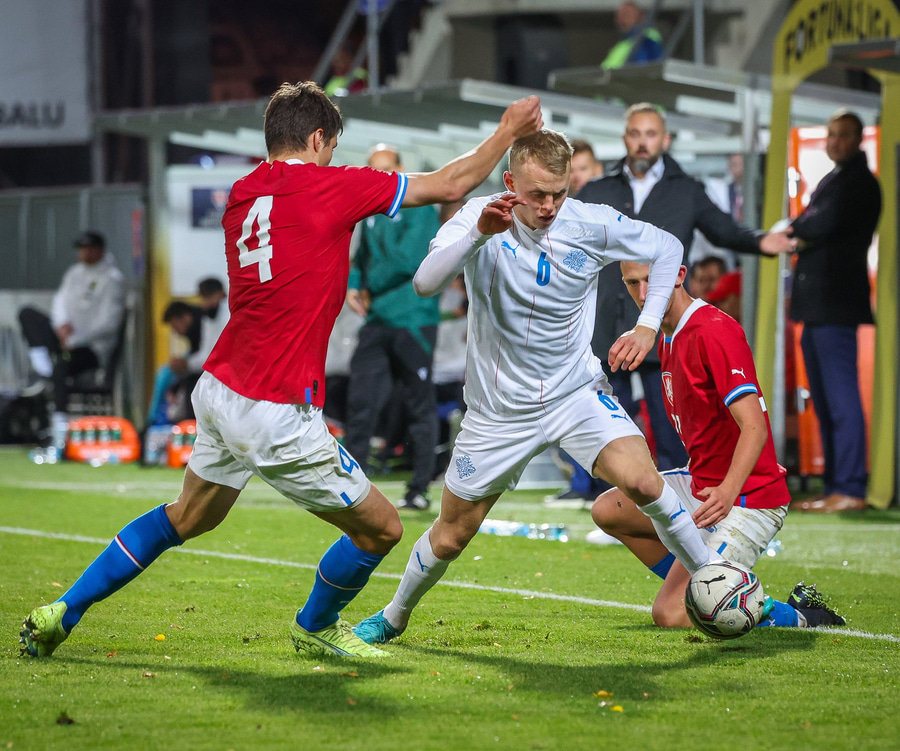 Kristian Nökkvi reynir hælspyrnu í teignum en nær ekki að finna samherja. Ísland að spila vel en er ekki að ná að opna tékkneska liðið.