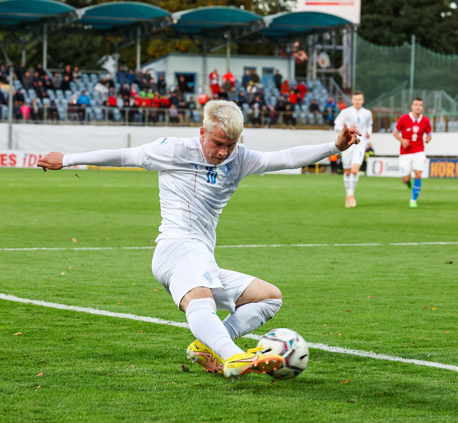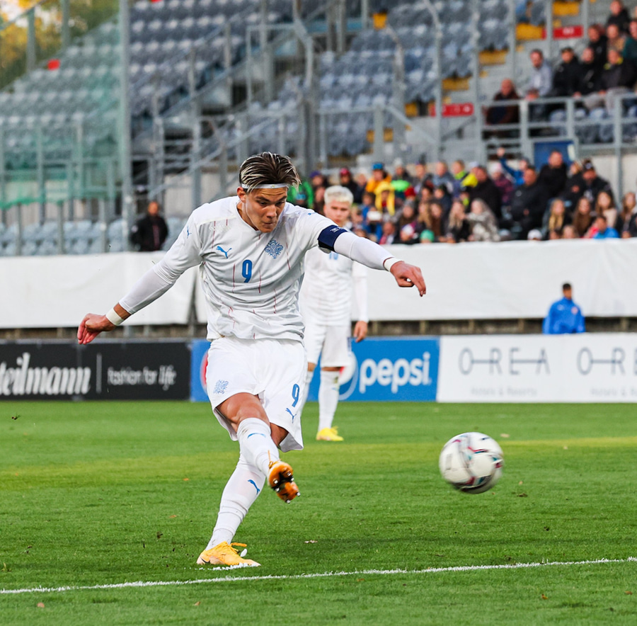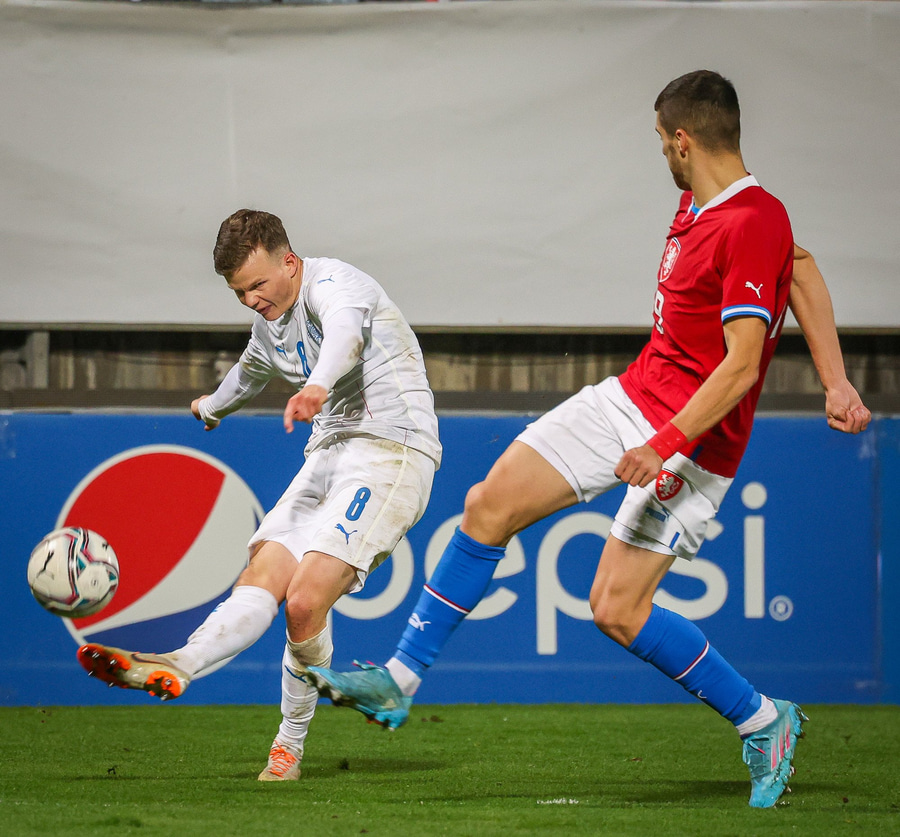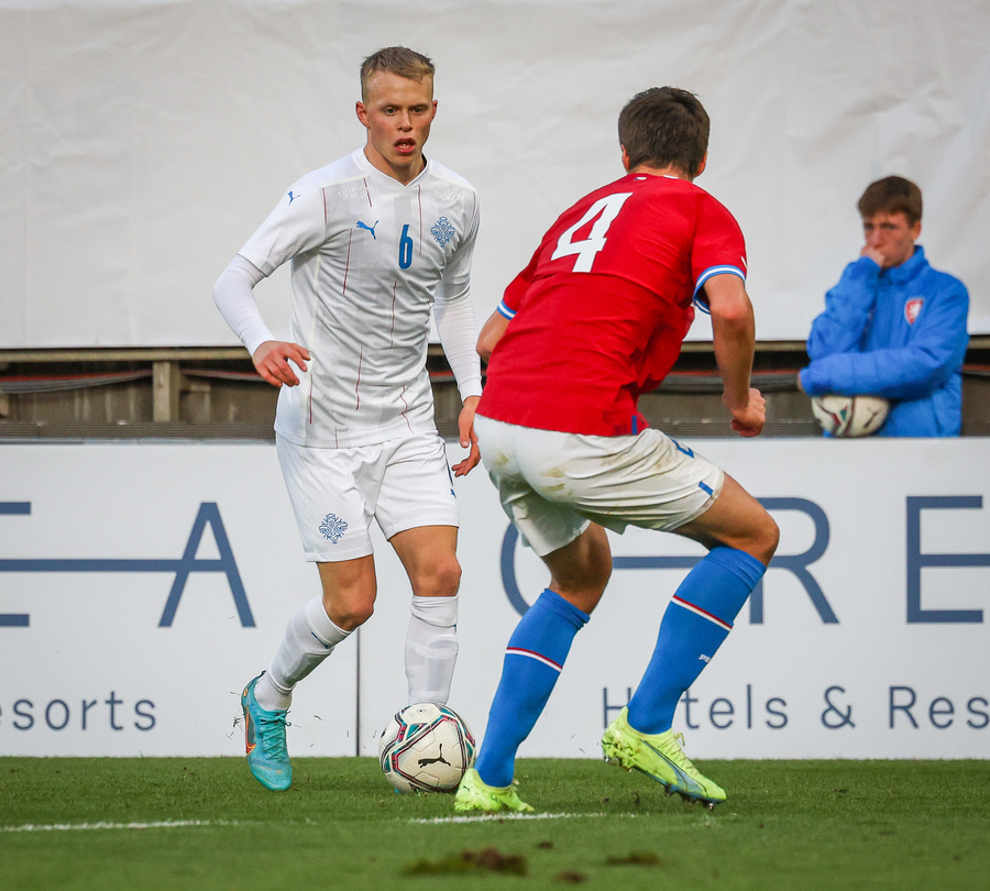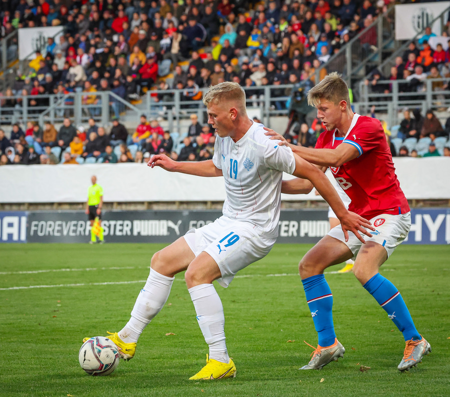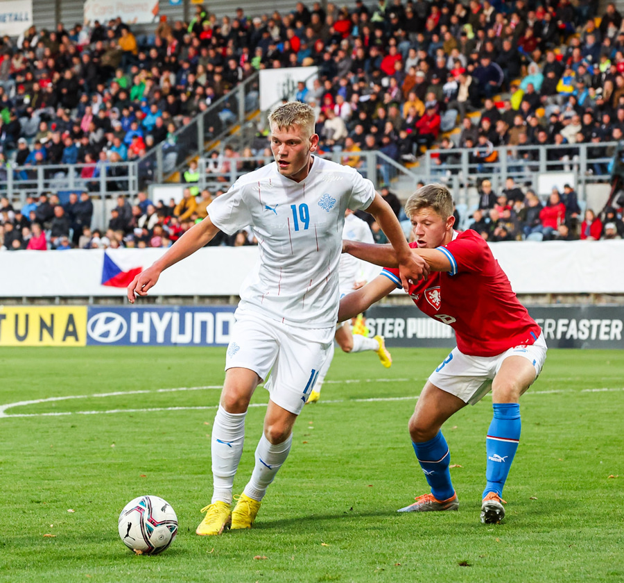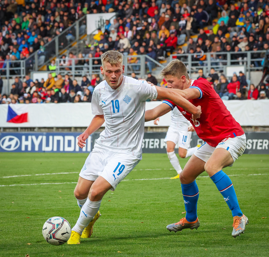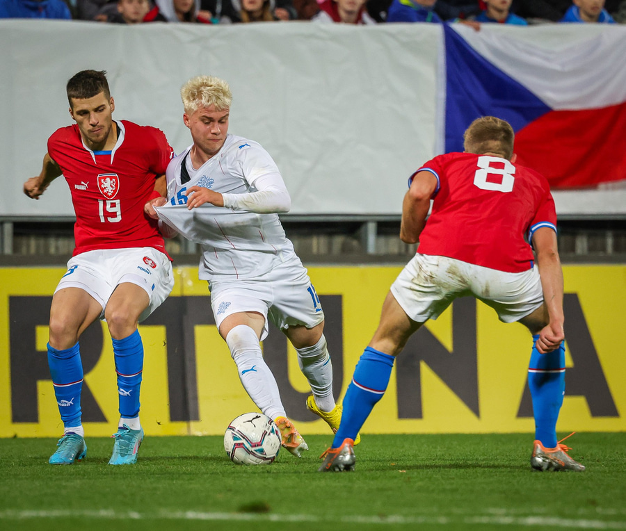 Kristian Nökkvi reynir hælspyrnu í teignum en nær ekki að finna samherja. Ísland að spila vel en er ekki að ná að opna tékkneska liðið.