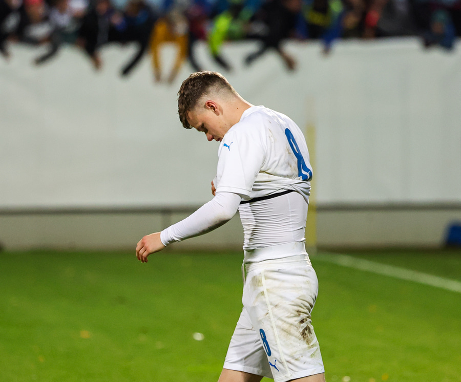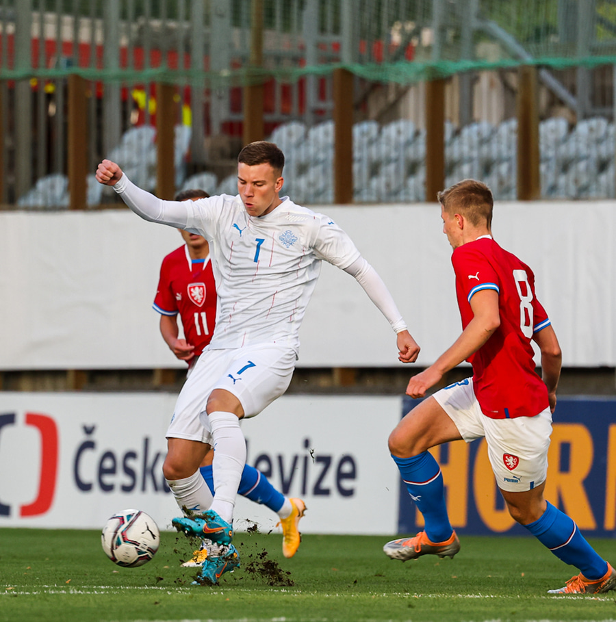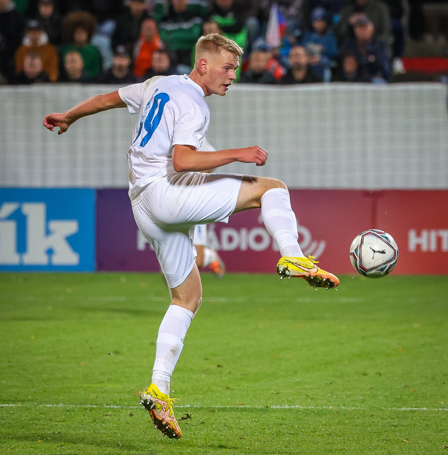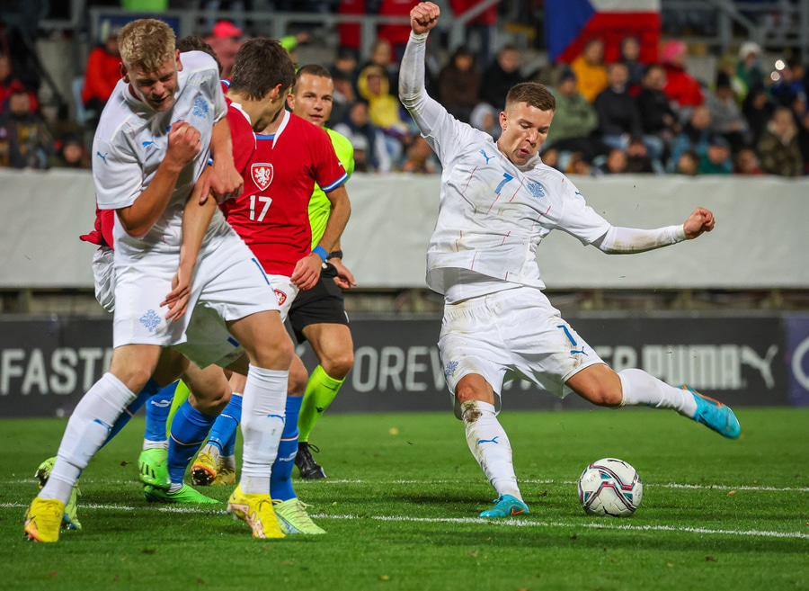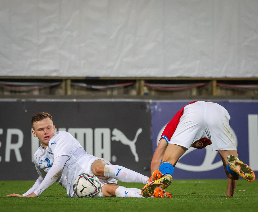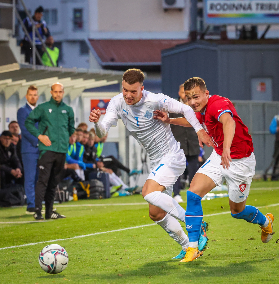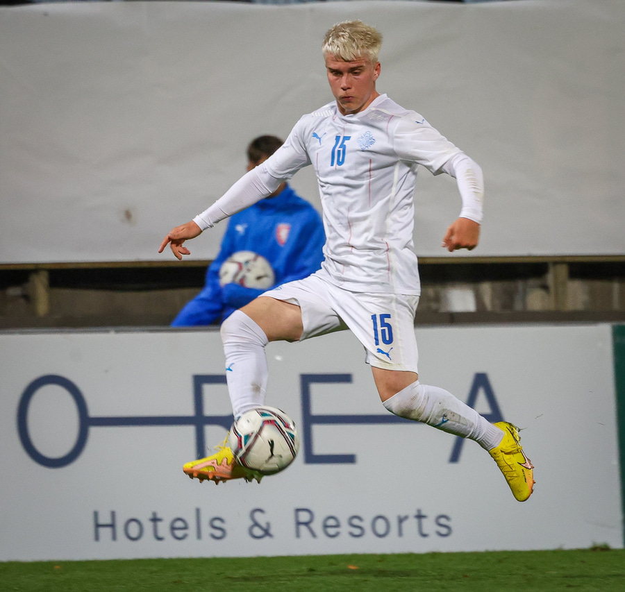 Kristian Nökkvi reynir hælspyrnu í teignum en nær ekki að finna samherja. Ísland að spila vel en er ekki að ná að opna tékkneska liðið.