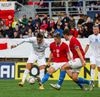 Brynjólfur tekur spyrnuna. Þetta er samt ákjósanlegri staður fyrir örvfættan spyrnumann. Leikmaður Tékka kemur út úr veggnum og kemst fyrir.