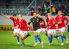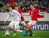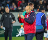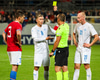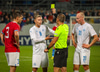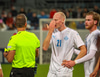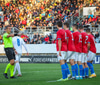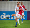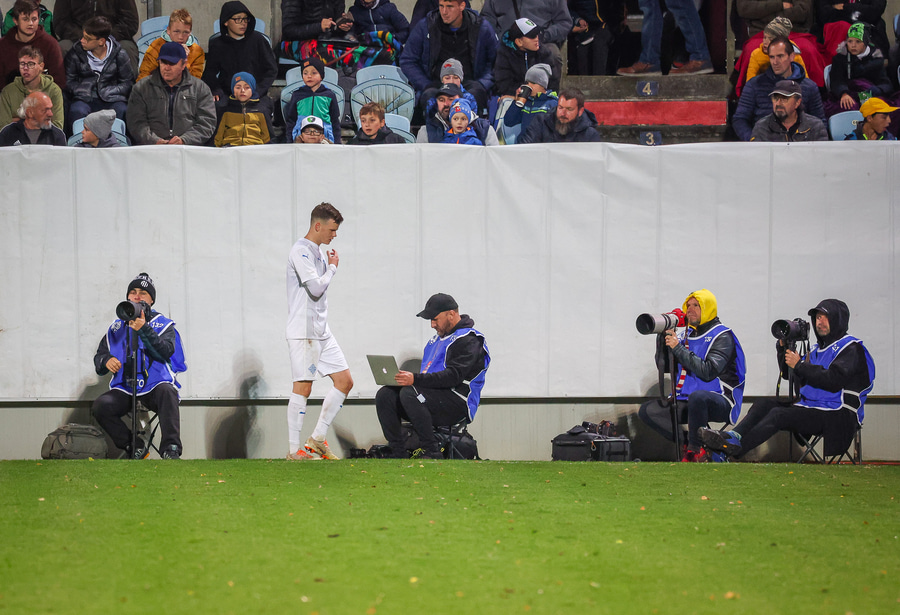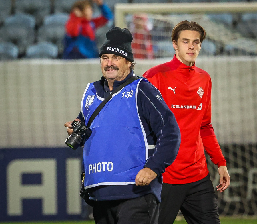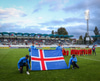 Liðin voru að ljúka upphitun. Vallarþulurinn búinn að kynna liðin. Hann fær 8,5 fyrir framburðinn á íslensku nöfnunum. Líklega æft sig heima.