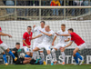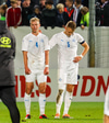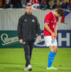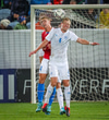 NÆSTUM!!!!! Óli Valur með fyrirgjöf. Orri í hörkutækifæri og skallar framhjá. Þurfti aðeins að teygja sig í boltann. Tékknesku fjölmiðlamennirnir hérna í kringum mig eru farnir að ókyrrast!!!