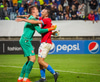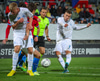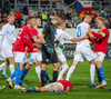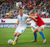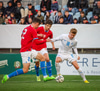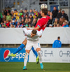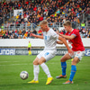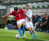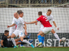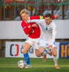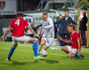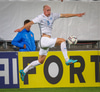 Brynjólfur Willumsson í hörkubaráttu og nær að vinna hornspyrnu. Fyrsta horn Íslands.