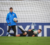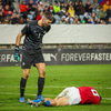 Hákon við það að handsama boltann eftir hornpyrnuna en er keyrður af krafti niður. Réttilega dæmd aukaspyrna.