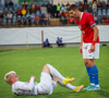 Leikurinn var stopp í smá tóma eftir að menn skullu saman. Ísak Óli lá eftir hjá okkur en báðir leikmenn halda áfram leik.