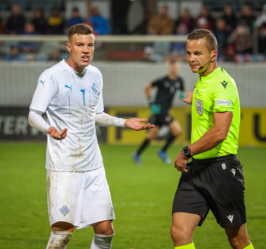 Andri Fannar tók hornspyrnuna en danski dómarinn fljótur að flauta sóknarbrot. Sá ekki hvað átti sér stað þarna en treysti þeim danska til að vera með þetta hárrétt.