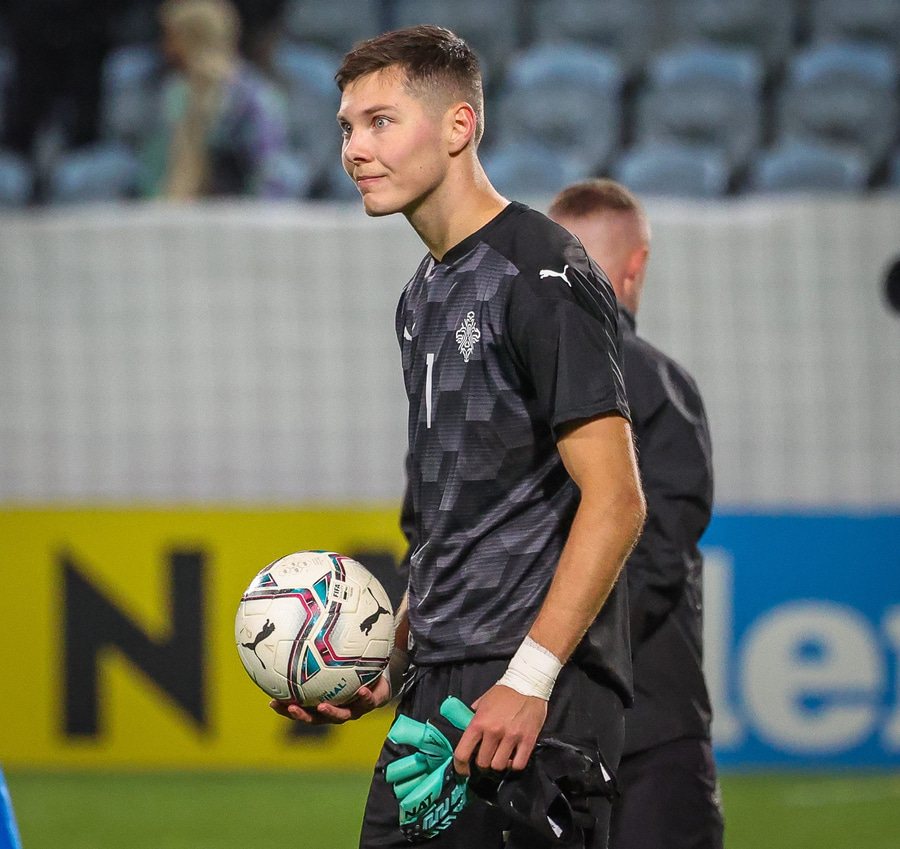 Václav Sejk kemur sér í hættulega skotstöðu og lætur vaða. Boltinn dempast af Róberti Orra og endar í höndum Hákons.
